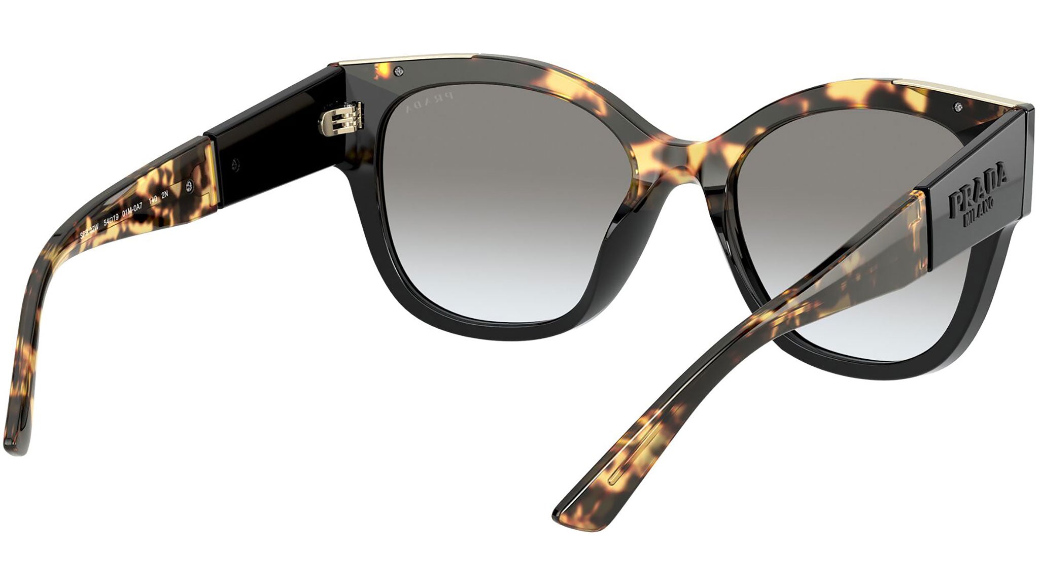 Prada sunglasses model PR02WS, black and medium havana frame variant, color code 01M0A7 with grey gradient lens. Prada represents the best of Italian culture and tradition. It is one of the most innovative, prestigious and widely recognized brands in the fashion and luxury goods industries, with a keen attention to details and new trends.