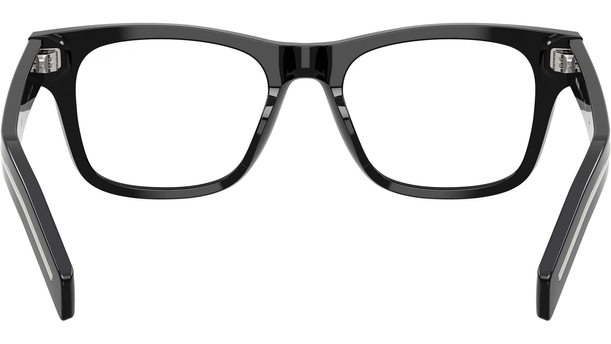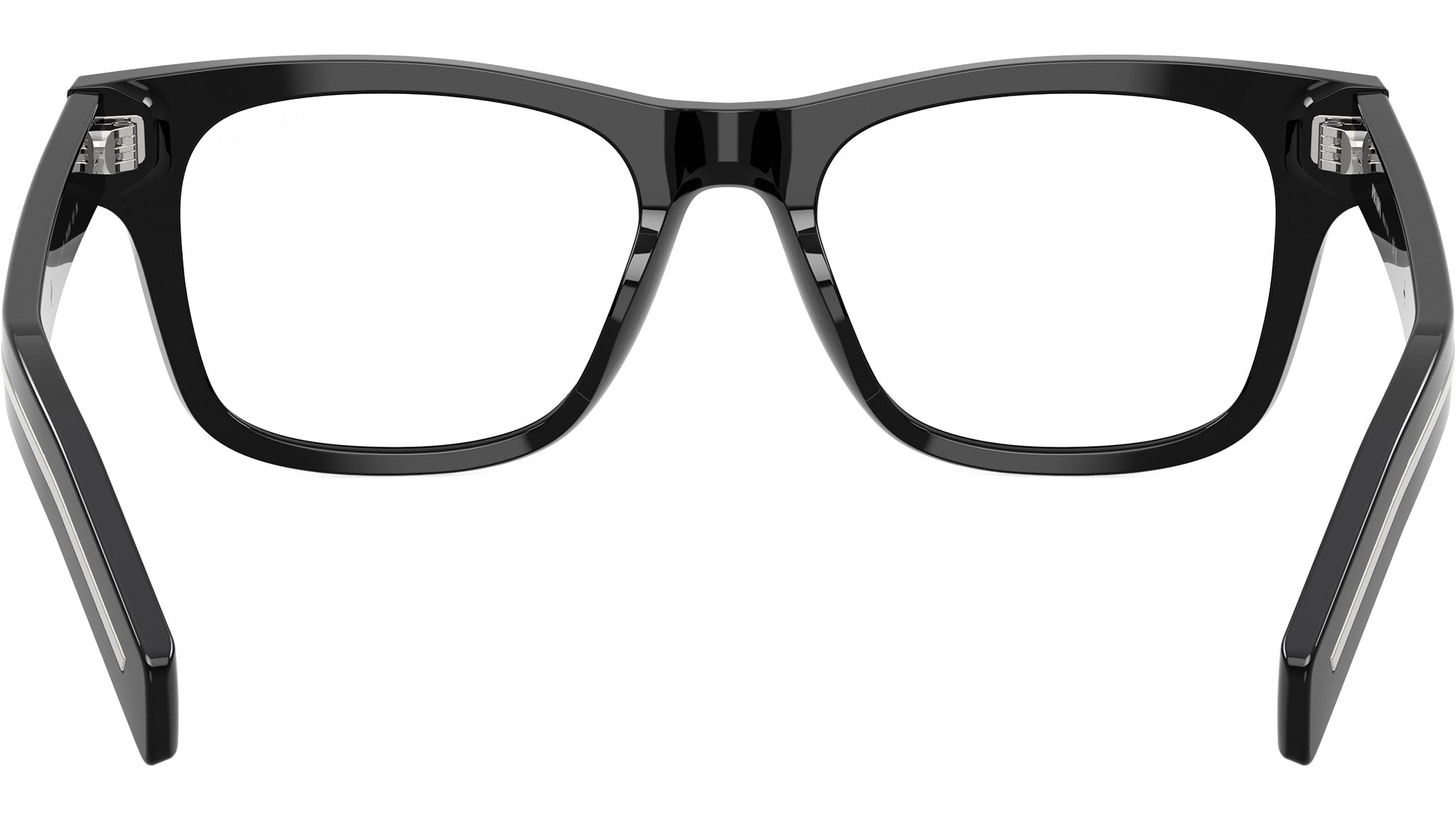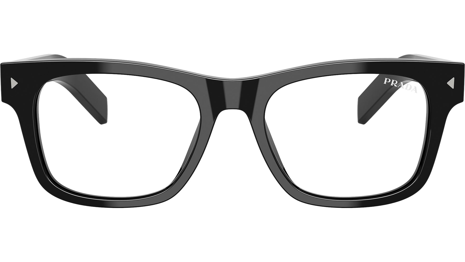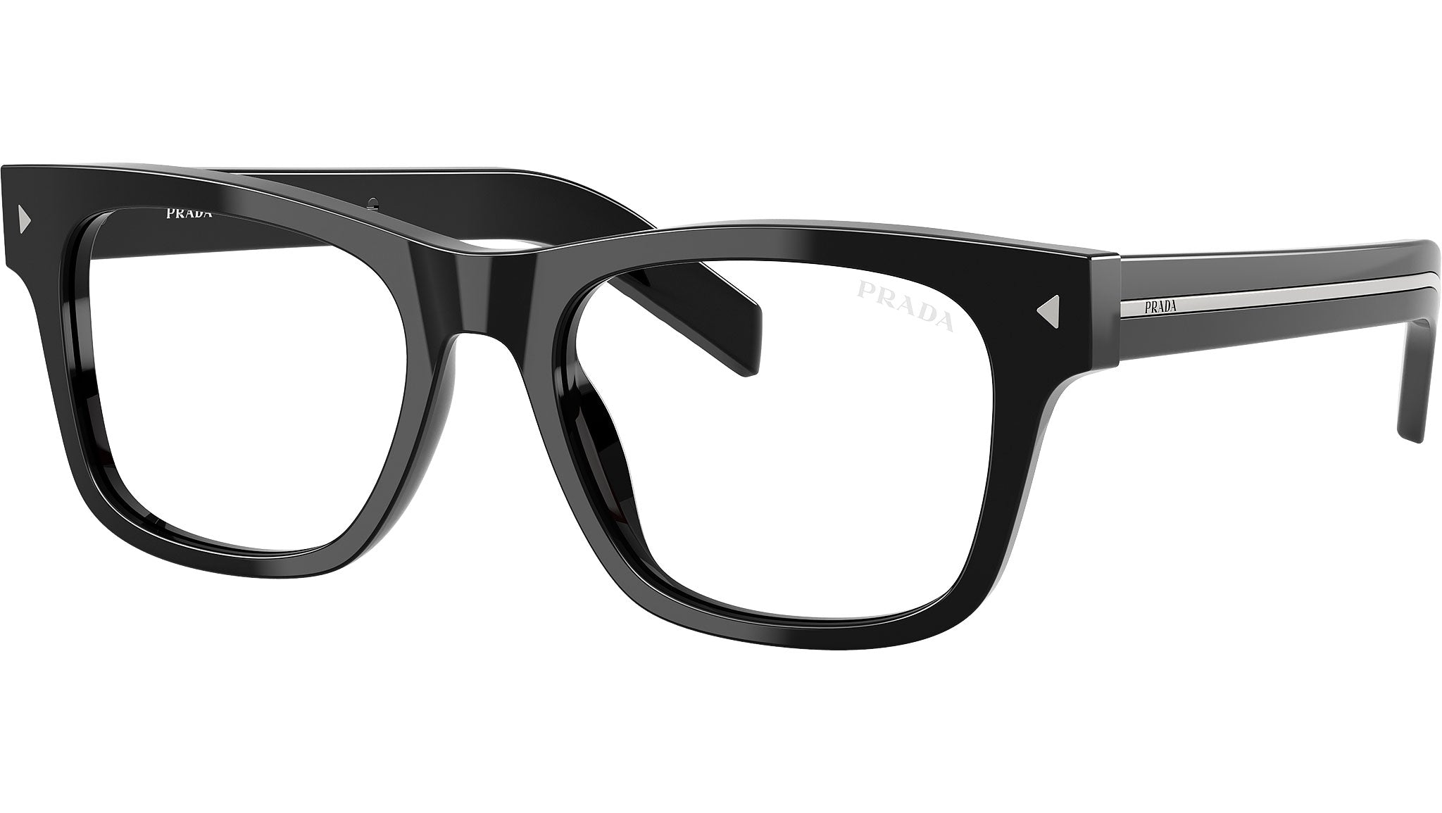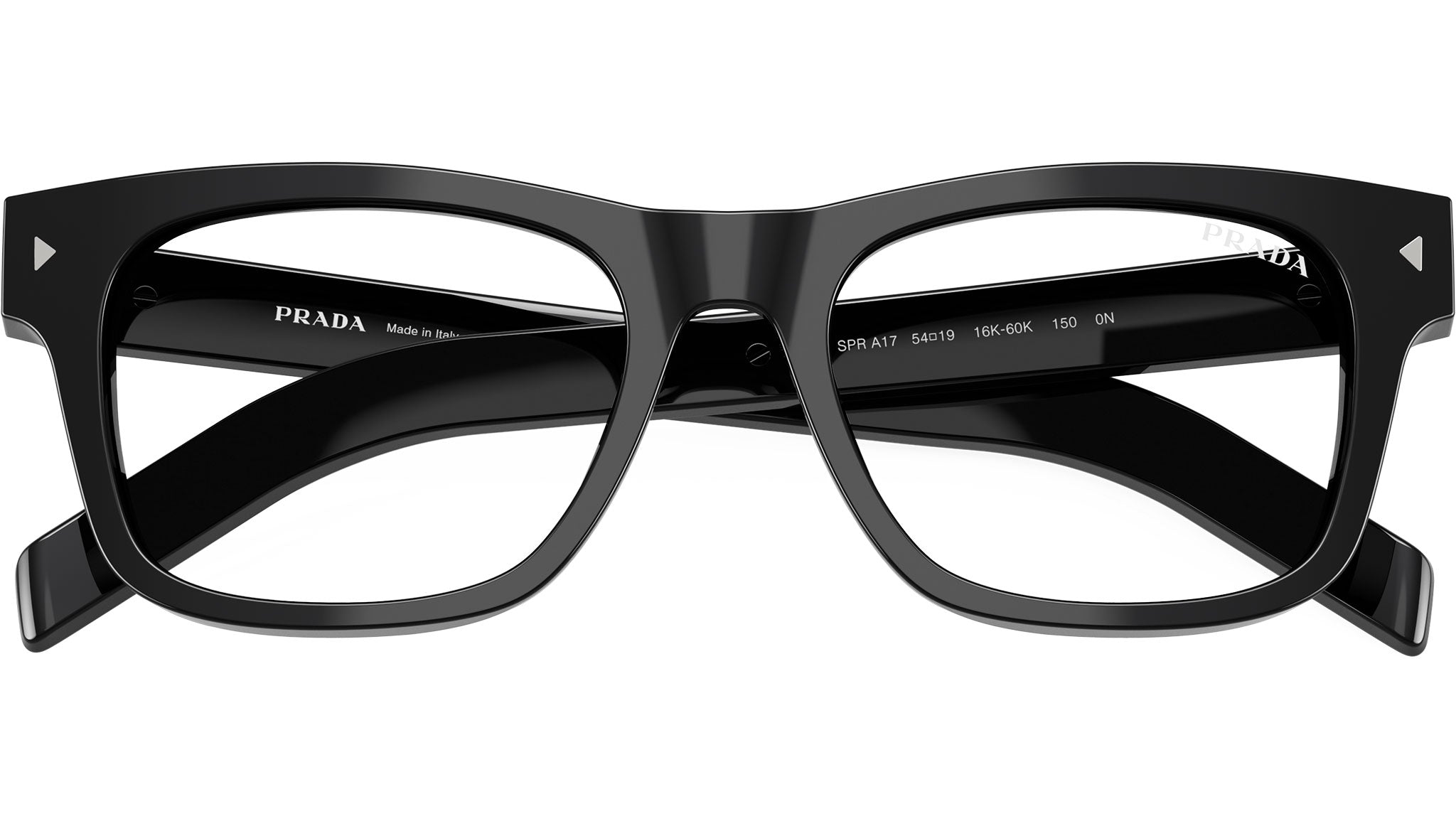 Prada PR A17S 16K60K sunglasses for men, featuring black rectangular acetate frame and clear blue-violet light filter glass lenses. High bridge fit. Brand line: Signature. Style code: PRA17S. Color code: 16K60K. Made in Italy. Authorized Prada online reseller. Your glasses will include the original case and accessories and are covered by a 12-month global warranty.