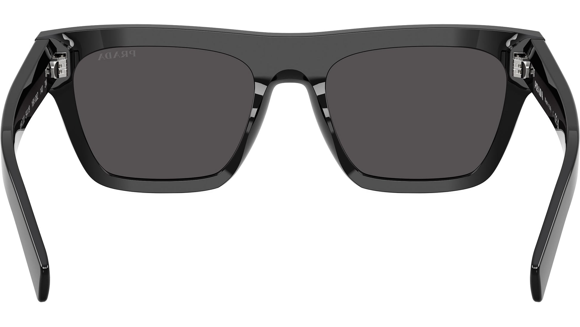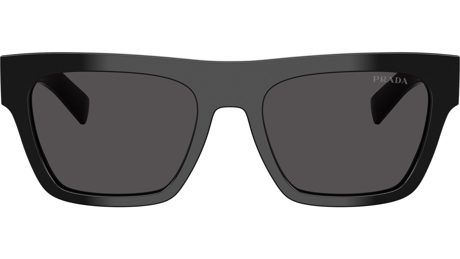 Prada PR C03S 16K08Z sunglasses for men, featuring black rectangular acetate frame and dark grey bio polyamide lenses. High bridge fit. Brand line: Essential. Style code: PRC03S. Color code: 16K08Z. Made in Italy. Authorized Prada online reseller. Your glasses will include the original case and accessories and are covered by a 12-month global warranty.