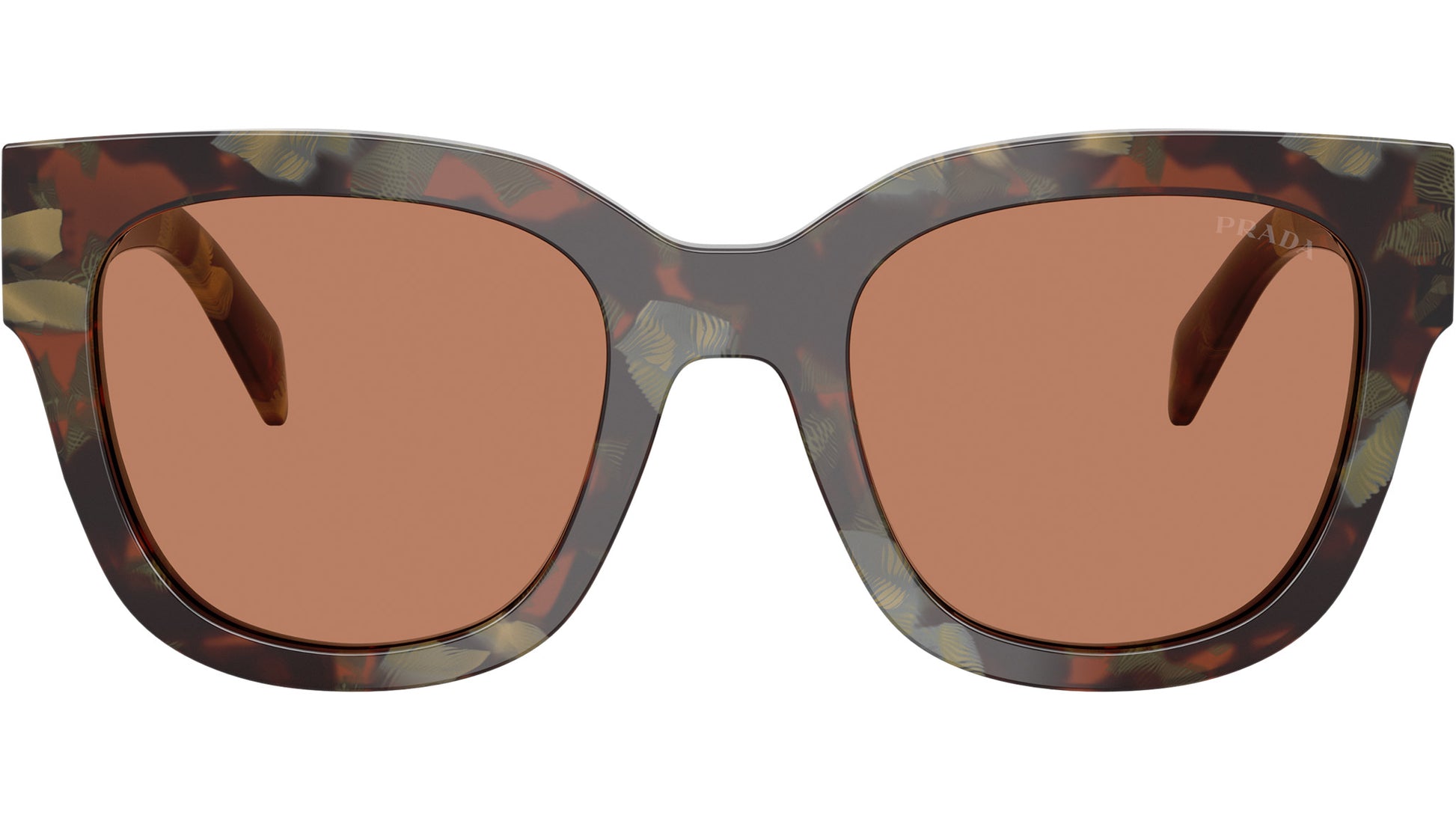 Prada PR C04S 22F90Q sunglasses for women, featuring woods tortoise squared acetate frame and brown bio polyamide lenses. High bridge fit. Brand line: Essential. Style code: PRC04S. Color code: 22F90Q. Made in Italy. Authorized Prada online reseller. Your glasses will include the original case and accessories and are covered by a 12-month global warranty.