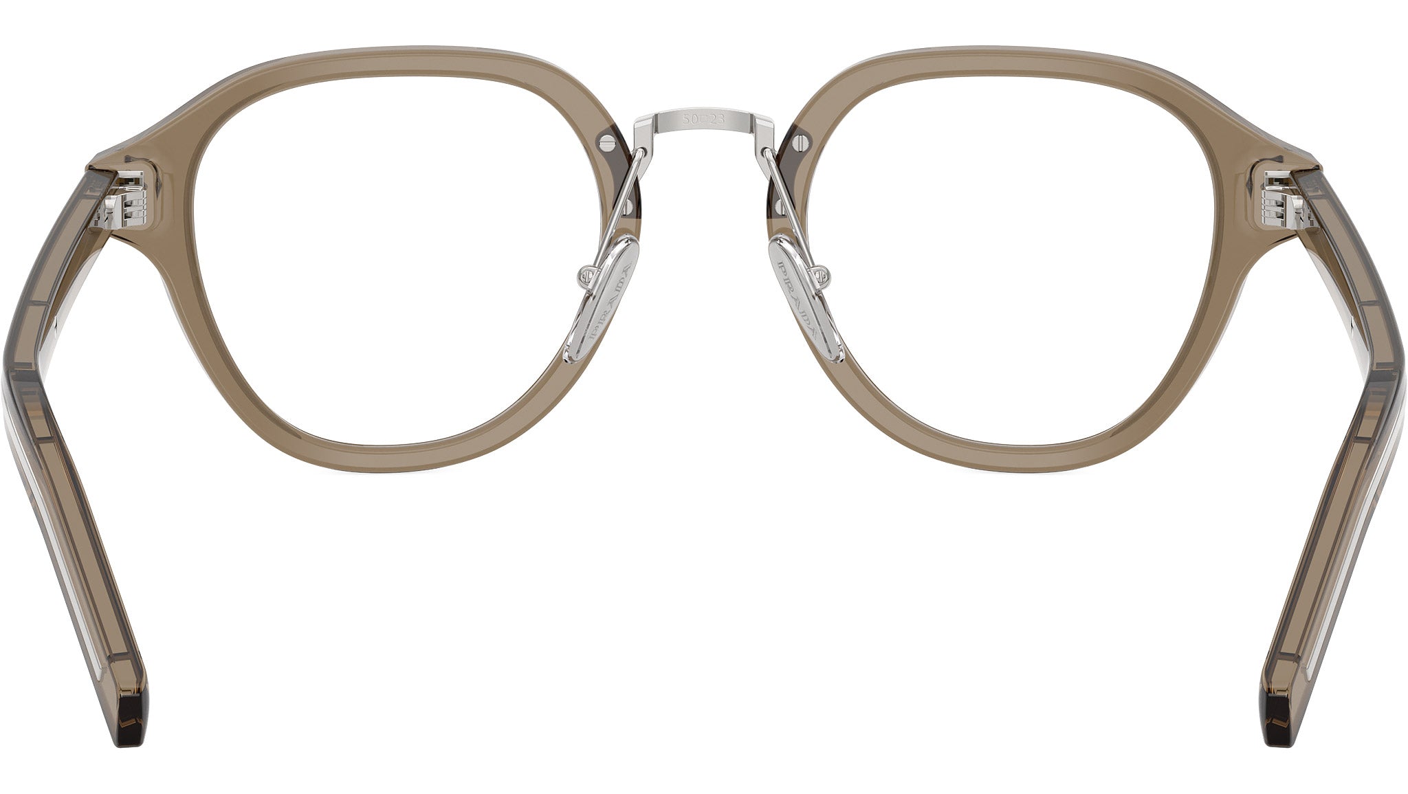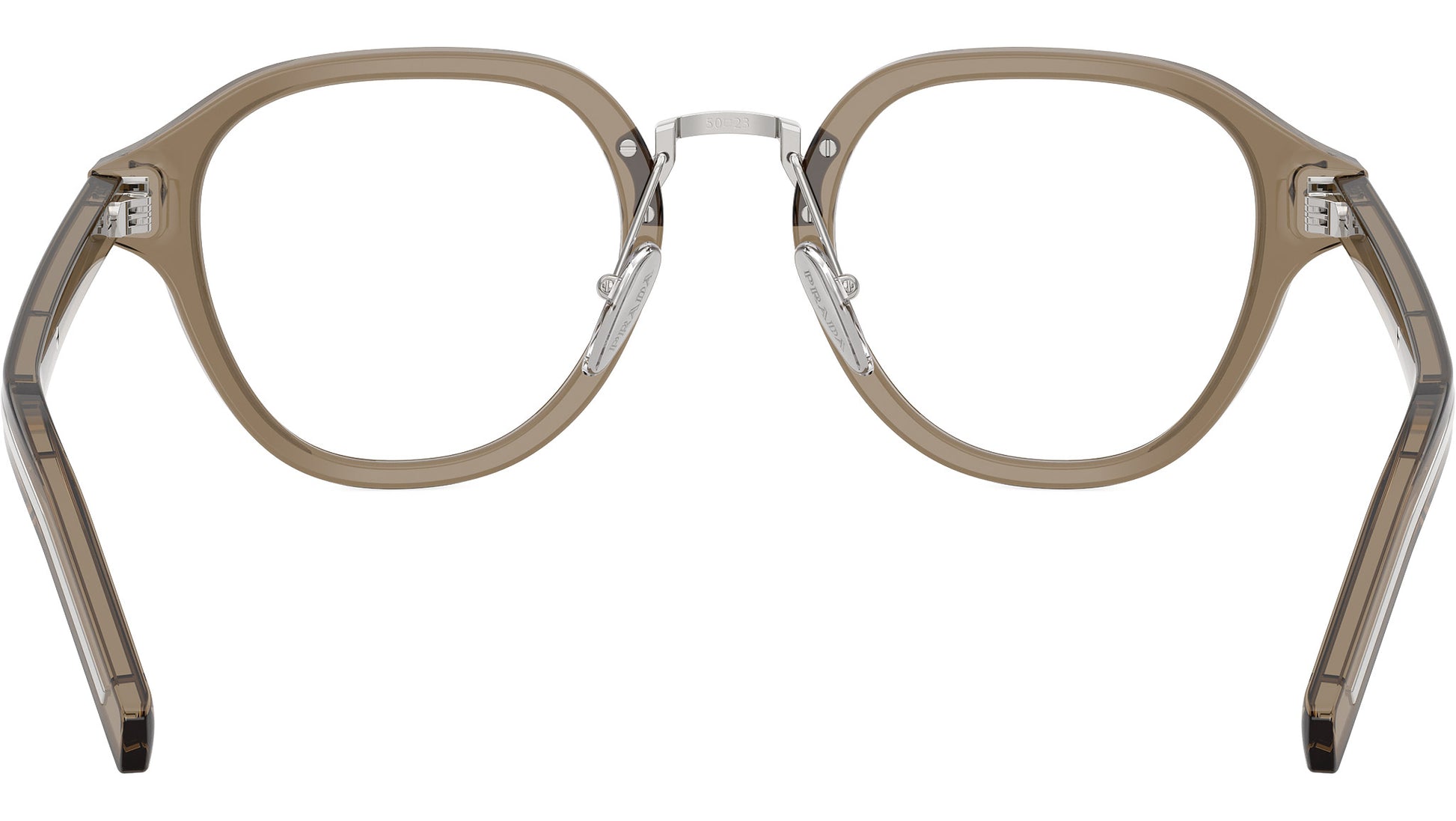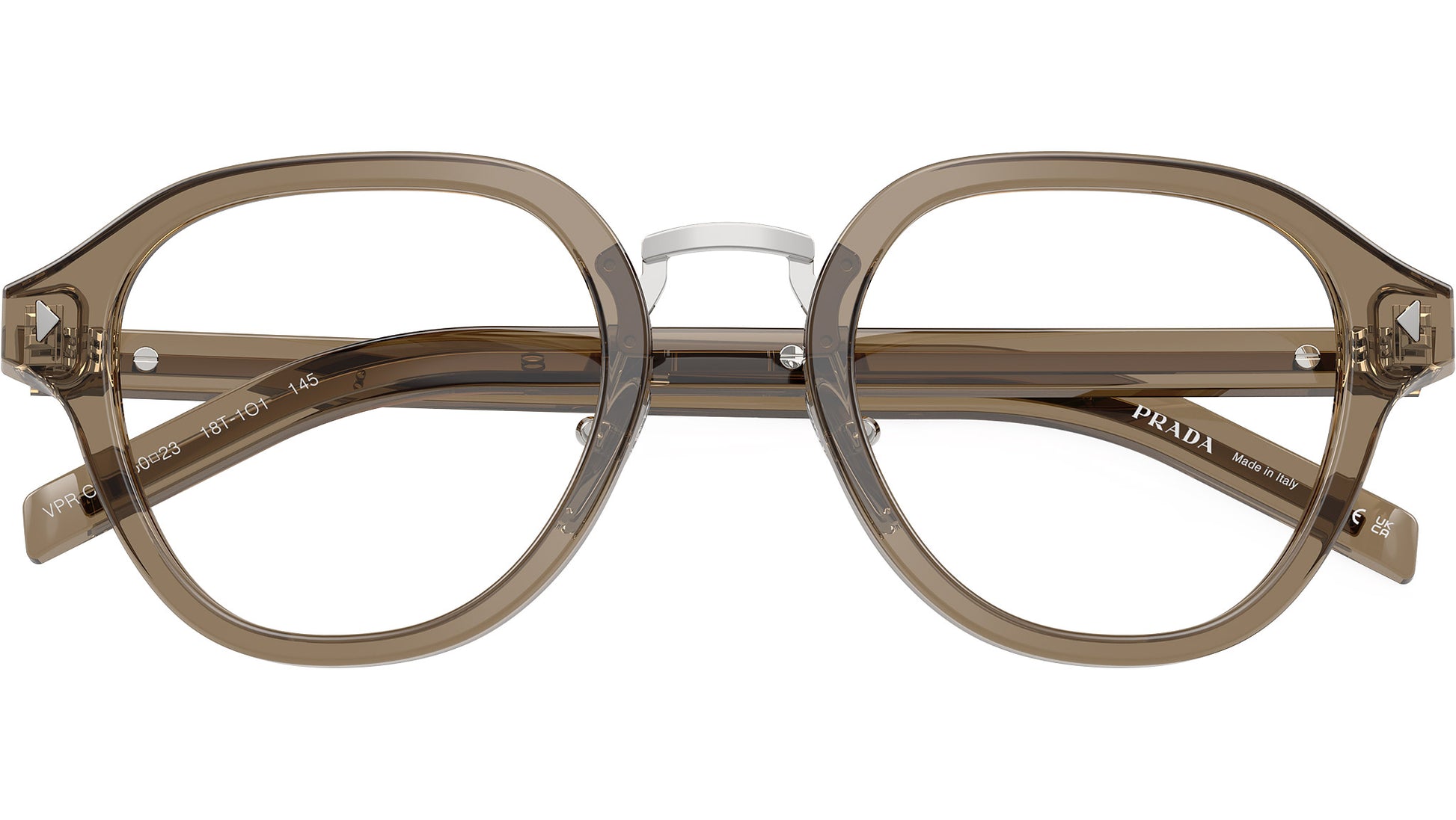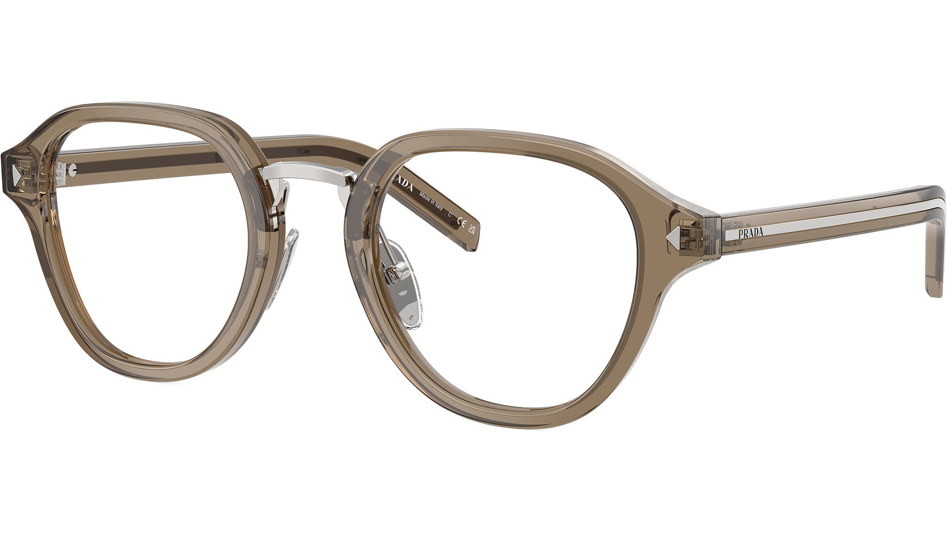 Prada PR C05V 18T1O1 glasses for men, featuring transparent terra panthos acetate frame and demo lens. Adjustable nosepads. Brand line: Heritage. Style code: PRC05V. Color code: 18T1O1. Made in Italy. Authorized Prada online reseller. Your glasses will include the original case and accessories and are covered by a 12-month global warranty.