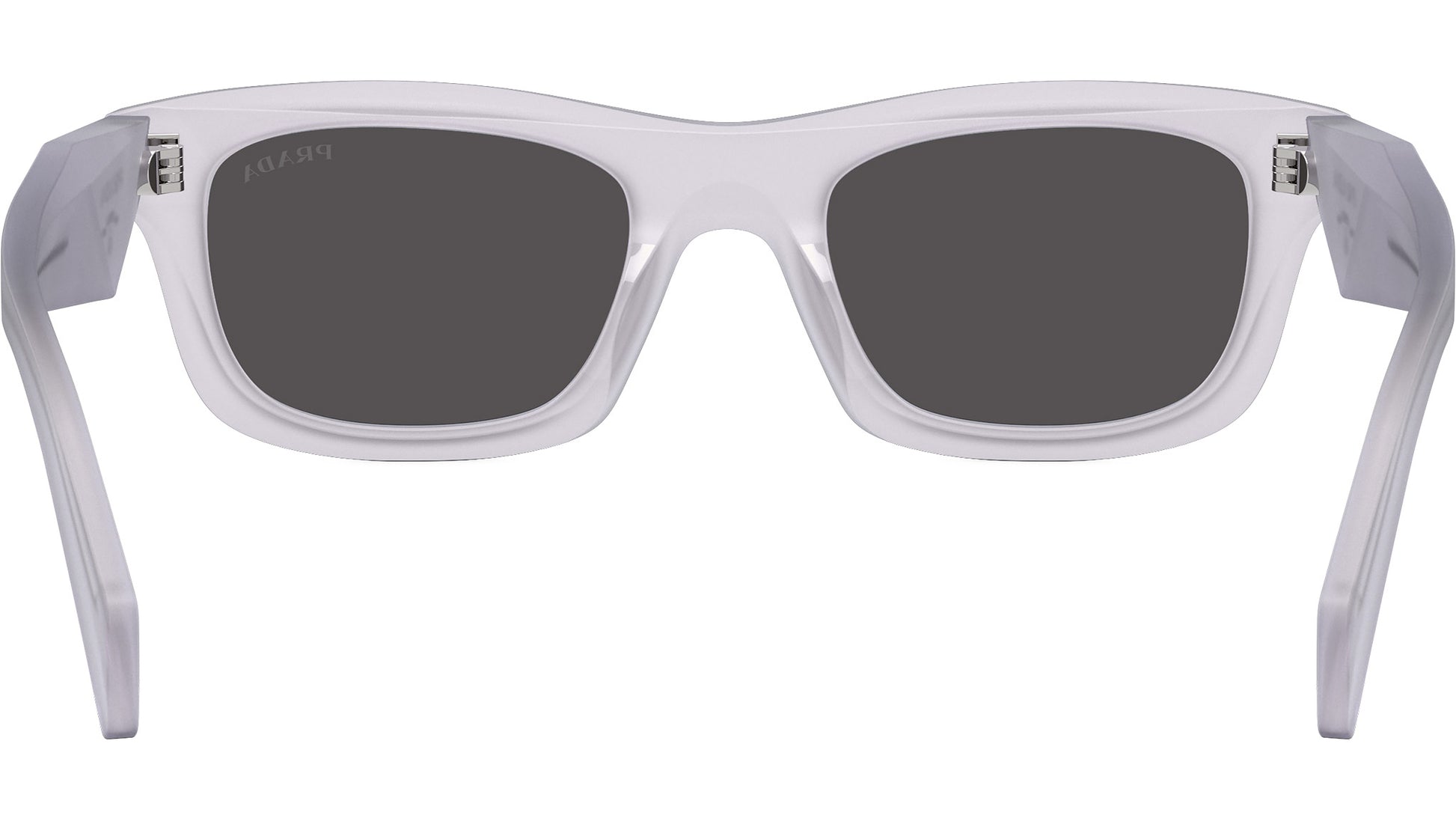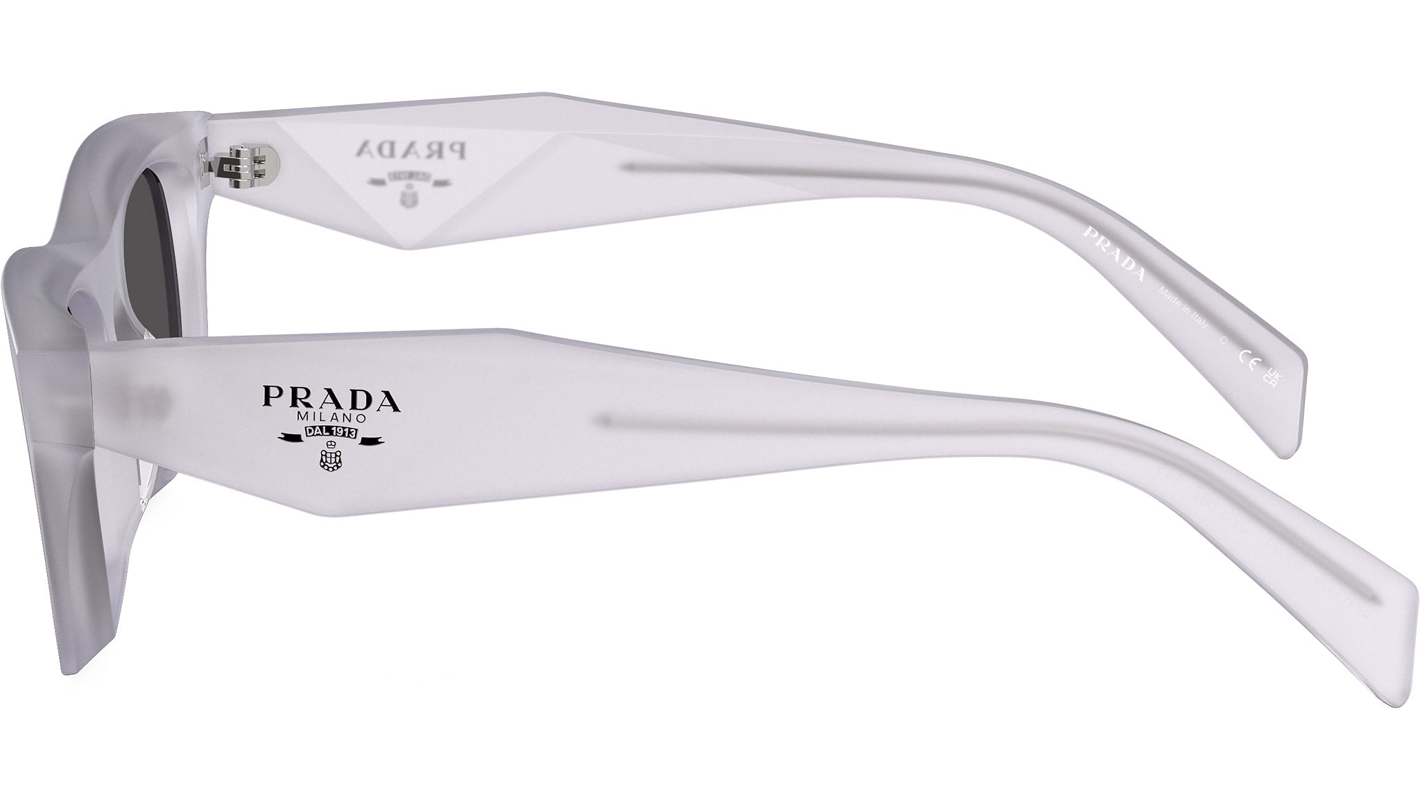Prada PR C06S 22G08Z sunglasses for women, featuring frosted ice d-frame acetate frame and dark grey bio polyamide lenses. High bridge fit. Brand line: Design. Style code: PRC06S. Color code: 22G08Z. Made in Italy. Authorized Prada online reseller. Your glasses will include the original case and accessories and are covered by a 12-month global warranty.