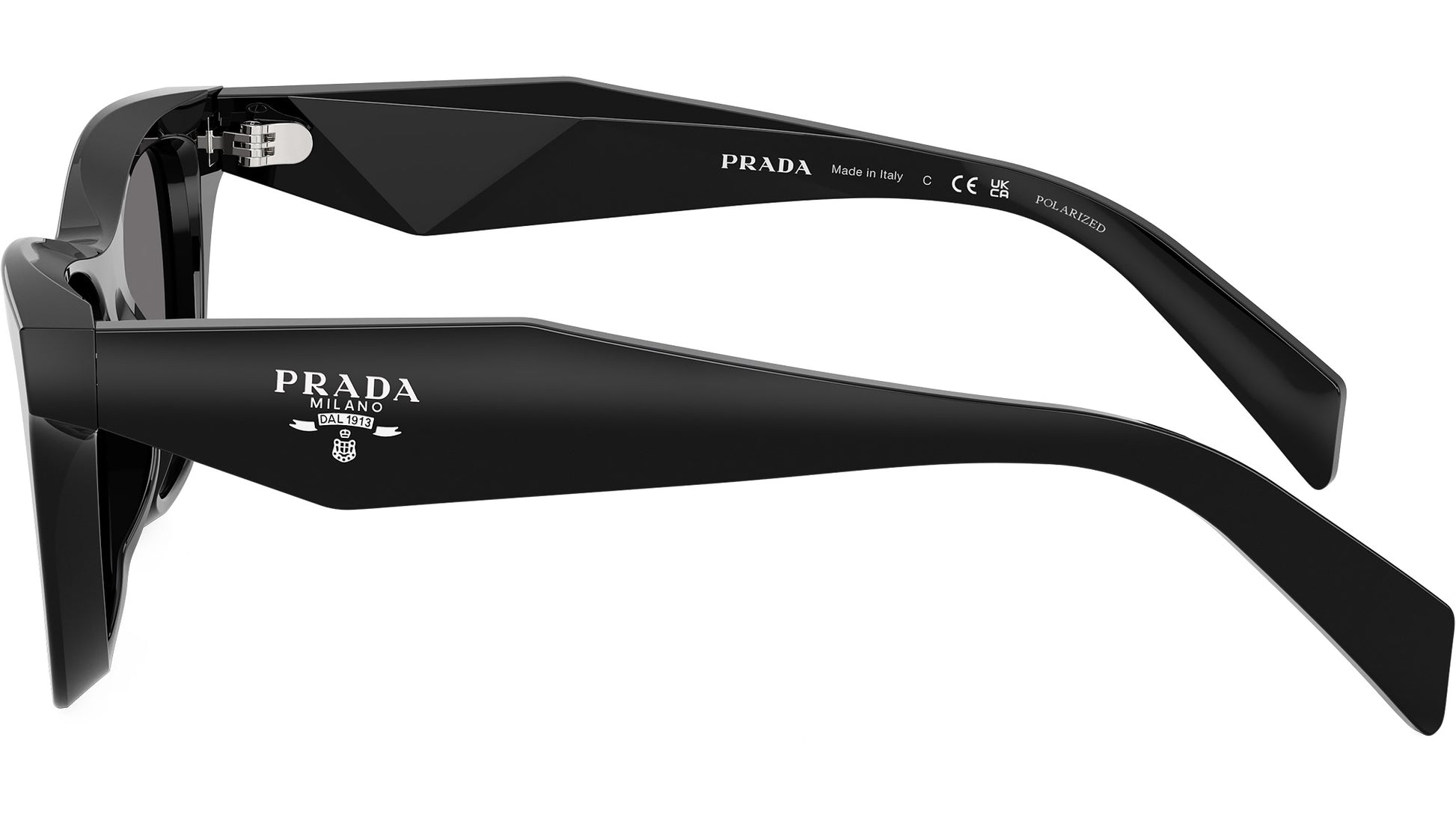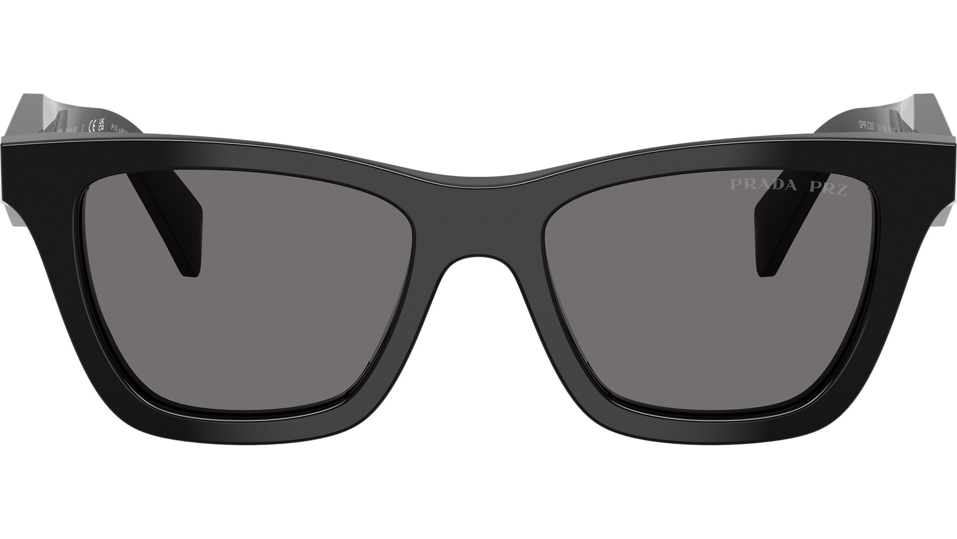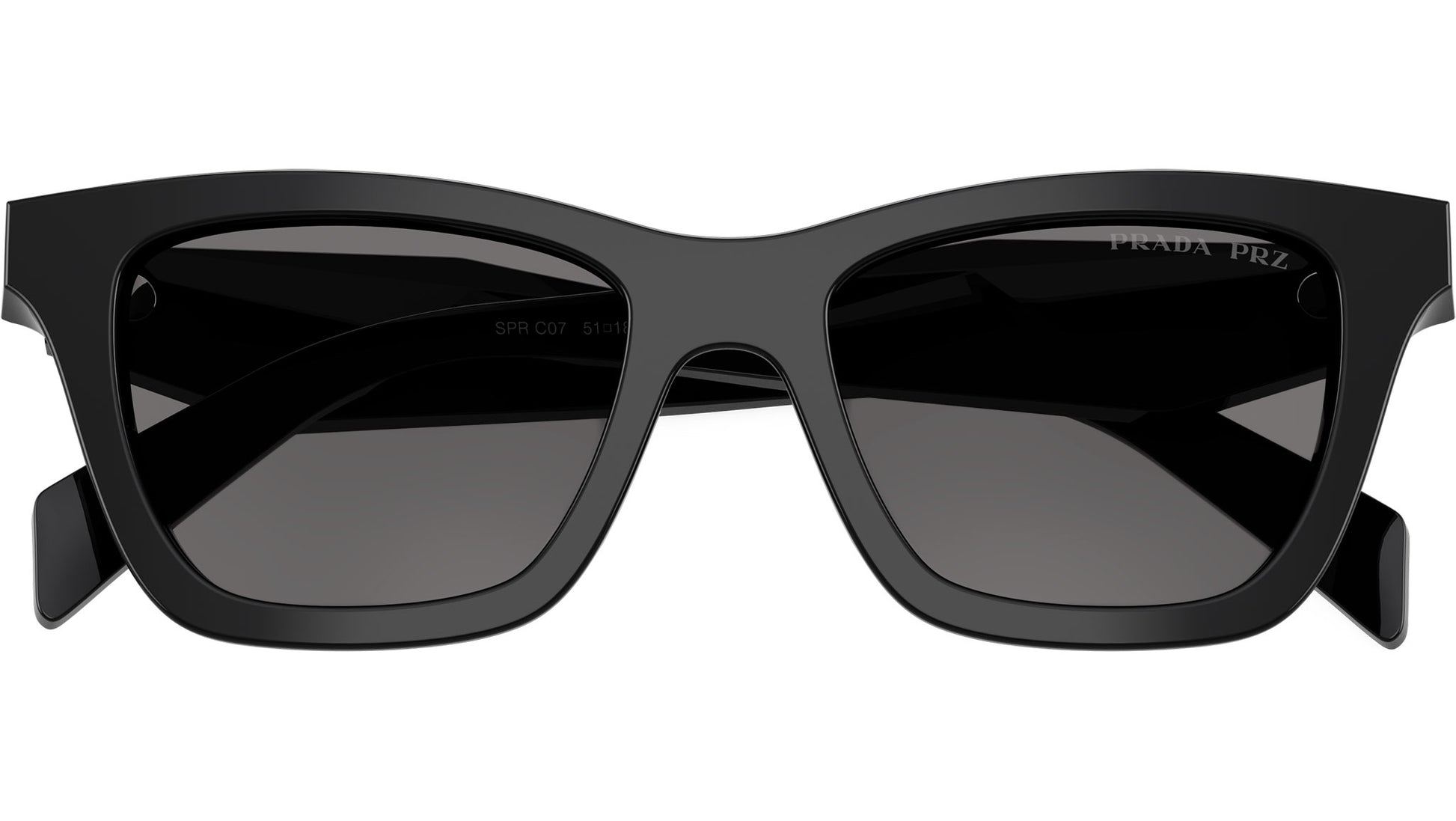 Prada PR C07S 16K90T sunglasses for women, featuring black butterfly acetate frame and dark grey polar CR-39 lenses. High bridge fit. Brand line: Design. Style code: PRC07S. Color code: 16K90T. Made in Italy. Authorized Prada online reseller. Your glasses will include the original case and accessories and are covered by a 12-month global warranty.