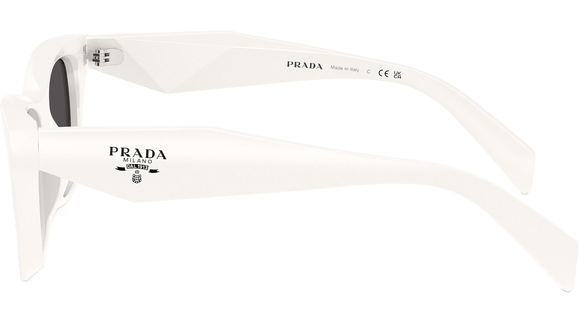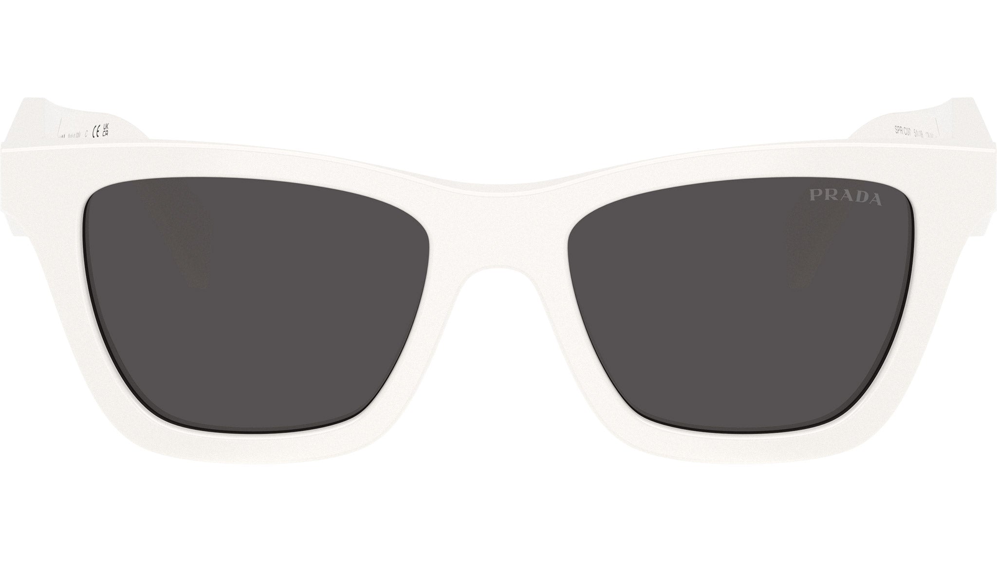 Prada PR C07S 17K08Z sunglasses for women, featuring talc butterfly acetate frame and dark grey bio polyamide lenses. High bridge fit. Brand line: Design. Style code: PRC07S. Color code: 17K08Z. Made in Italy. Authorized Prada online reseller. Your glasses will include the original case and accessories and are covered by a 12-month global warranty.