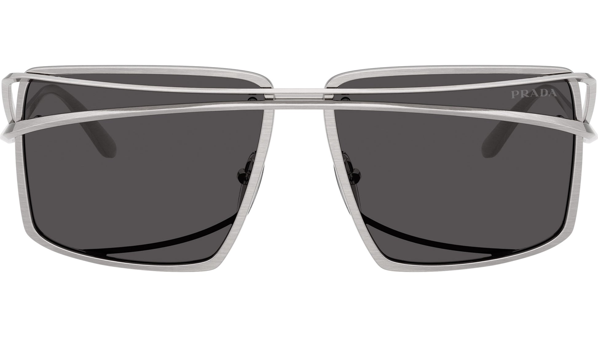 Prada PR C55S 28C08Z sunglasses for men, featuring vintage silver geometric metal frame and dark grey bio polyamide lenses. High bridge fit. Brand line: Fashion Show. Style code: PRC55S. Color code: 28C08Z. Made in Italy. Authorized Prada online reseller. Your glasses will include the original case and accessories and are covered by a 12-month global warranty.