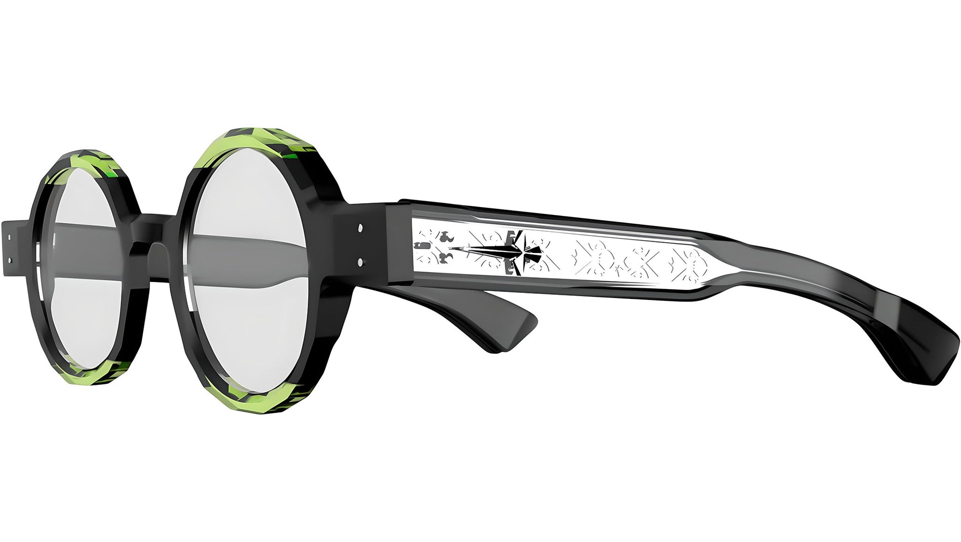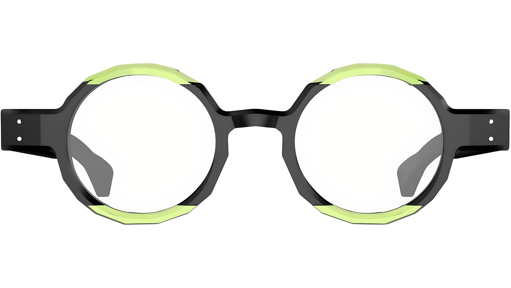 Pugnale Eyewear optical model N417V Face color code 32 in black / yellow round acetate. Pugnale Eyewear's essence is fully expressed through the use of unique and innovative materials, shapes, and assemblies in the Lab Line Unisex series. This lineup showcases all the brand’s iconographic elements with distinctive, bold, and exciting features. It features unusual color combinations, brushed and sponged textures, personalized finishes, decorative inserts, and materials such as harmonic metal, steel, beryllium copper, and acetate.