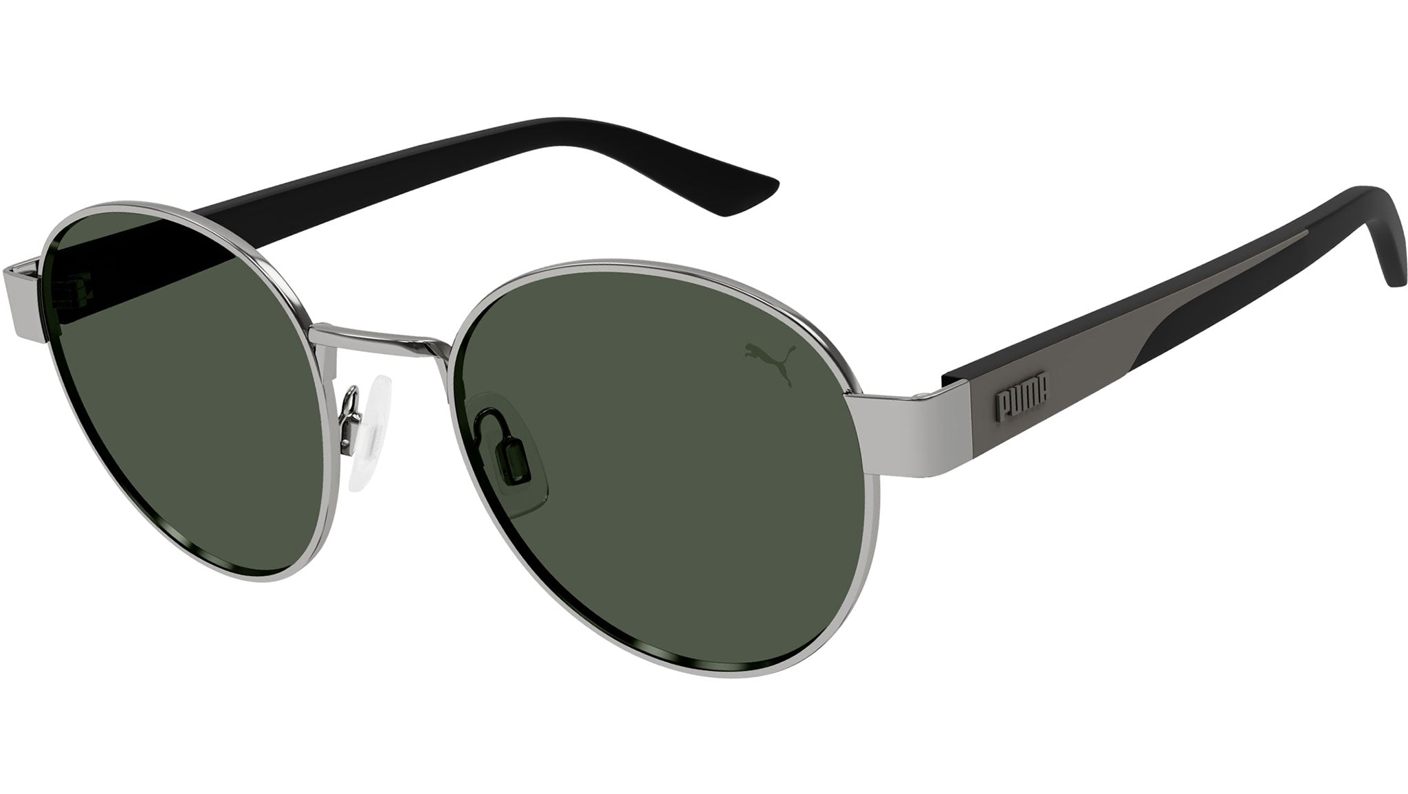 Puma Eyewear Sportstyle collection sunglasses model PU0429S color code 004 featuring shiny light ruthenium frame and solid green lens. Puma Eyewear merges performance and trends, innovation and fashion, sport and lifestyle, for those who see beyond trends and challenge the norm to move things forward.