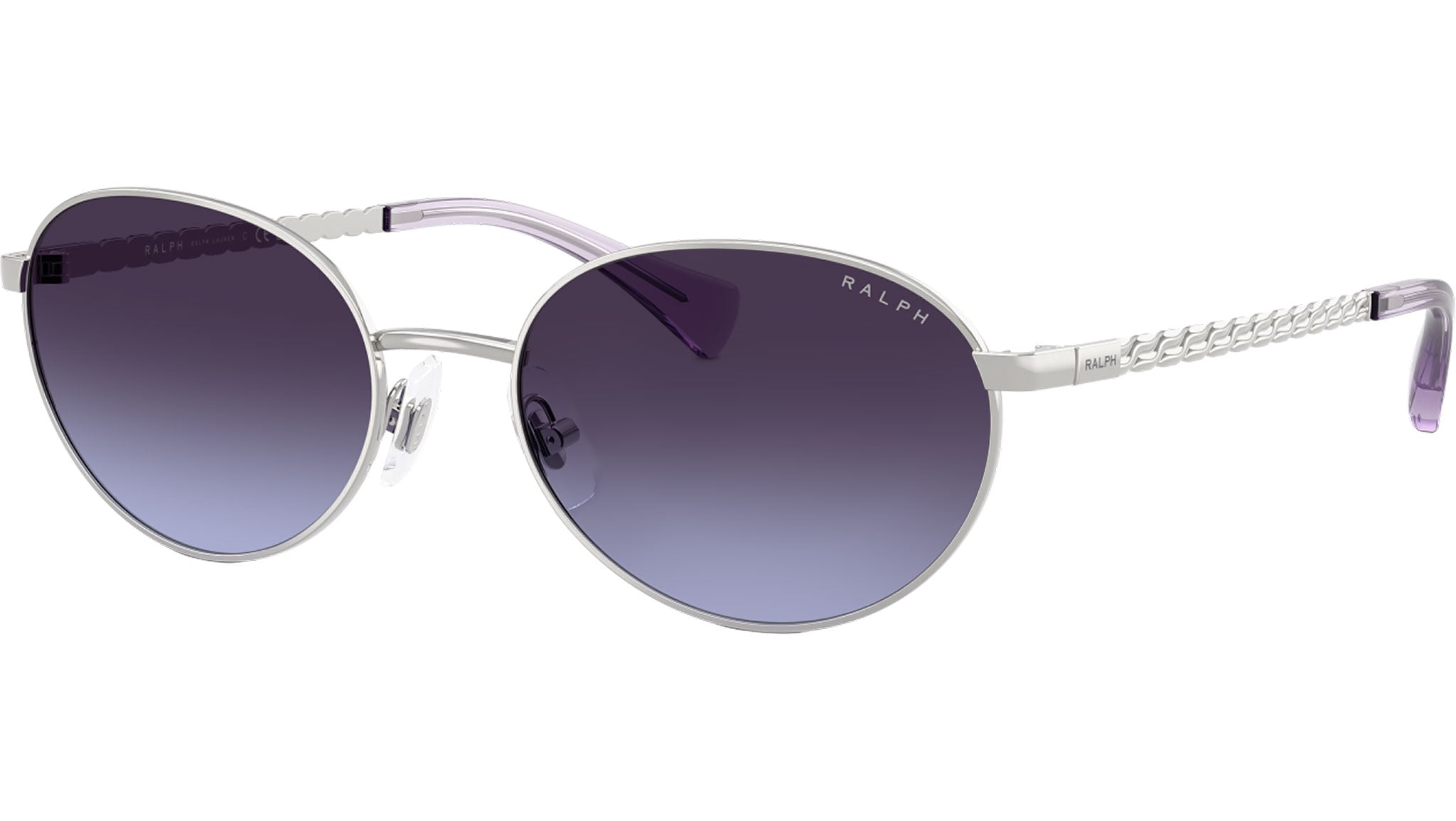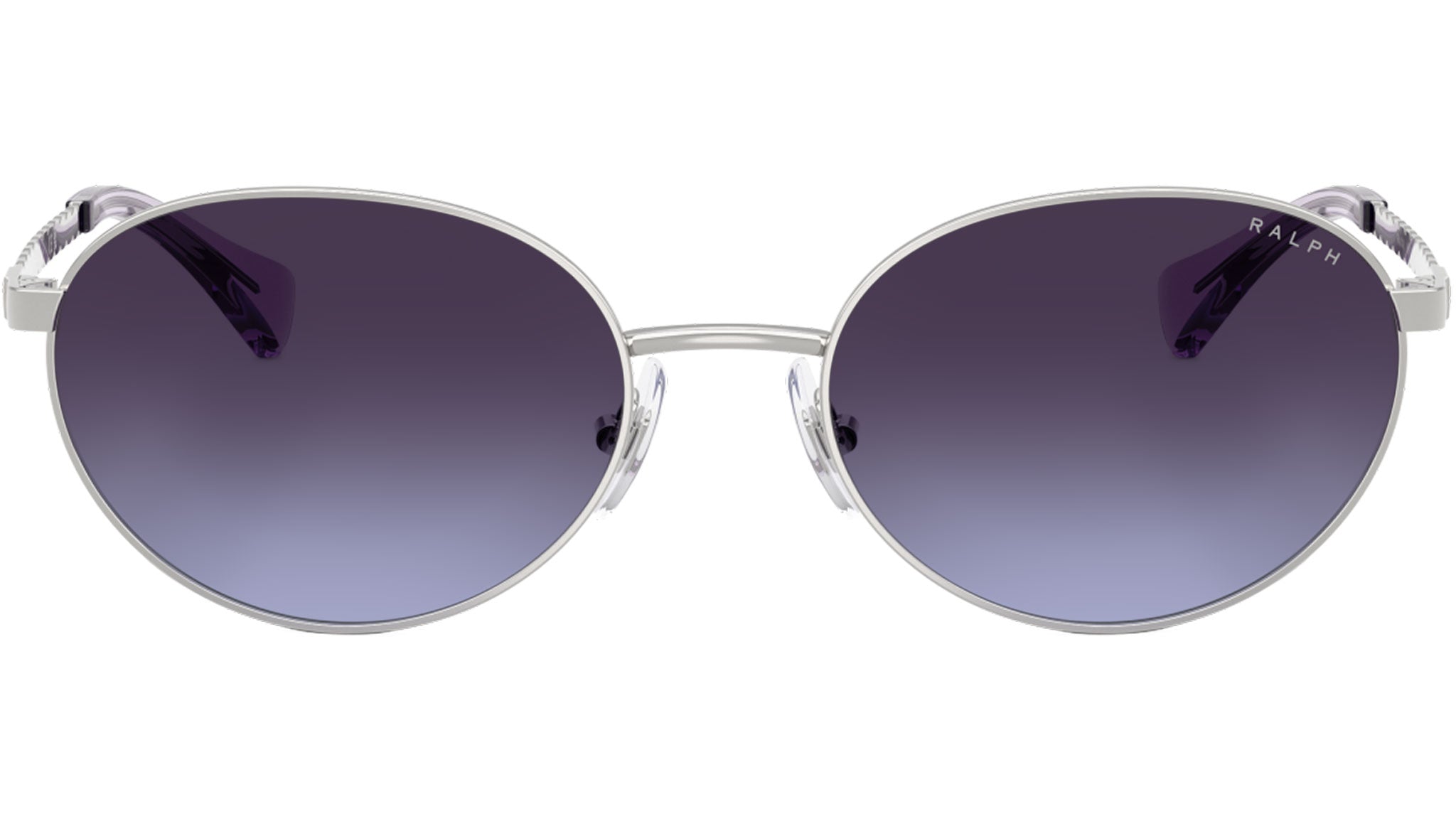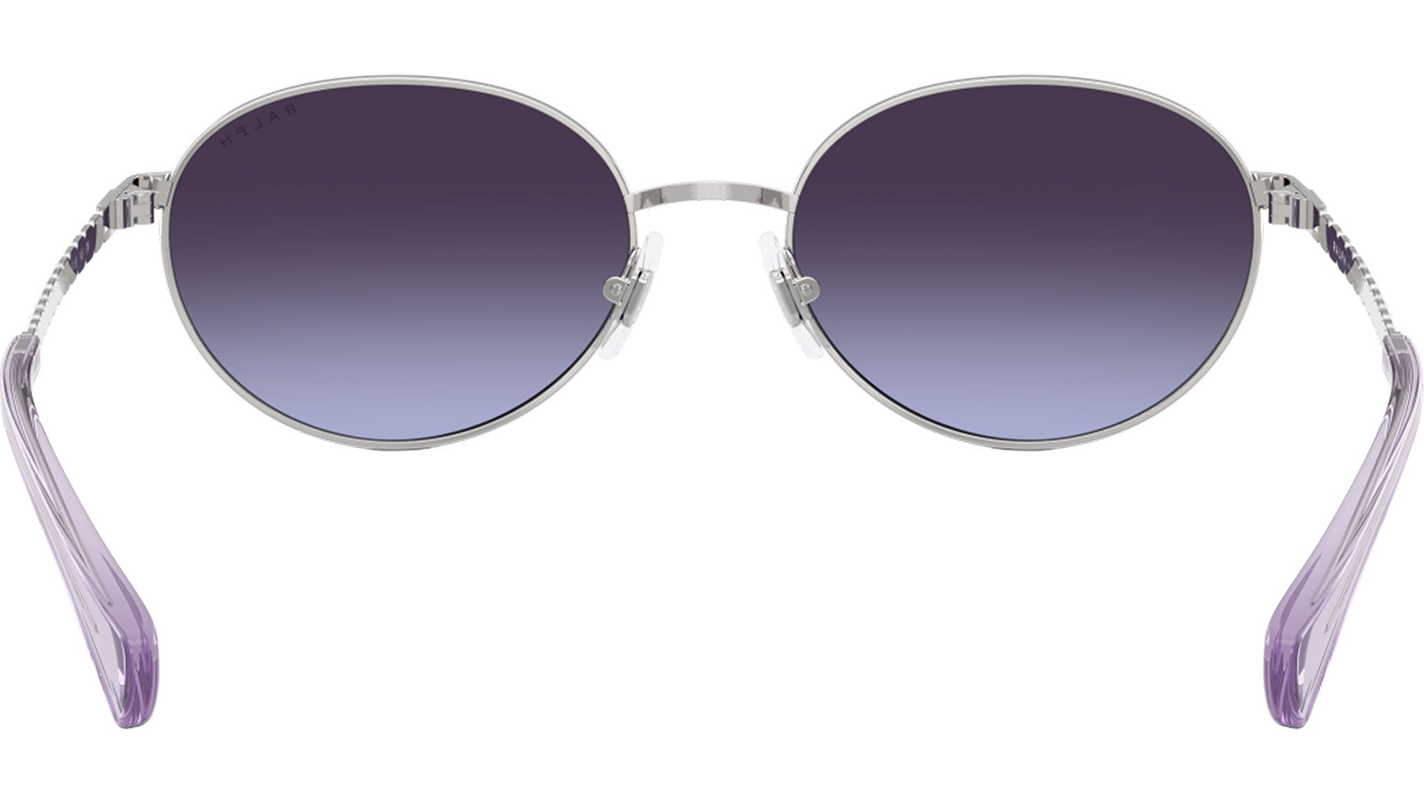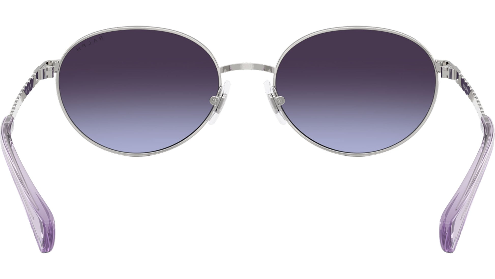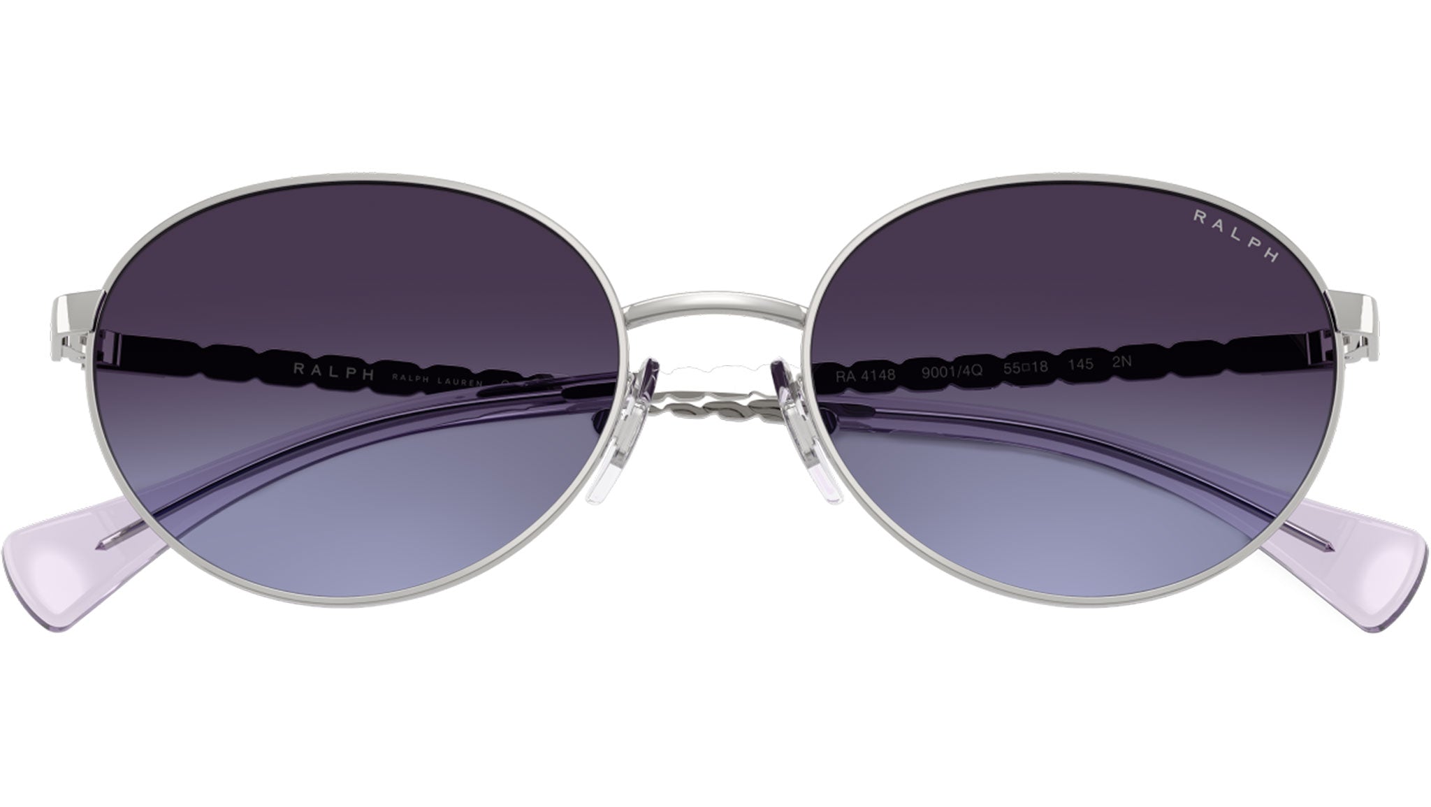 Ralph RA4148 90014Q sunglasses, featuring shiny silver oval metal frame and azure gradient blue polycarbonate lenses. Adjustable nosepads. Brand line: Glamour. Style code: 0RA4148. Color code: 90014Q. Authorized Ralph online reseller. Your glasses will include the original case and accessories and are covered by a 12-month global warranty.