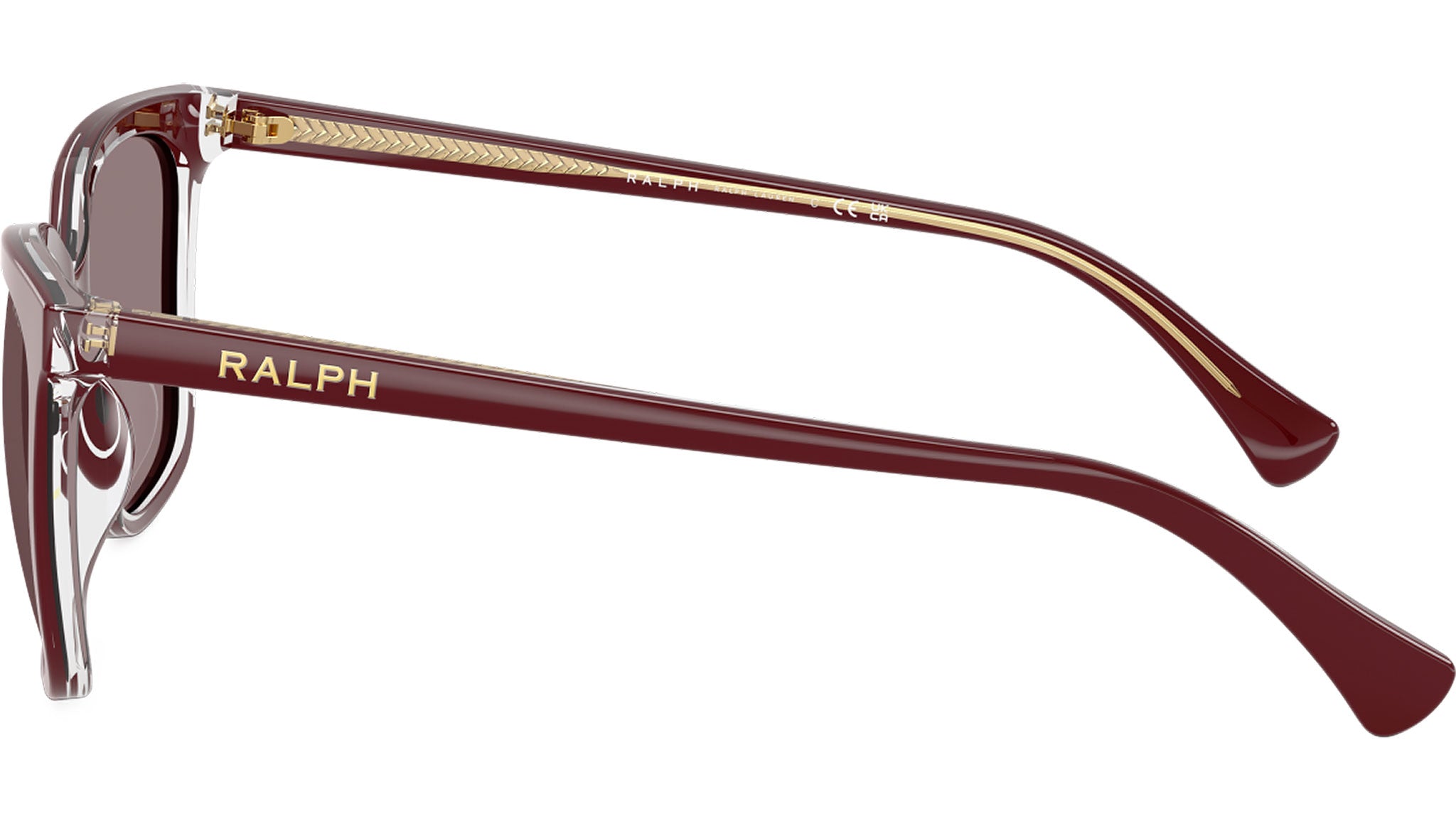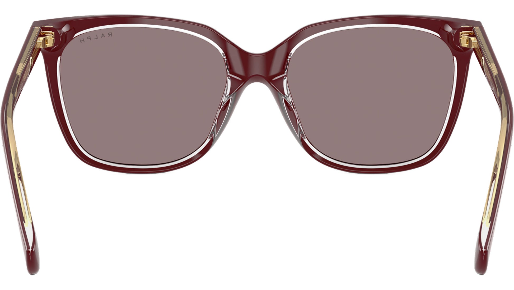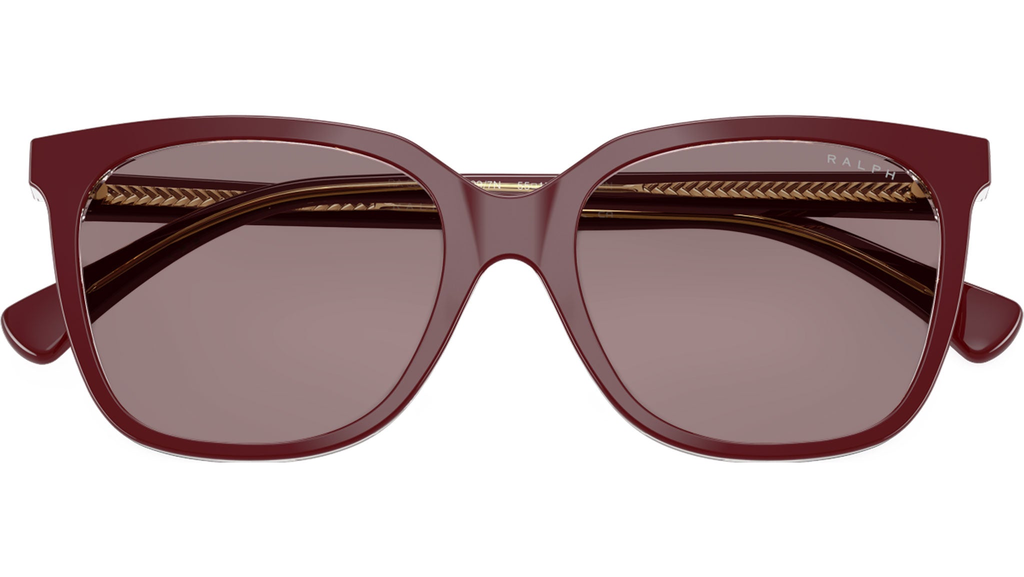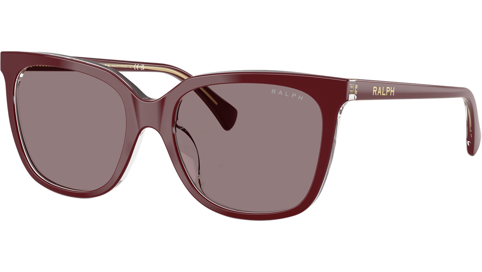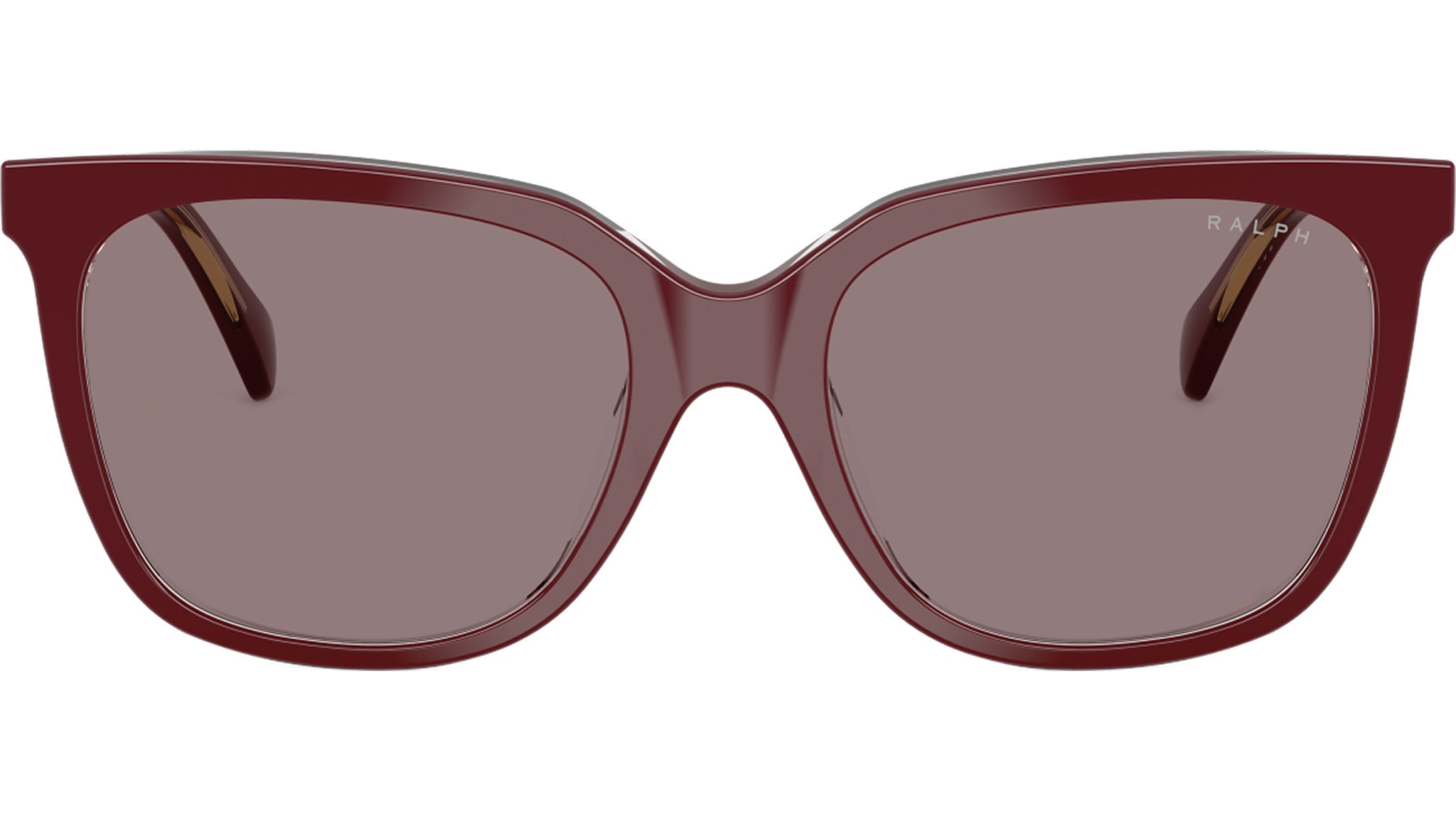 Ralph RA5343U 62997N sunglasses, featuring burgundy transparent squared acetate frame and violet polyamide lenses. Universal fit. Brand line: Essential. Style code: 0RA5343U. Color code: 62997N. Authorized Ralph online reseller. Your glasses will include the original case and accessories and are covered by a 12-month global warranty.