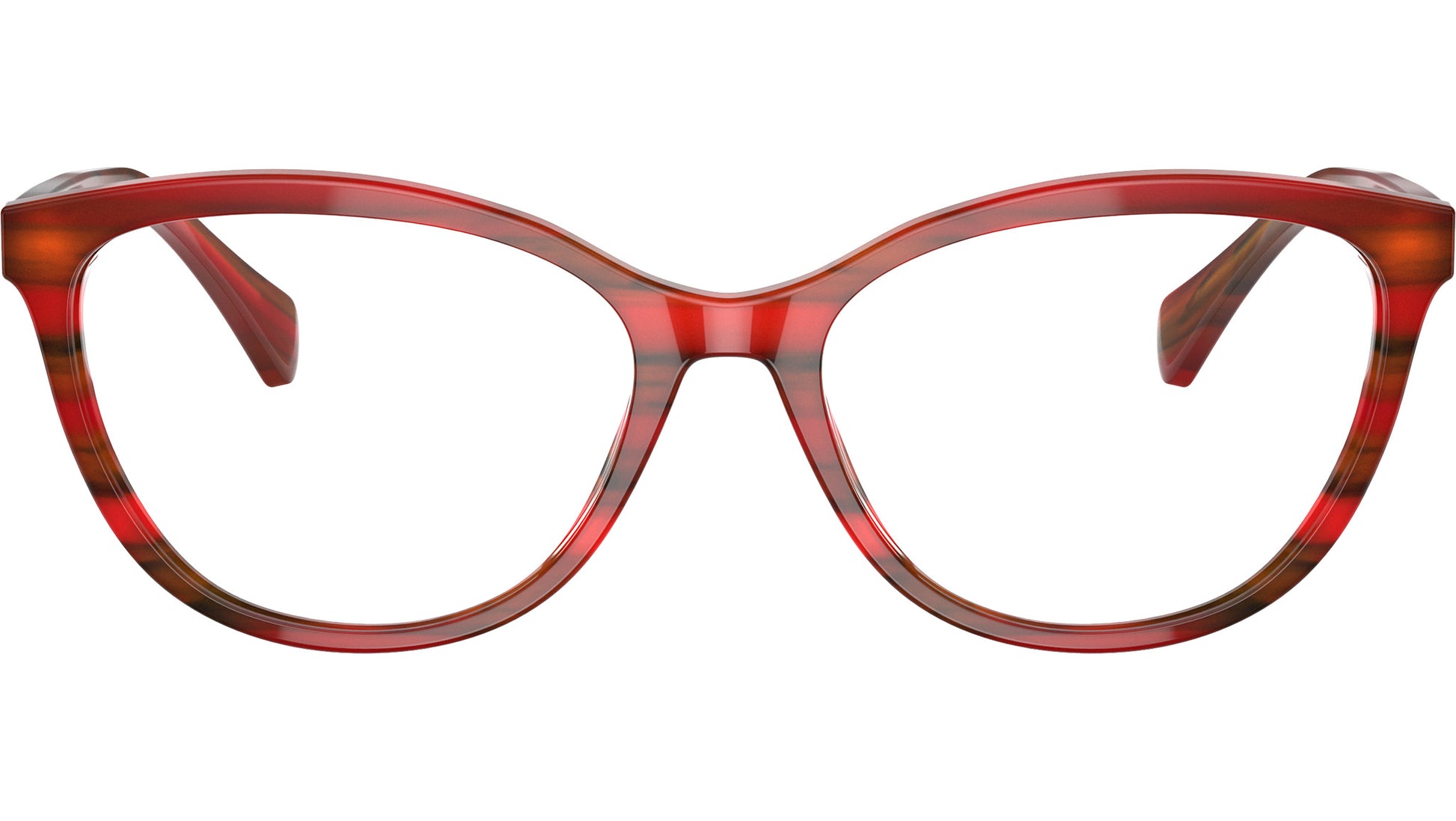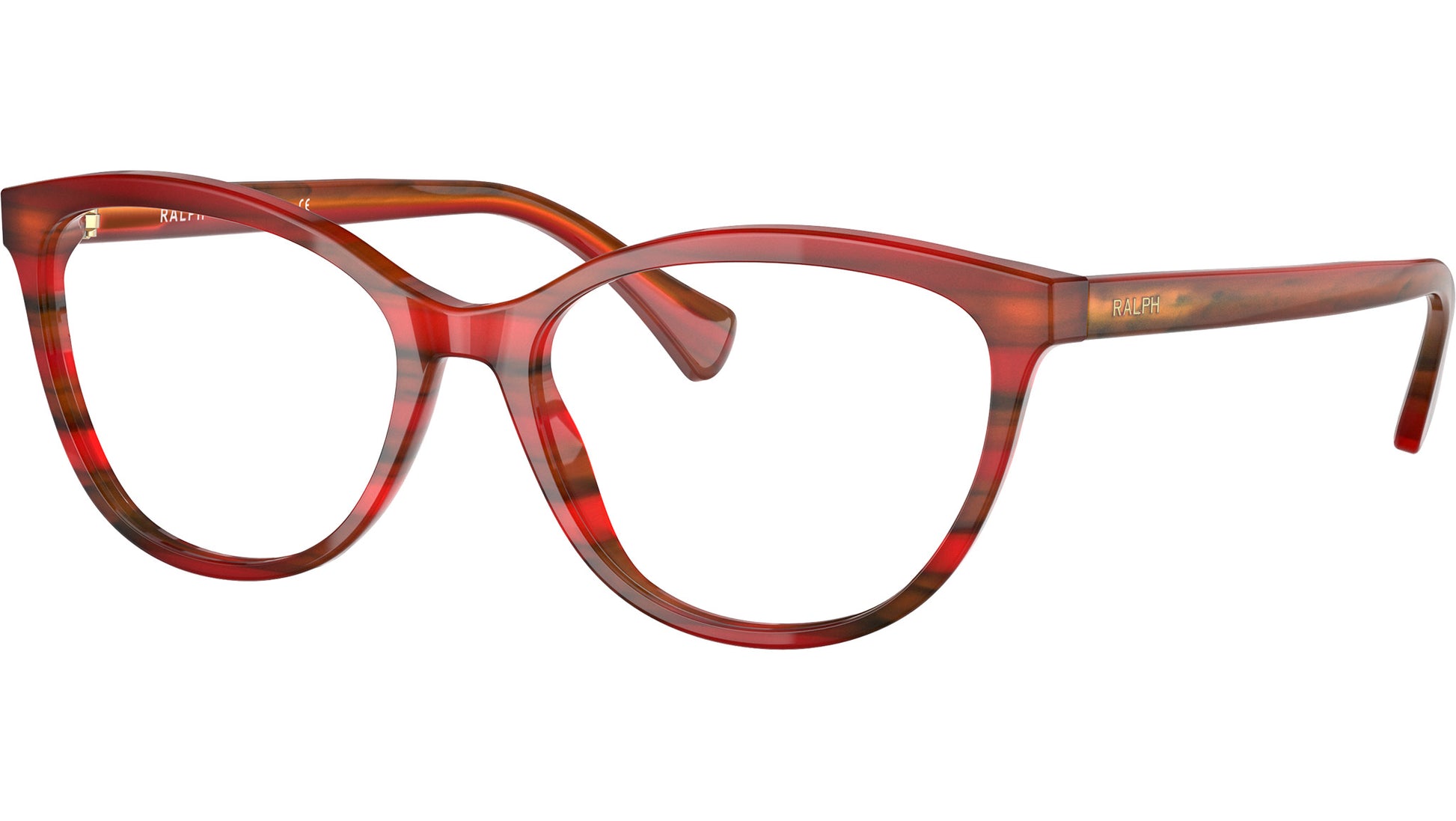 Ralph RA7134 5989 glasses, featuring striped brown cat eye acetate frame and demo lenses. High bridge fit. Brand line: Essential. Style code: 0RA7134. Color code: 5989. Authorized Ralph online reseller. Your glasses will include the original case and accessories and are covered by a 12-month global warranty.