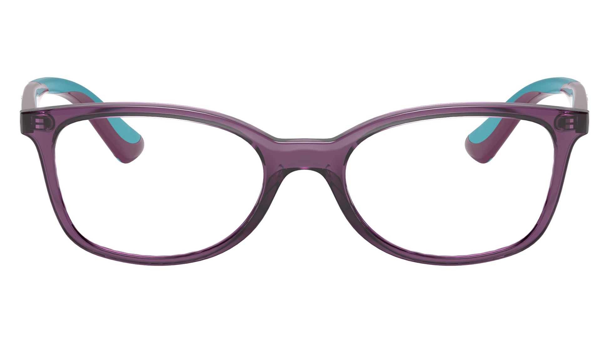 Ray-Ban Kids RY1586 transparent violet acetate eyeglasses, color code 3776. Full Rim square frame shape with demo lens. Authorised Ray-Ban Reseller. Includes genuine case.