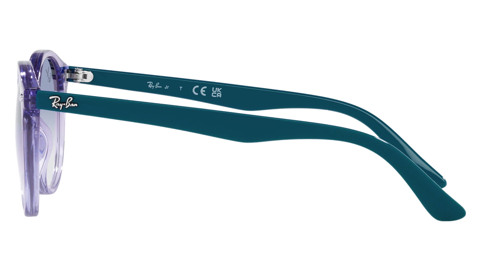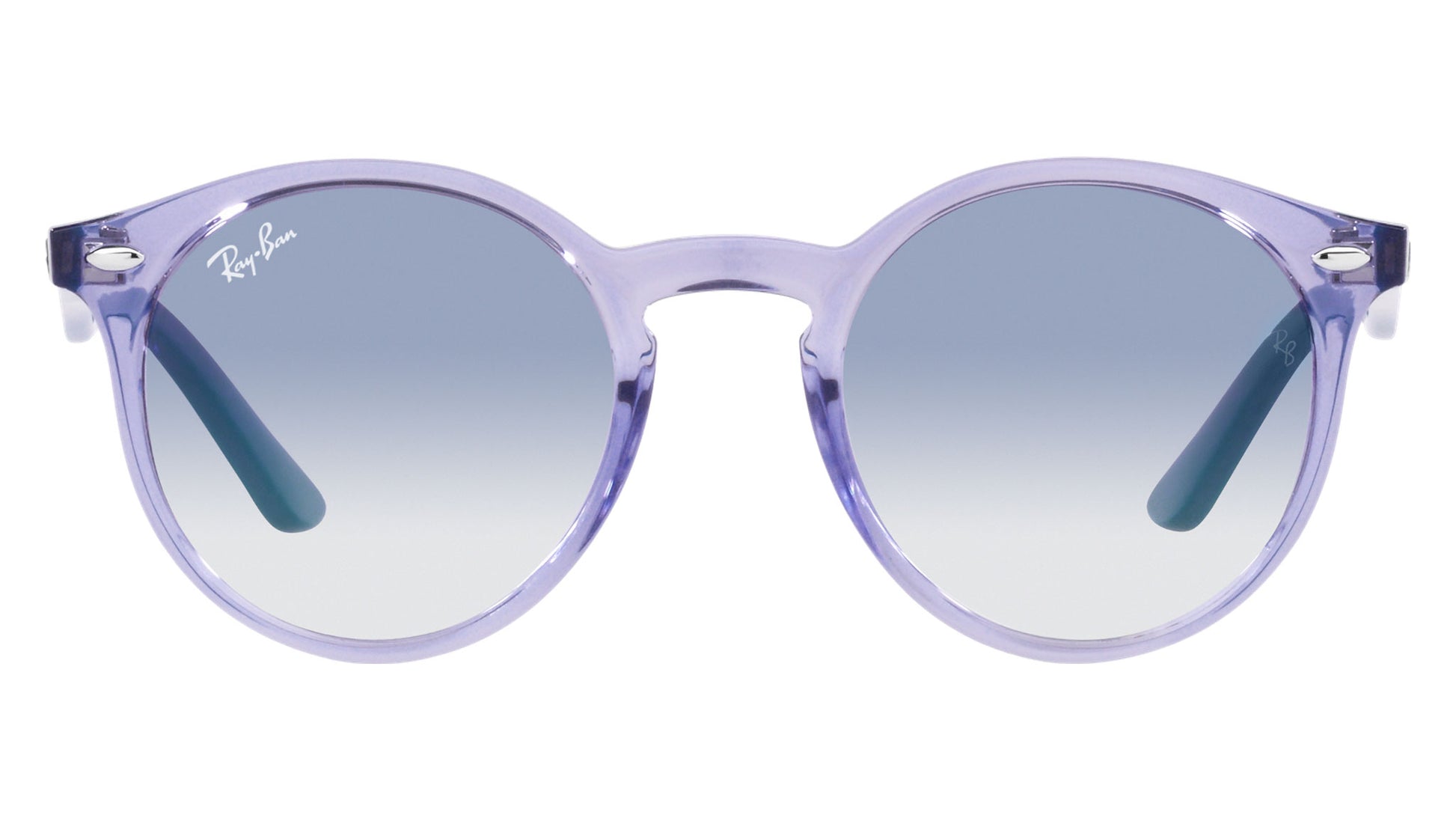 Ray-Ban sunglasses model RJ9064S color code 712619 featuring transparent violet full rim injection frame and polycarbonate blue lenses. Includes genuine case. Authorised Ray-Ban Reseller.