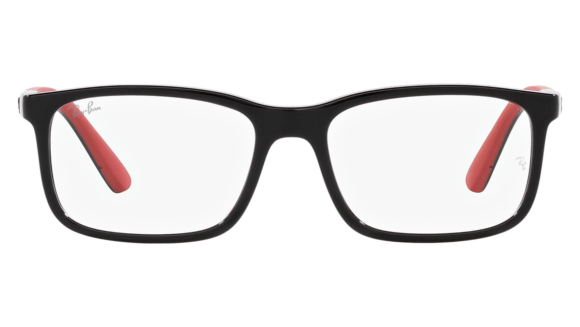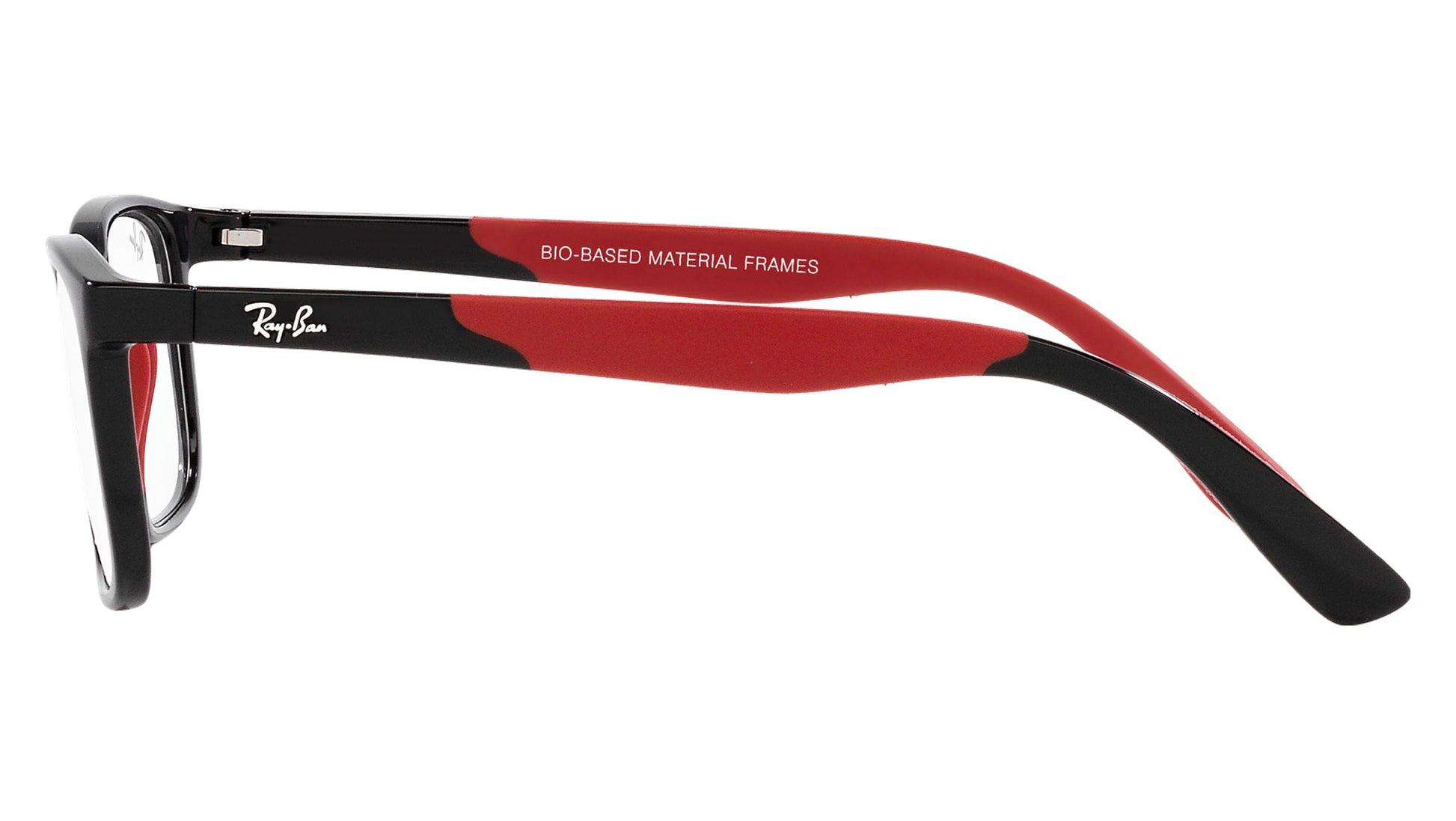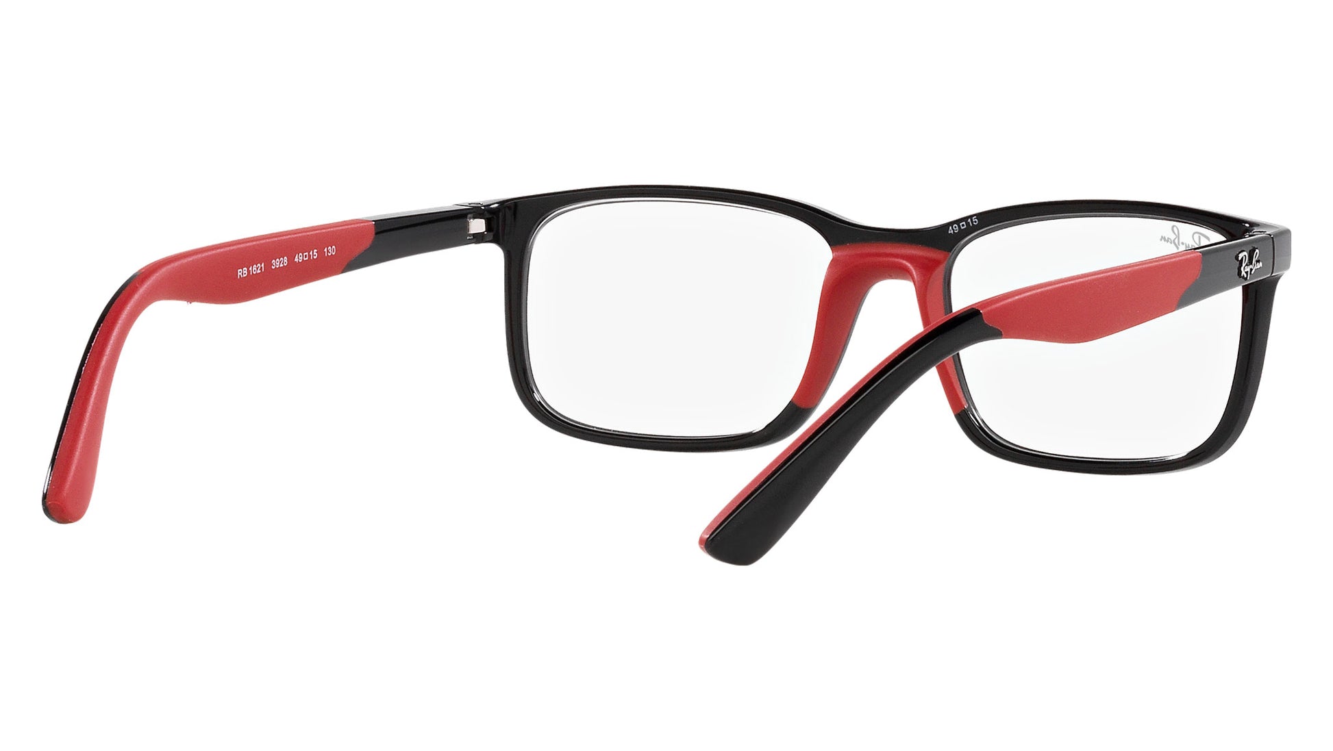 Ray-Ban Kids RY1621 black on red injection eyeglasses, color code 3928. Full Rim unisex rectangle frame shape with high bridge fit and demo lens. Authorised Ray-Ban Reseller. Includes genuine case.