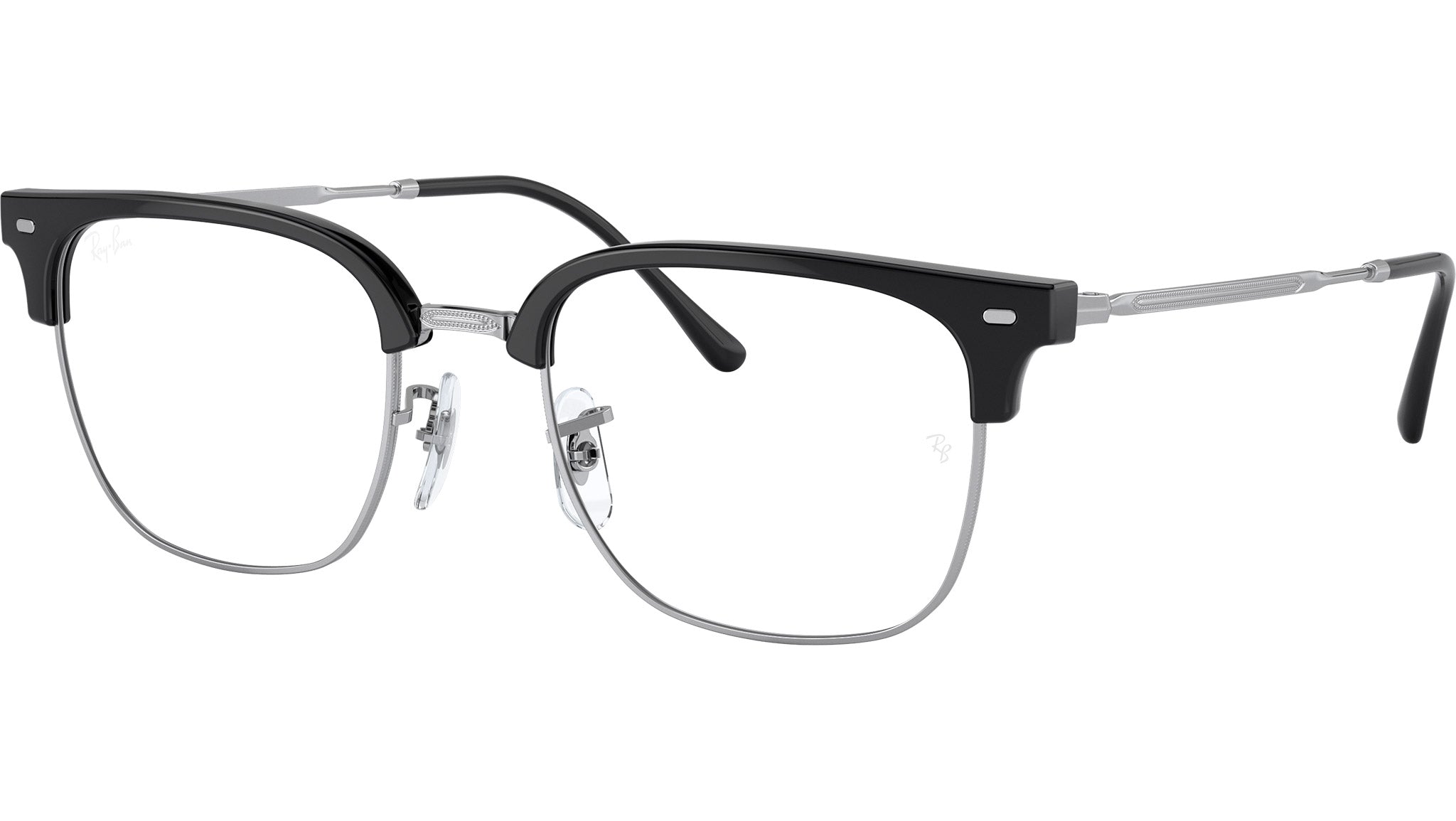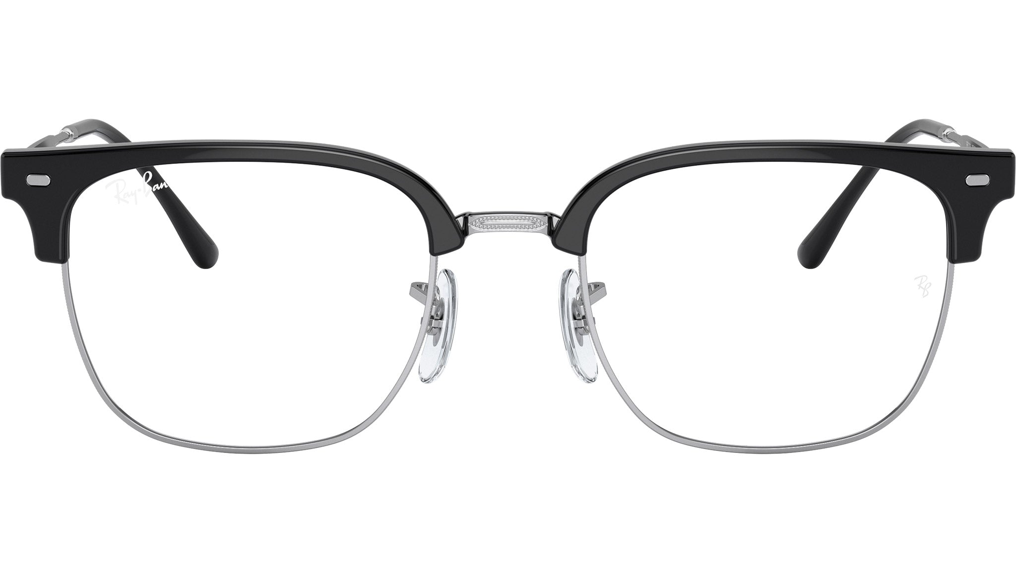 Ray-Ban New Clubmaster RB7216 2000 glasses for men and woman, featuring black on silver squared propionate frame and demo lens. Adjustable nosepads. Brand line: Evolution. Style code: 0RX7216. Color code: 2000. Authorized Ray-Ban online reseller. Your glasses will include the original case and accessories and are covered by a 12-month global warranty.