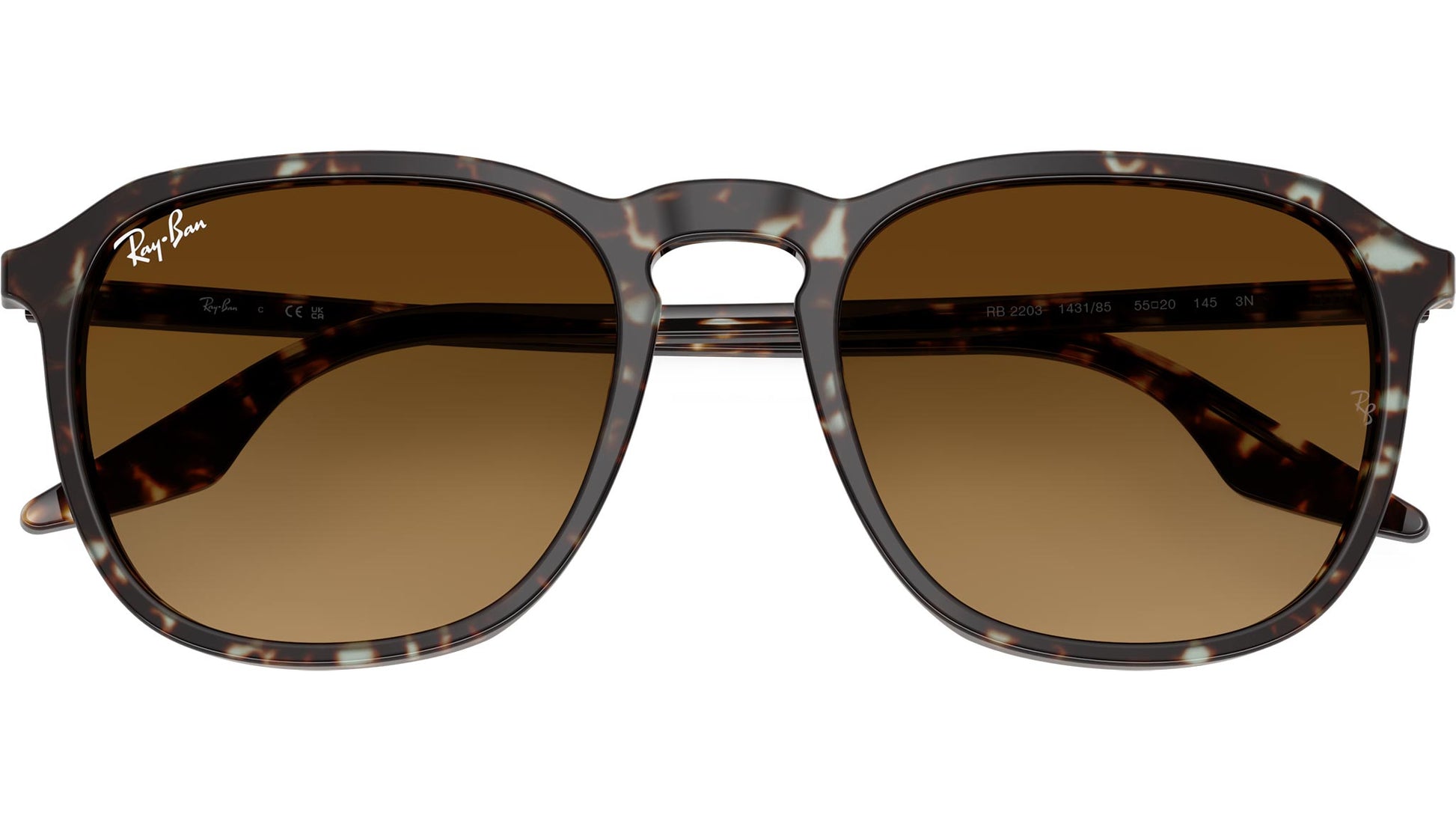 Ray-Ban RB2203 RB2203 143185 sunglasses for men and woman, featuring havana yellow tortoiseshell squared acetate frame and gradient brown glass lenses. High bridge fit. Brand line: Core. Style code: 0RB2203. Color code: 143185. Authorized Ray-Ban online reseller. Your glasses will include the original case and accessories and are covered by a 12-month global warranty.
