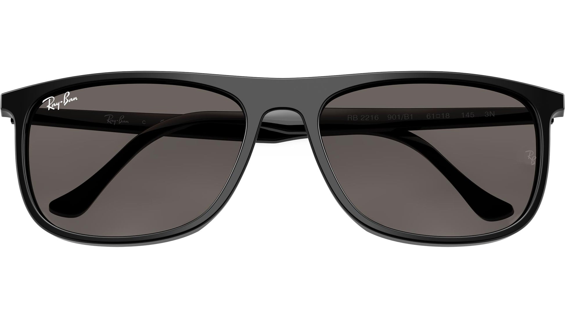 Ray-Ban RB2216 RB2216 901/B1 sunglasses for men and woman, featuring black rectangular acetate frame and dark grey glass lenses. High bridge fit. Brand line: Core. Style code: 0RB2216. Color code: 901/B1. Authorized Ray-Ban online reseller. Your glasses will include the original case and accessories and are covered by a 12-month global warranty.