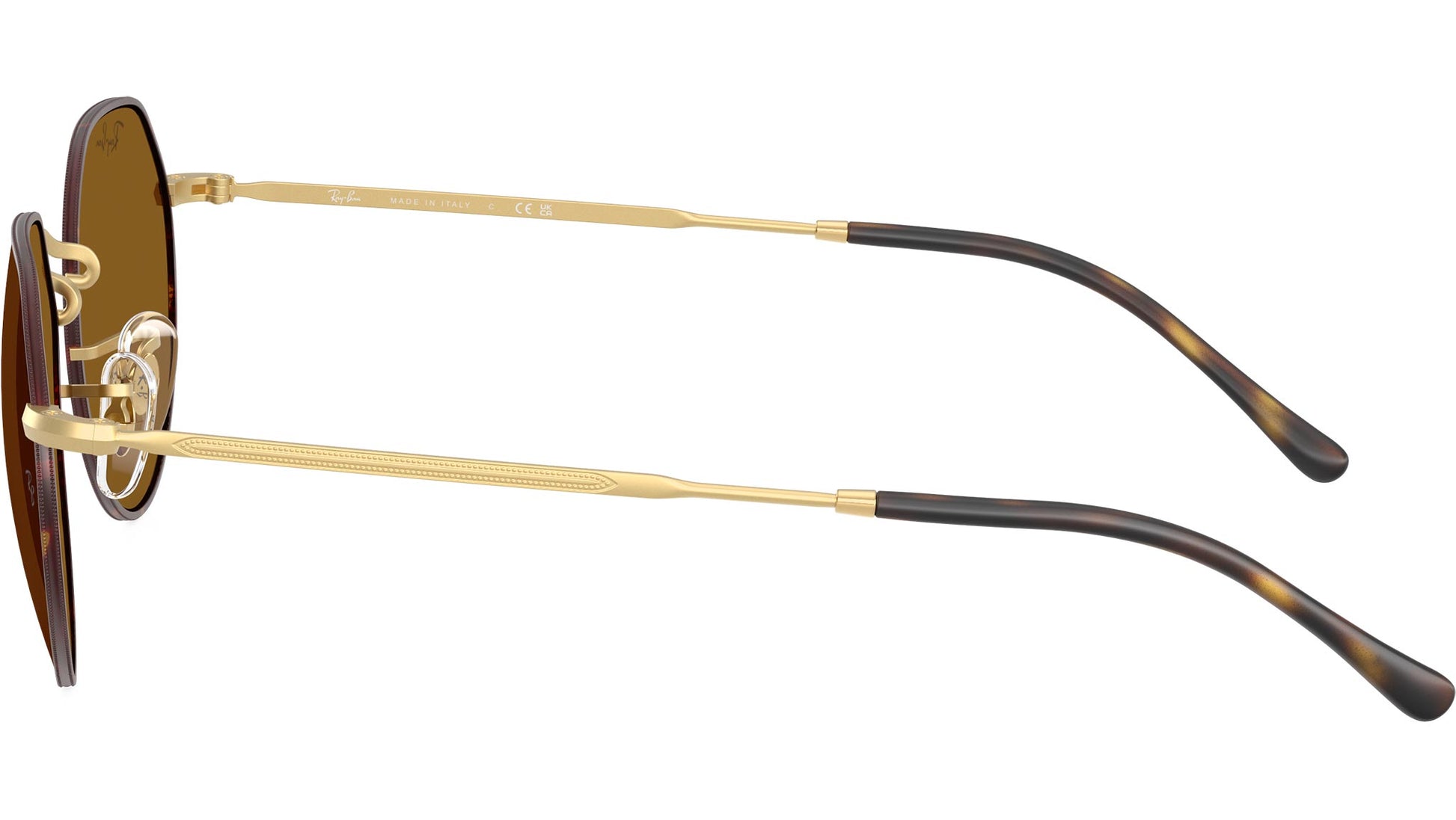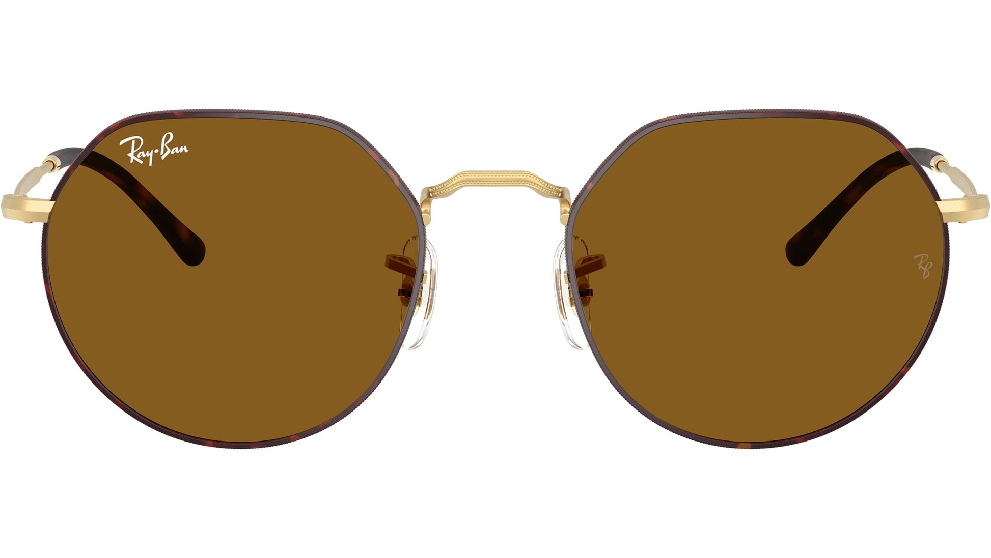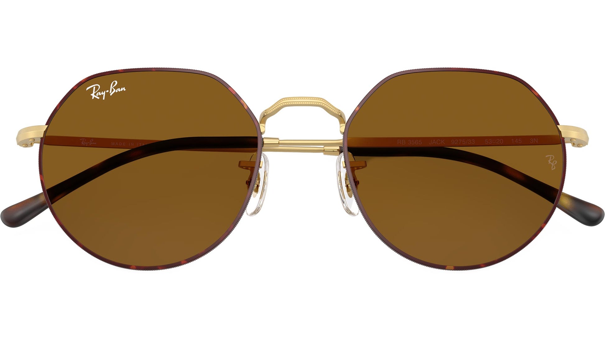 Ray-Ban Jack RB3565 927533 sunglasses for men and woman, featuring matte havana on matte arista gold geometric metal frame and brown glass lenses. Adjustable nosepads. Brand line: Evolution. Style code: 0RB3565. Color code: 927533. Authorized Ray-Ban online reseller. Your glasses will include the original case and accessories and are covered by a 12-month global warranty.