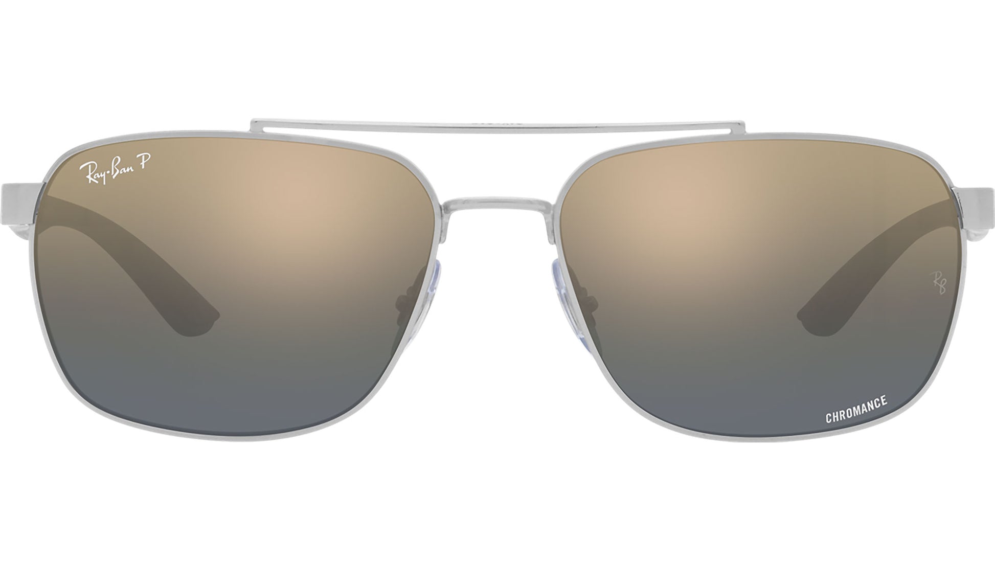 RB3701 003/J0 silver, stainless steel frame, metal temple, featuring dark grey mirror polycarbonate lens.