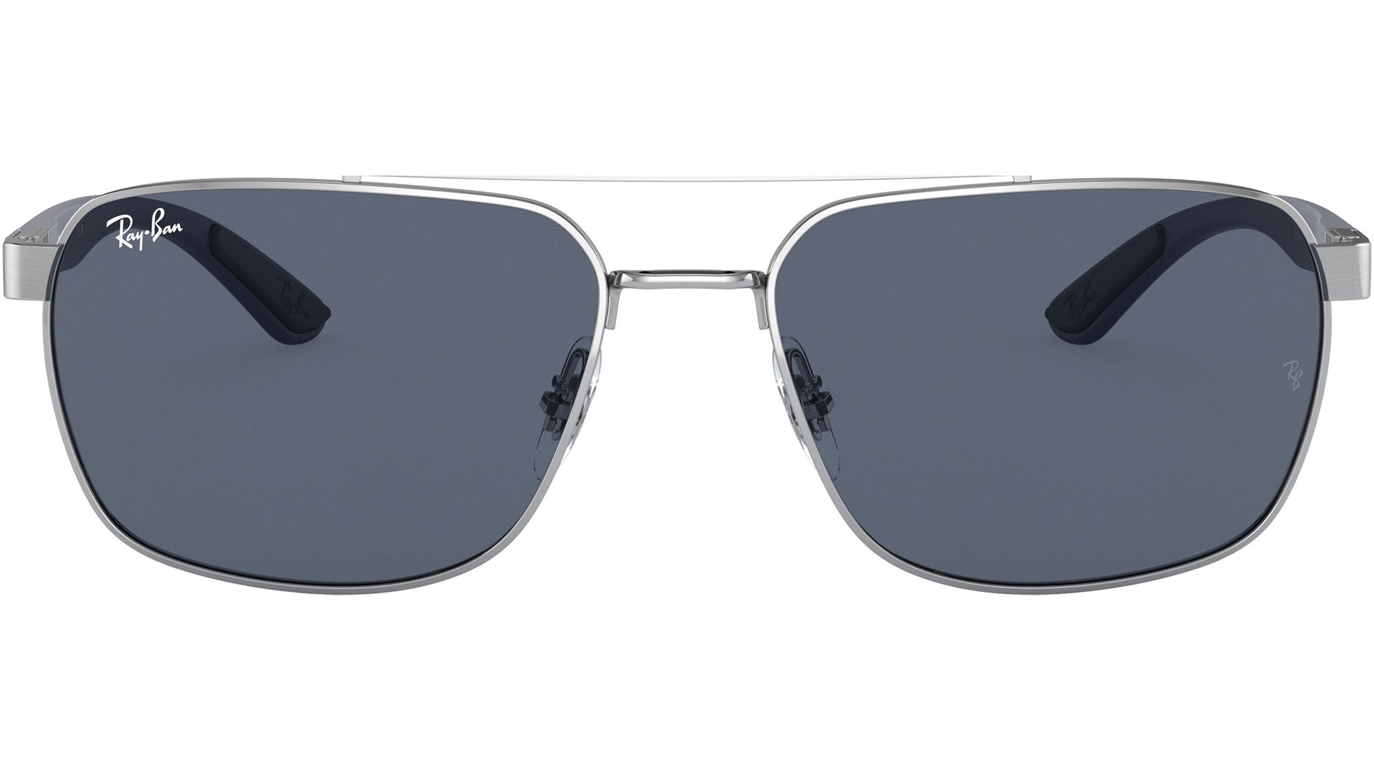 RB3701 924387 silver, stainless steel frame, metal temple, featuring dark grey polycarbonate lens.