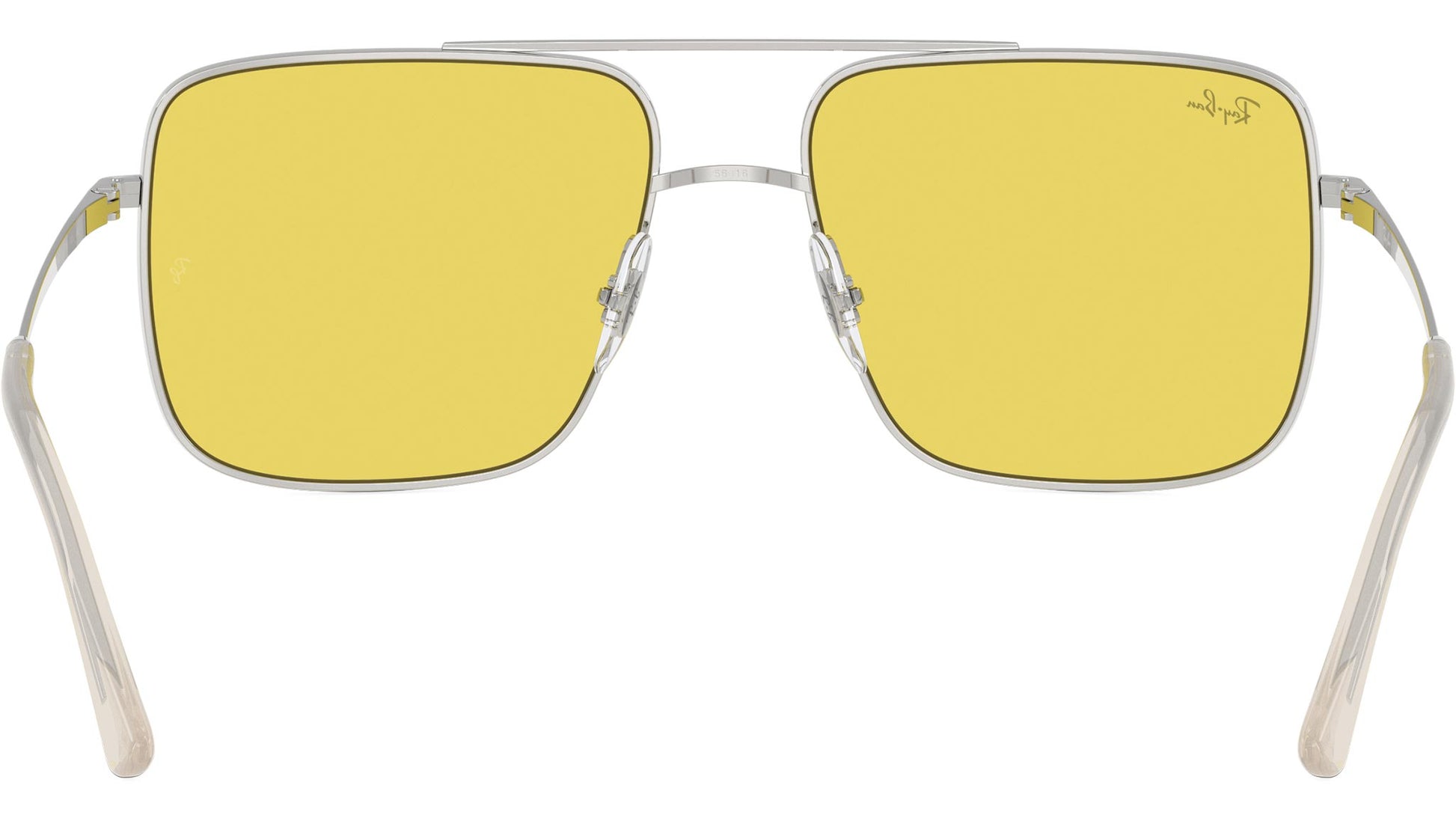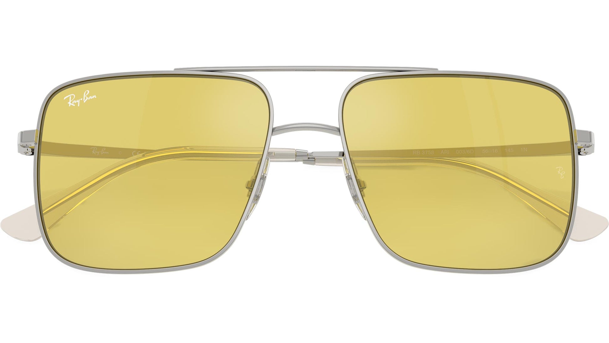 Ray-Ban Ari RB3758 003/6D sunglasses for men and woman, featuring silver squared metal frame and yellow mirror flash gold bio polyamide lenses. Adjustable nosepads. Brand line: Nowness. Style code: 0RB3758. Color code: 003/6D. Authorized Ray-Ban online reseller. Your glasses will include the original case and accessories and are covered by a 12-month global warranty.