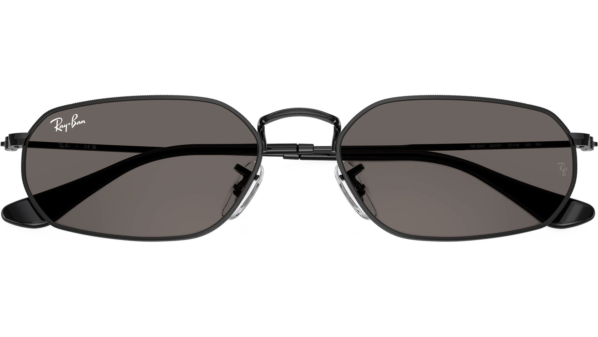 Ray-Ban RB3947 002/B1 sunglasses for men and woman, featuring black geometric metal frame and dark grey glass lenses. Adjustable nosepads. Brand line: Evolution. Style code: 0RB3947. Color code: 002/B1. Authorized Ray-Ban online reseller. Your glasses will include the original case and accessories and are covered by a 12-month global warranty.