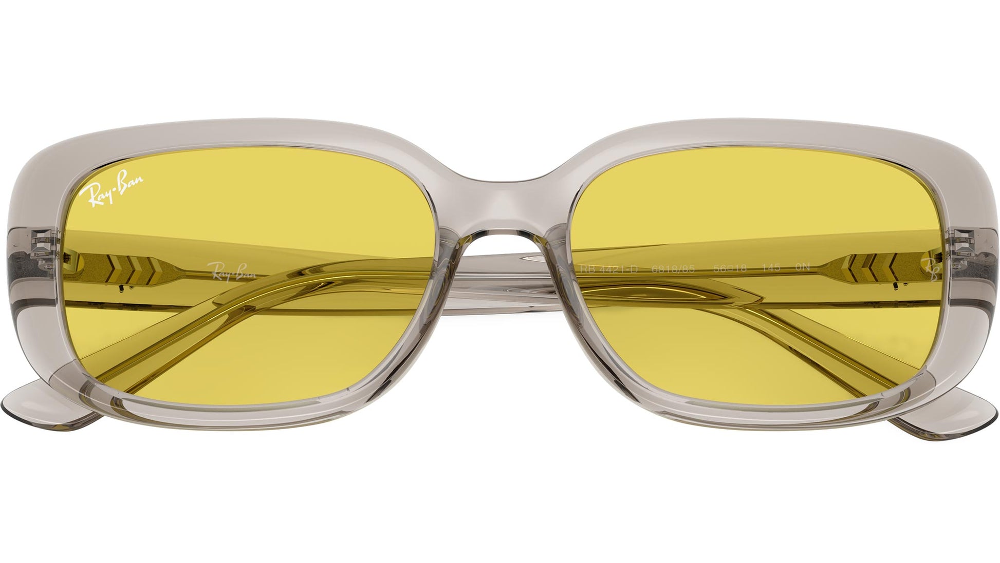 Ray-Ban RB4421D RB4421D 681885 sunglasses for men and woman, featuring transparent light beige d-frame injection frame and yellow bio polyamide lenses. Low bridge fit. Brand line: Nowness. Style code: 0RB4421D. Color code: 681885. Authorized Ray-Ban online reseller. Your glasses will include the original case and accessories and are covered by a 12-month global warranty.