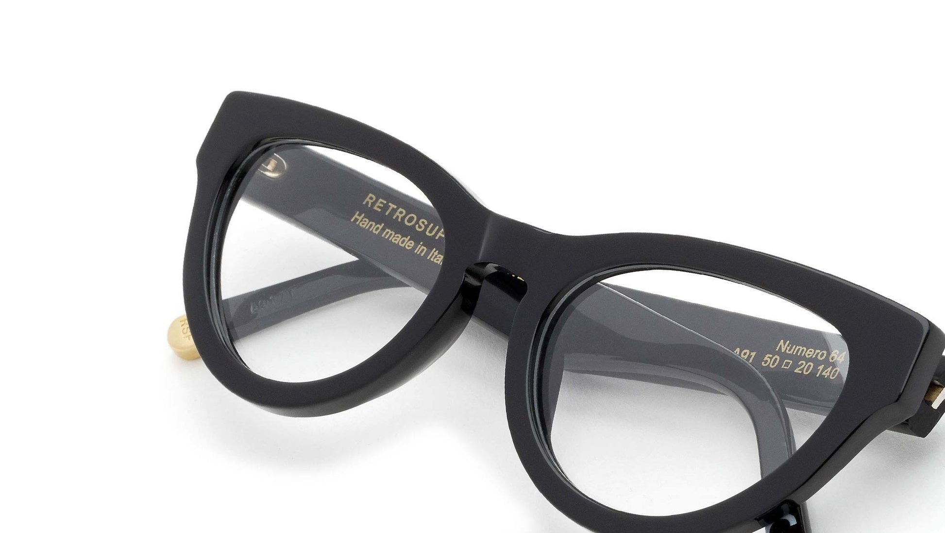 Numero 64 by Retrosuperfuture is an iconic cate-eye silhouette designed for the all-day optical statement. The model features a bold cat-eye design, with thick rims and wide rounded lenses. This version comes in a shiny black acetate. Prescription lenses not included. The box contains a hard case and a cleaning cloth