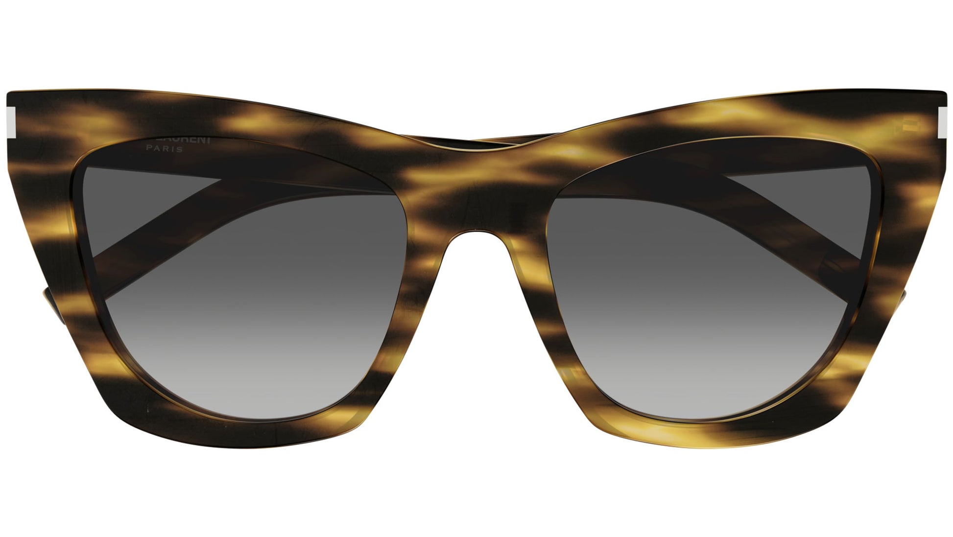 Saint Laurent sunglasses model SL 214 KATE from New Wave eyewear line, color code 024 shiny flamed havana acetate, cat eye frame shape with gradient grey lens.