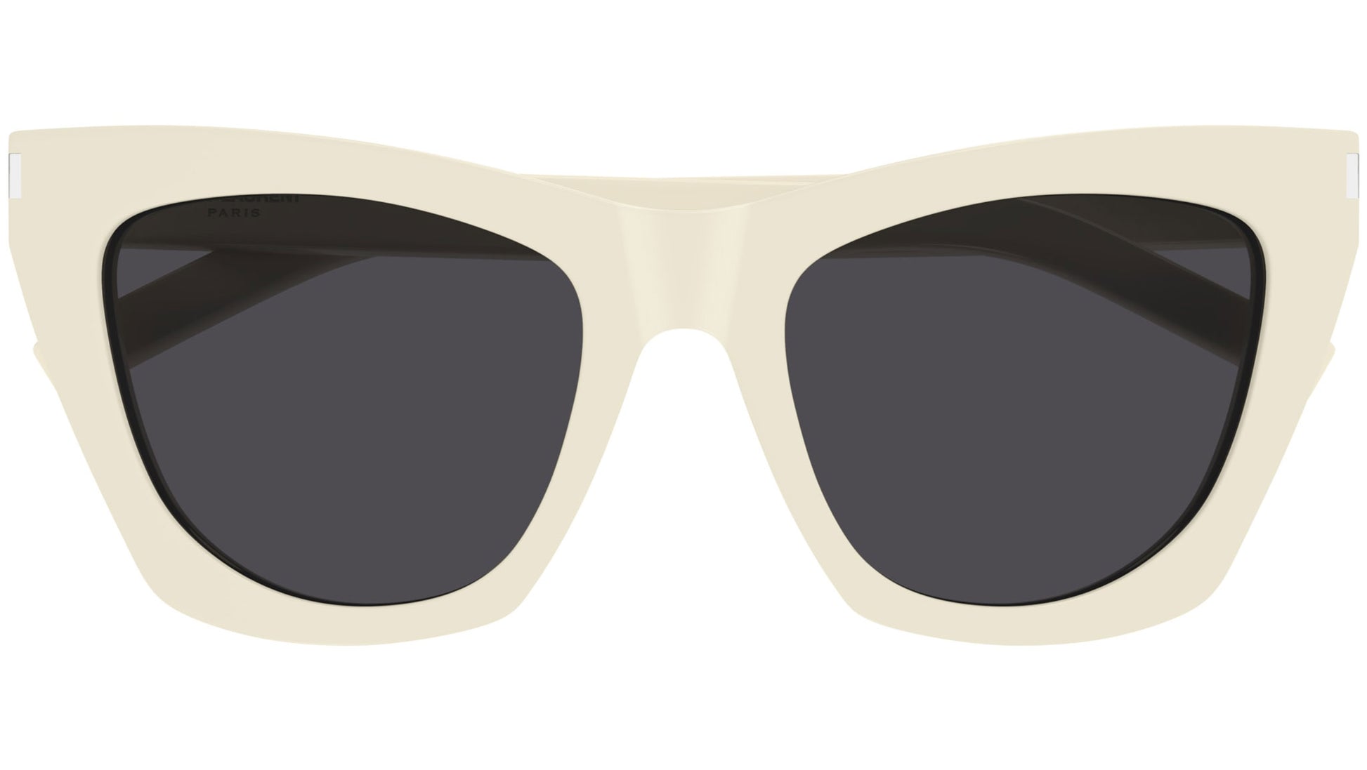 Saint Laurent SL 214 KATE 035 sunglasses for women, featuring shiny solid ivory cat eye acetate frame and solid black + AR black hole bio nylon lenses. Brand line: Corner Angle. Style code: SL 214 KATE. Color code: 035. Made in Italy. Authorized Saint Laurent online reseller. Your glasses will include the original case and accessories and are covered by a 12-month global warranty.