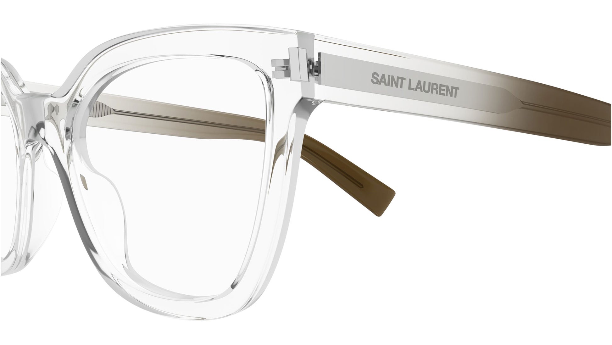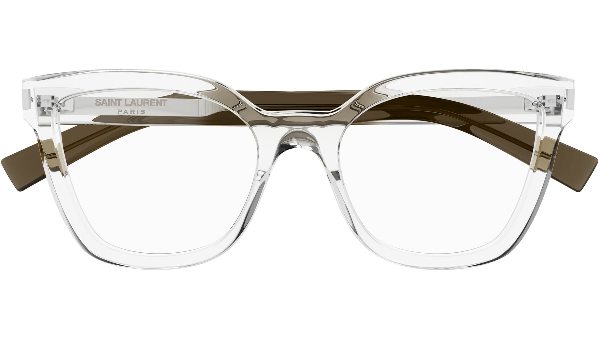 Saint Laurent SL 748 006 glasses for women, featuring shiny transparent crystal cat eye recycled acetate frame and demo lenses. Brand line: Corner Angle. Style code: SL 748. Color code: 006. Made in Japan. Authorized Saint Laurent online reseller. Your glasses will include the original case and accessories and are covered by a 12-month global warranty.