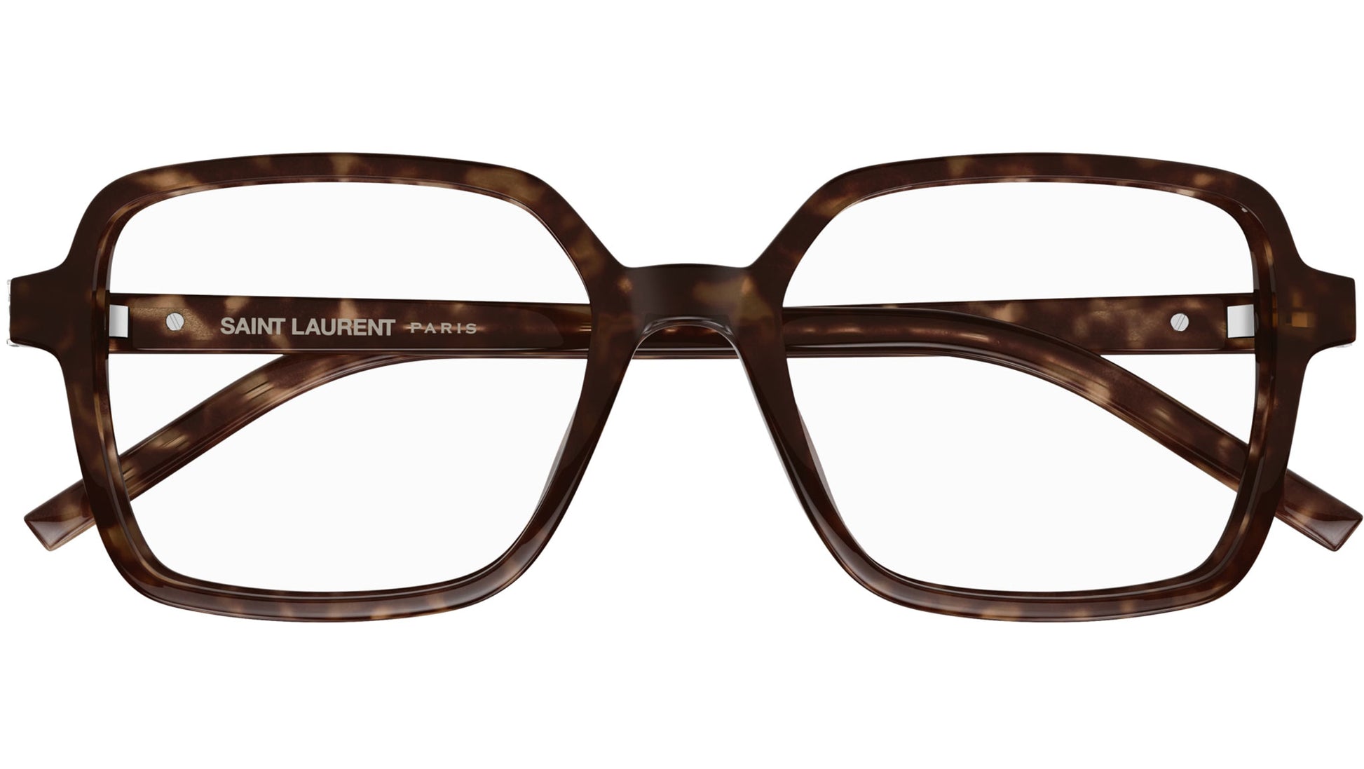 Saint Laurent SL M139 002 glasses for women, featuring shiny dark havana rectangular recycled acetate frame and demo lenses. Brand line: Monogram. Style code: SL M139. Color code: 002. Made in Italy. Authorized Saint Laurent online reseller. Your glasses will include the original case and accessories and are covered by a 12-month global warranty.