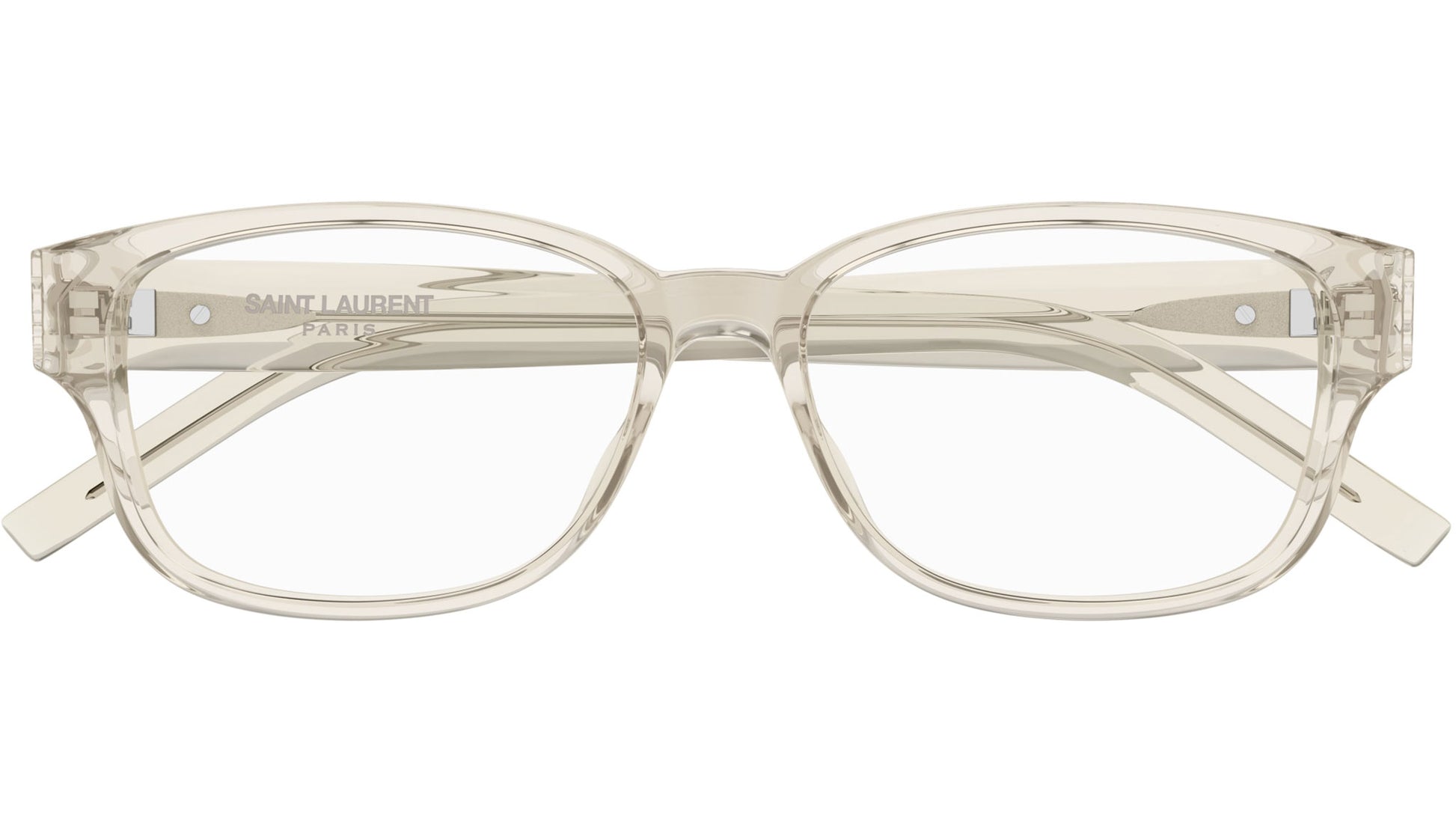 Saint Laurent SL M149 glasses for men and woman, featuring shiny transparent cream rectangular recycled acetate frame and demo lenses. Brand line: Monogram. Style code: SL M149. Color code: size 55: 008. Size 52: 009. Made in Italy. Authorized Saint Laurent online reseller. Your glasses will include the original case and accessories and are covered by a 12-month global warranty.