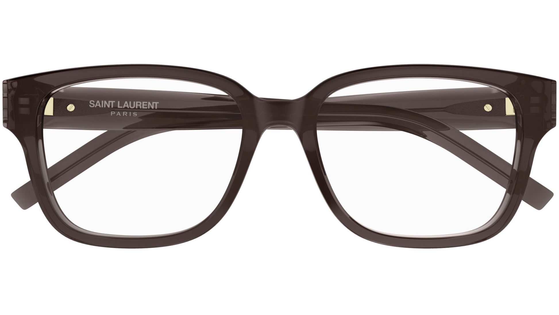 Saint Laurent SL M150 005 glasses for women, featuring shiny transparent taupe brown rectangular recycled acetate frame and demo lenses. Brand line: Monogram. Style code: SL M150. Color code: 005. Made in Italy. Authorized Saint Laurent online reseller. Your glasses will include the original case and accessories and are covered by a 12-month global warranty.