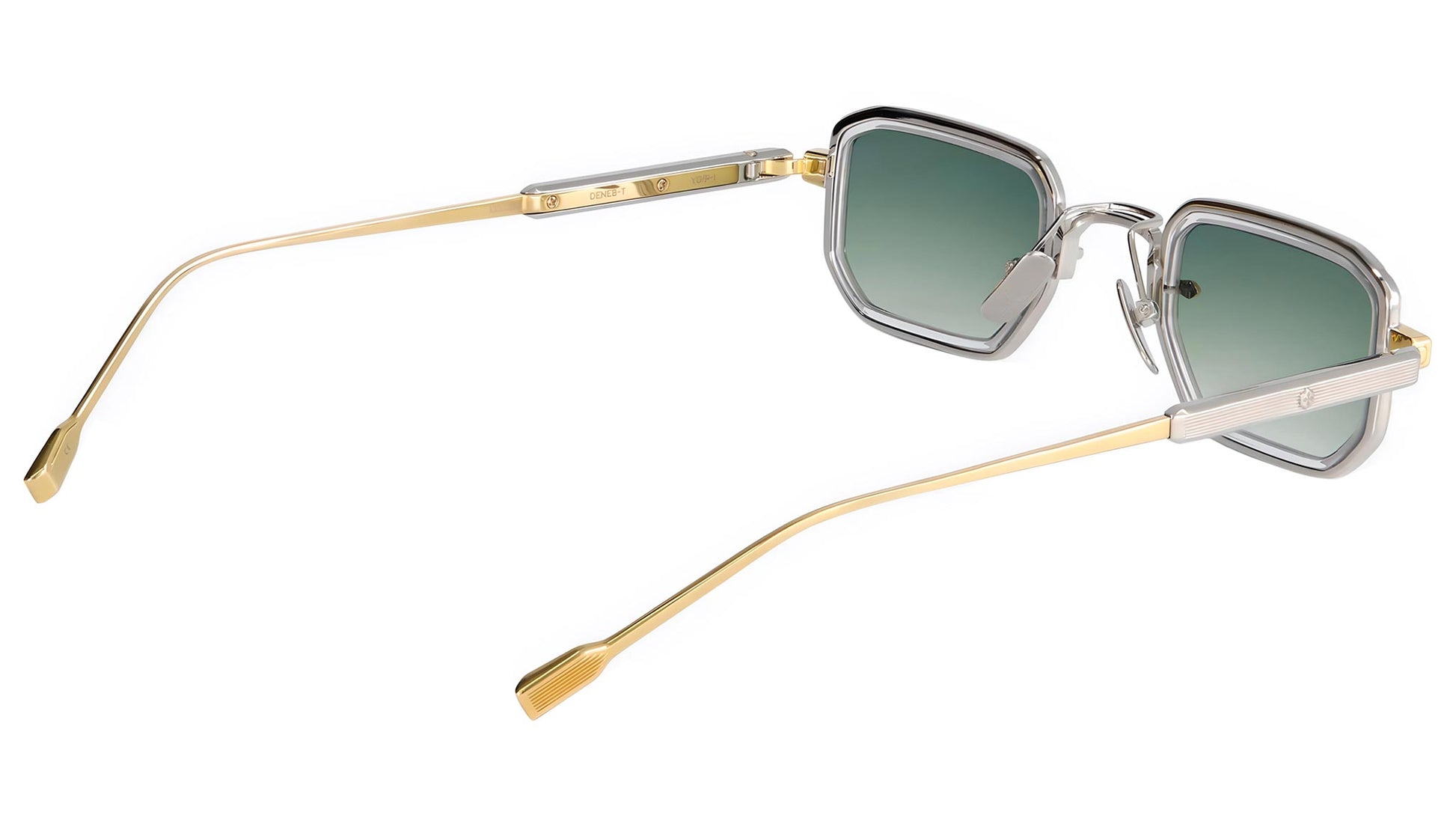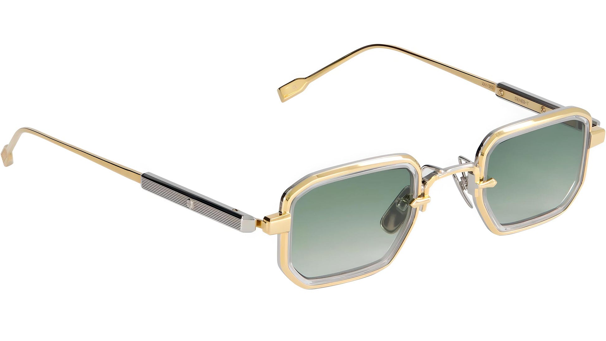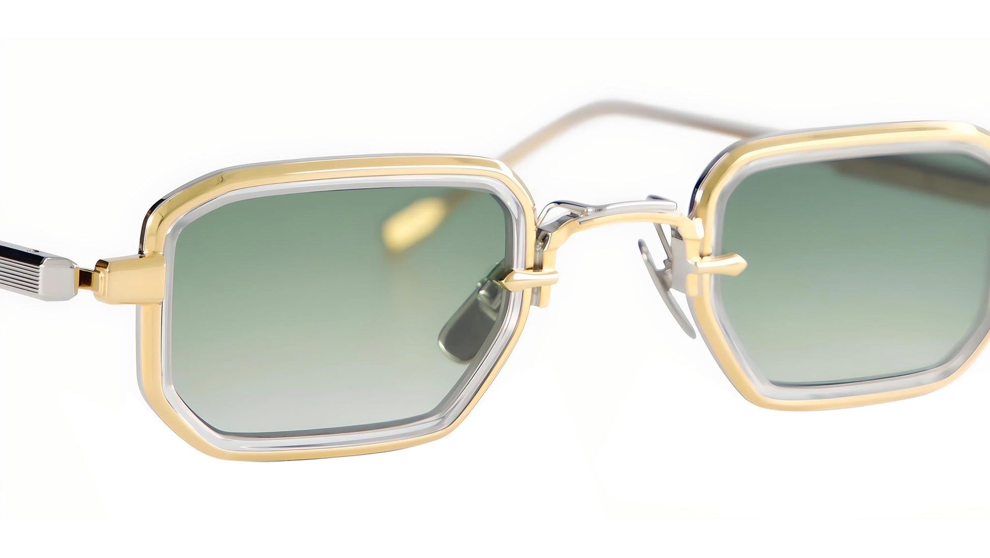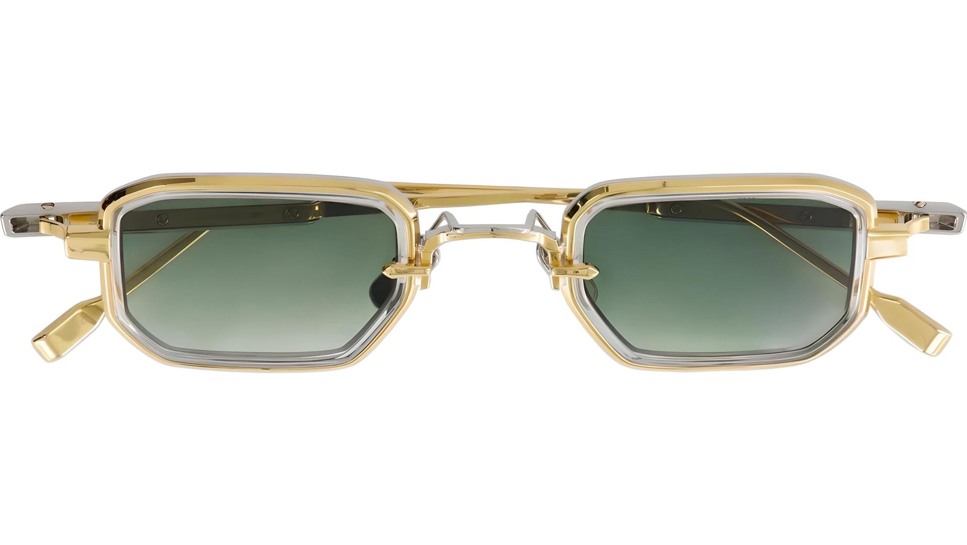 Sato Eyewear sunglasses model Deneb-T YG/P-1 featuring yellow gold and platinum Titanium with crystal takiron rim insert and gradient green lenses. Deneb-T gracefully embraces the past, infusing a sense of nostalgia that adds significant value to the present. This collection bridges the gap between eras, creating a more treasured and stylish present.