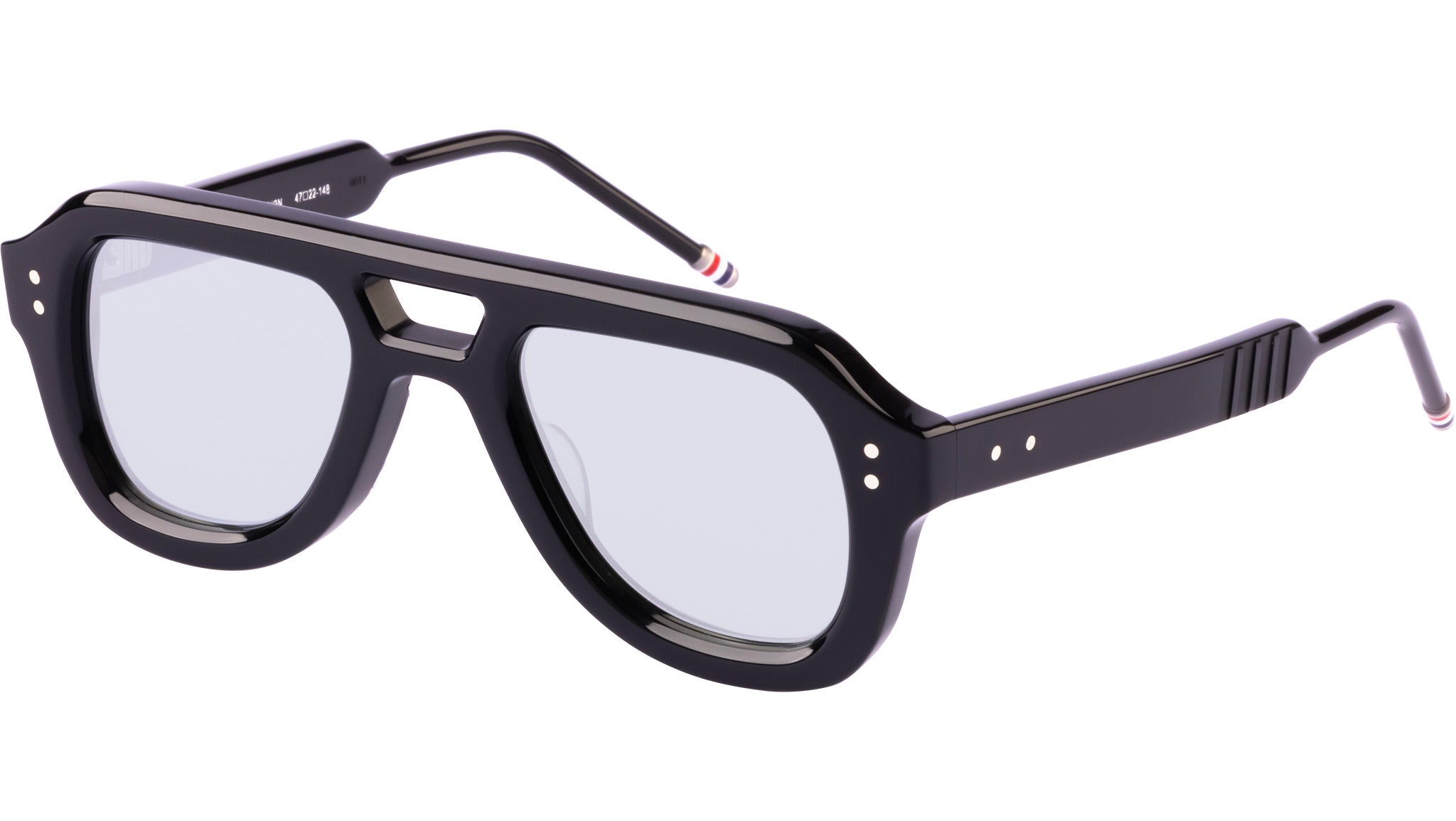 Thom Browne sunglasses model UES933A featuring black full-rim acetate frame and grey silver flash lenses. Rectangular shape. Signature 4-bar. Striped enamel temple tips. Eco-leather case. Made in Japan. Brand code: UES933A. Color code: 001. Authorised Thom Browne Online Reseller. Your glasses will include the original case and accessories and will be covered by a 12-month global warranty.