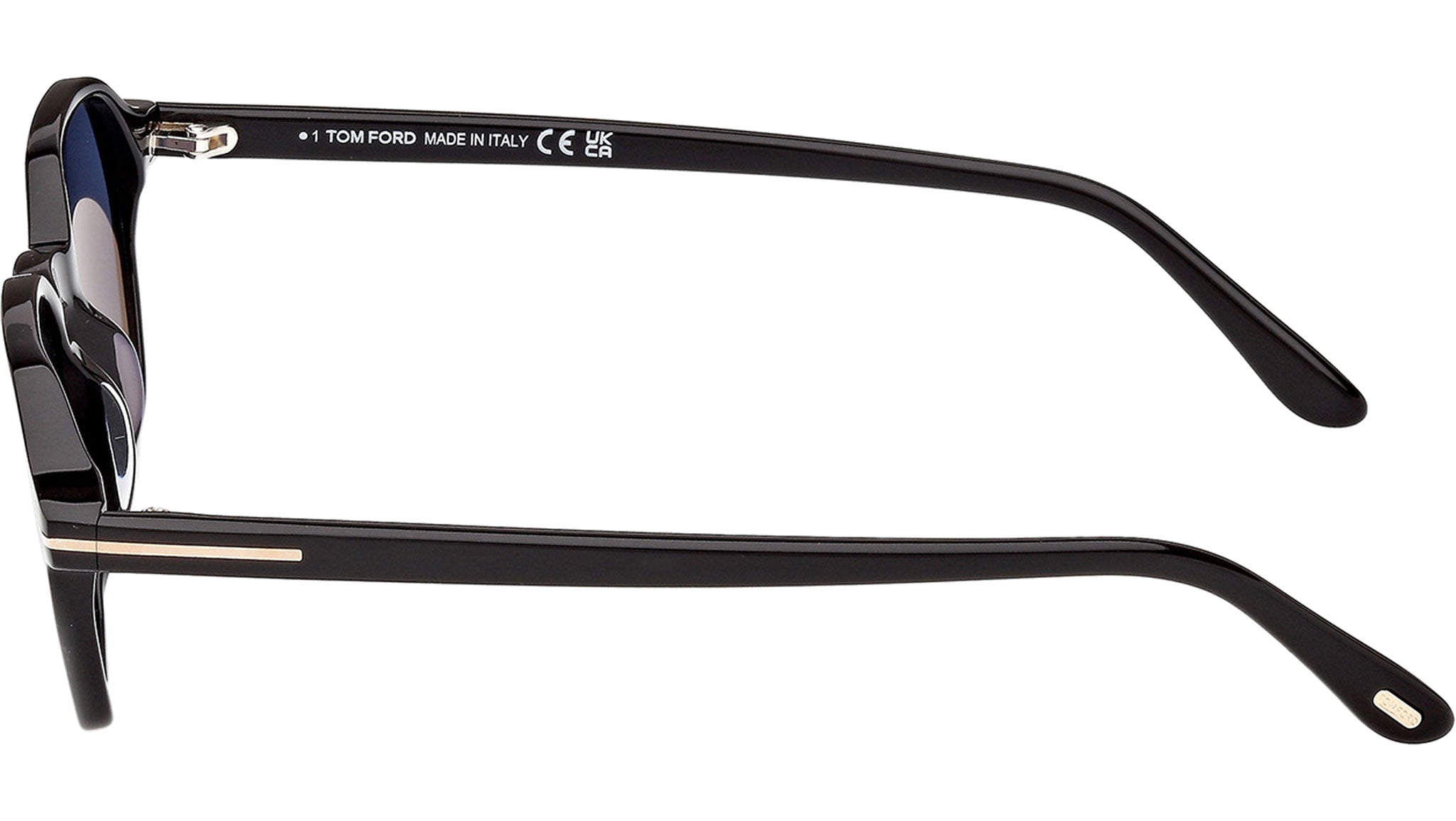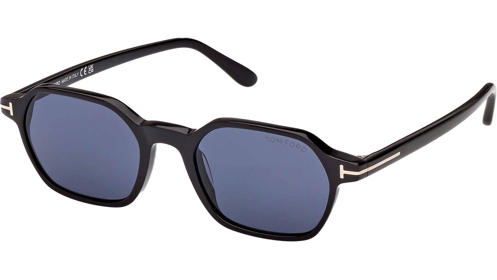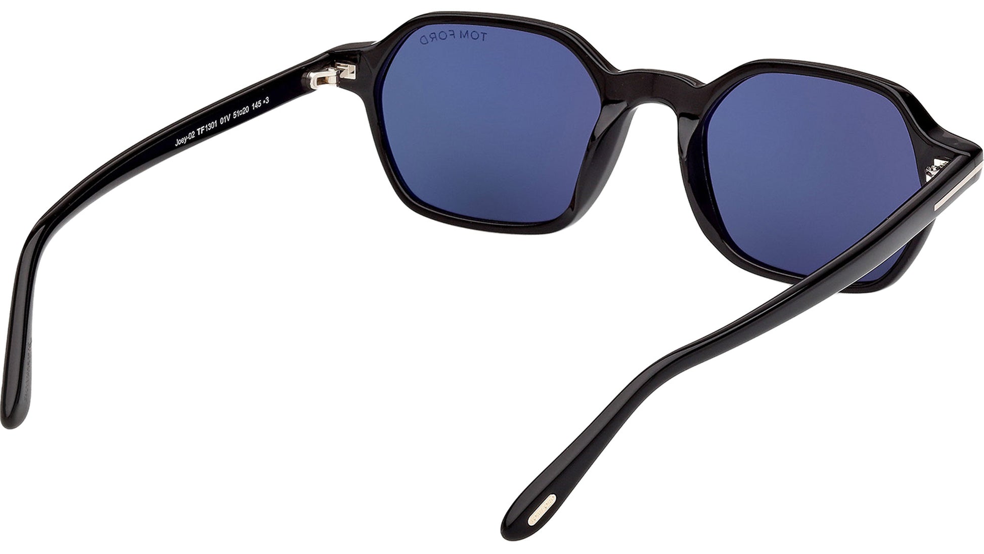 Tom Ford Joey-02 sunglasses for men model FT1301 featuring shiny black full-rim acetate frame and blue lenses. Brand code: 1301. Color code: 01V. Authorised Tom Ford Online Reseller. Your glasses will include the original case and accessories and will be covered by a 12-month global warranty.