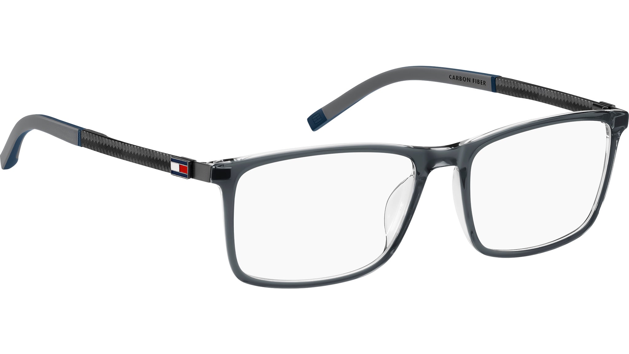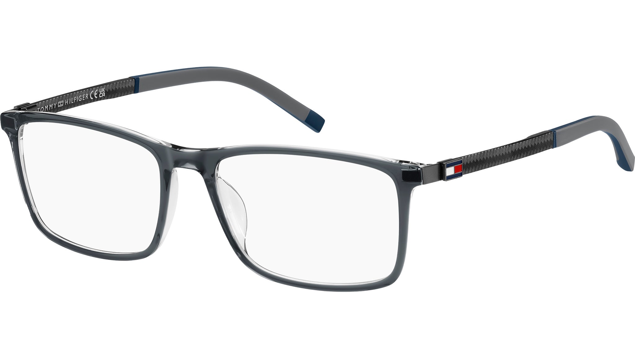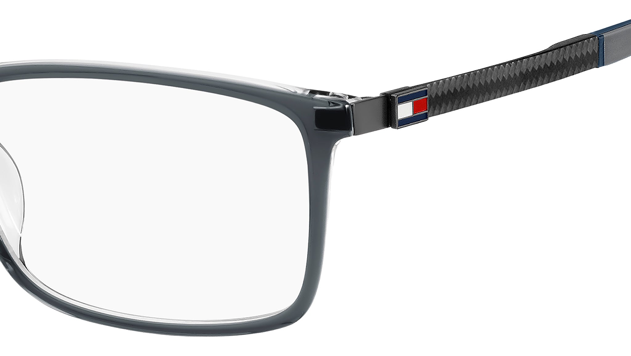 Tommy Hilfiger TH 2141 KB7 glasses featuring grey rectangular acetate frame and demo lenses. These Tommy Hilfiger eyeglasses combine sporty style and advanced design. Their premium quality can be seen in the temples: made from lightweight carbon fibre, they are decorated by the famous Polo Pique texture inspired by polo shirts, and soft rubber end tips. The lightweight acetate frames are stable and secure. The colour palette is classic and masculine, and a monochromatic Tommy Hilfiger flag decorates the temples. Available in two lens sizes. Brand line: Sporty. Style code: 108895. Color code: KB7. Authorized Tommy Hilfiger online reseller. Your glasses will include the original case and accessories and are covered by a 12-month global warranty.
