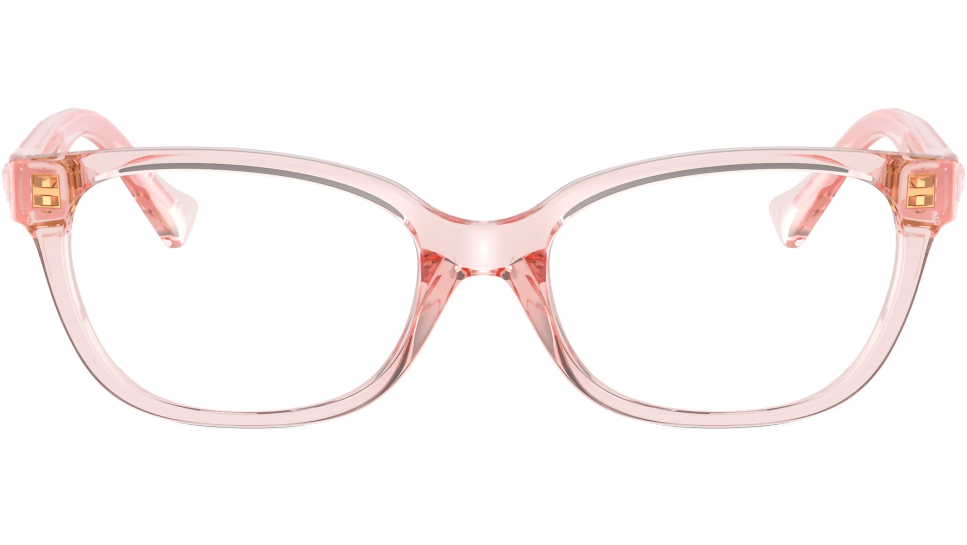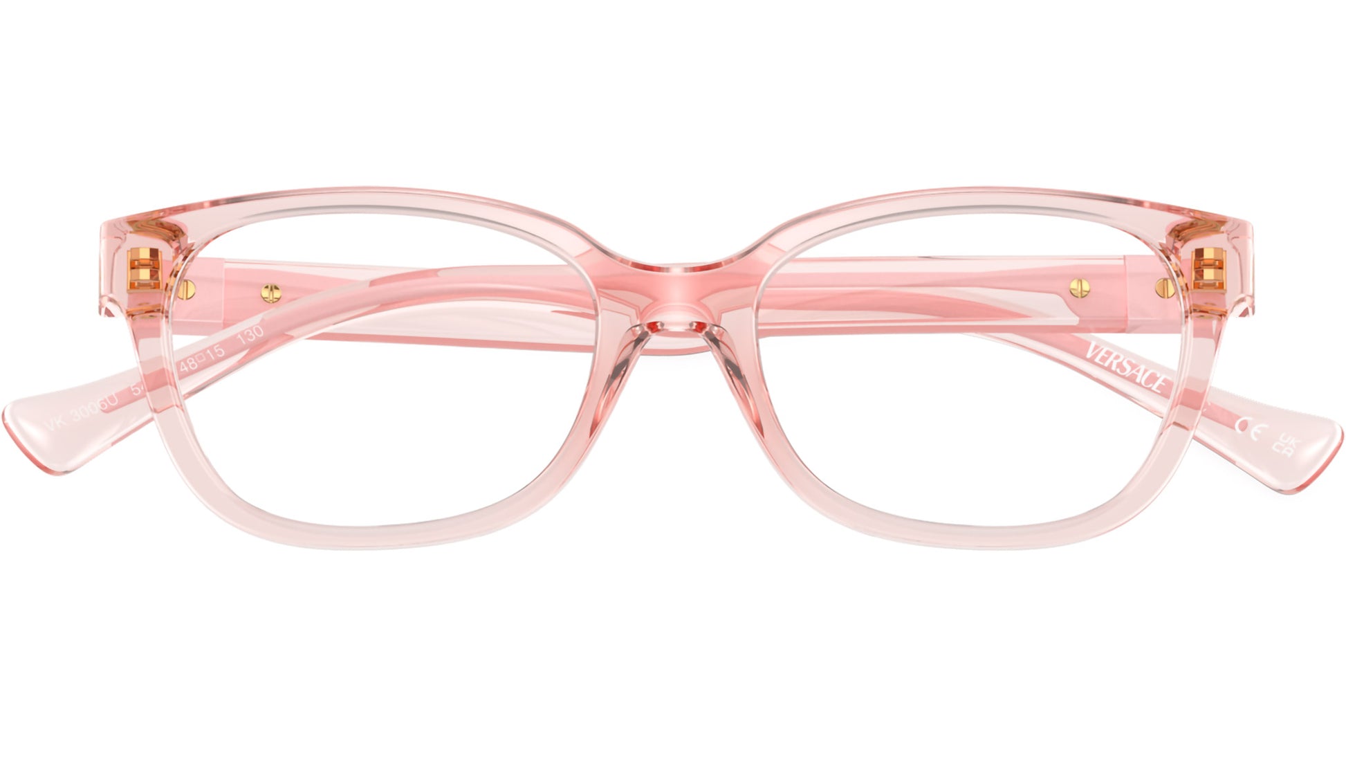 Versace Kids optical frame model 3006U featuring pastel pink transparent full rim injection frame and base 4 demo lens. Universal fit. Frame line: Kids. Brand code: 0VK3006U. Color code: 5481. Authorised Versace Eyewear Online Reseller. Your glasses will come including the original case and accessories and will be covered by 12 month global warranty.