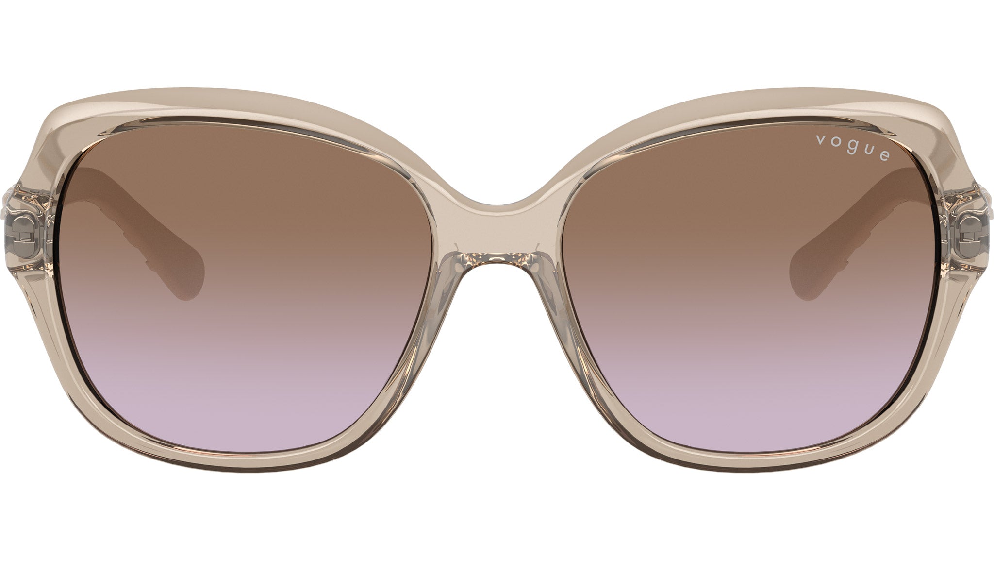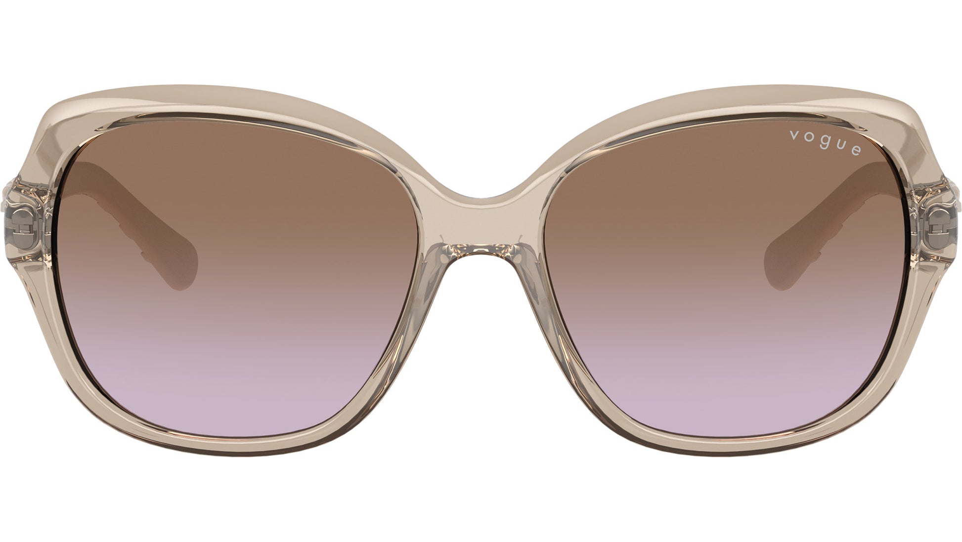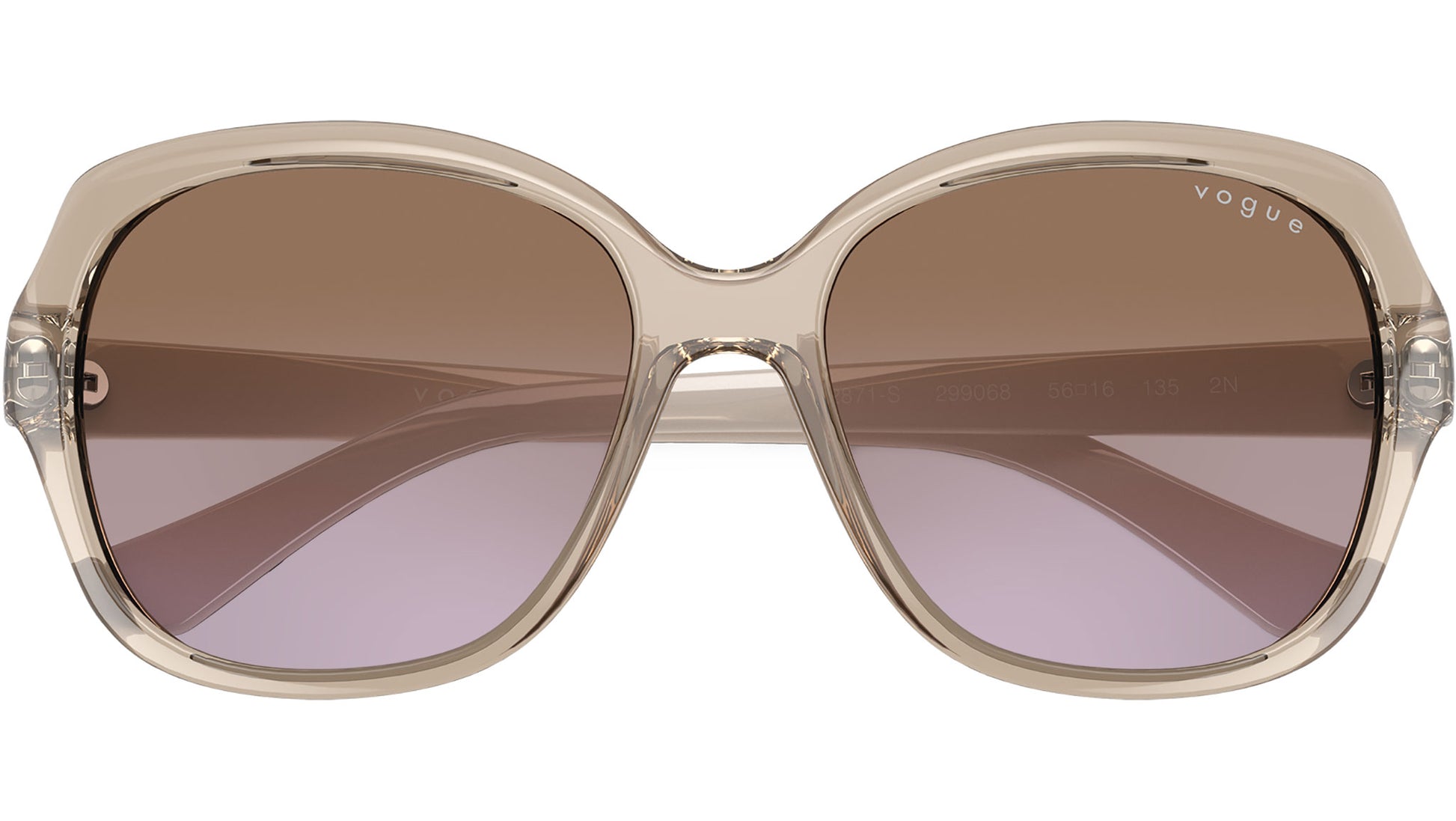 Vogue sunglasses for women model VO2871S 299068 featuring transparent light brown injection frame and violet gradient brown base 6 decentered polycarbonate lenses. High bridge fit. Frame line: Evergreen. Brand code: 0VO2871S. Color code: 299068. Authorised Vogue Eyewear Online Reseller. Your glasses will come including the original case and accessories and will be covered by 12 month global warranty.