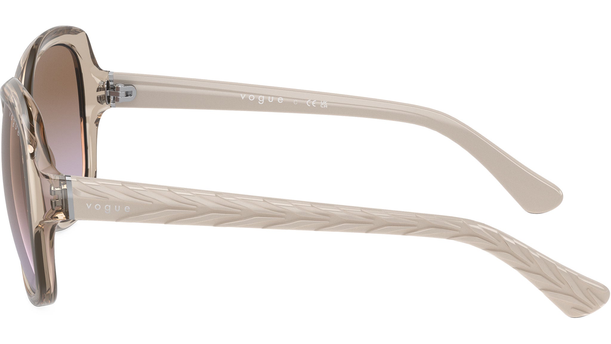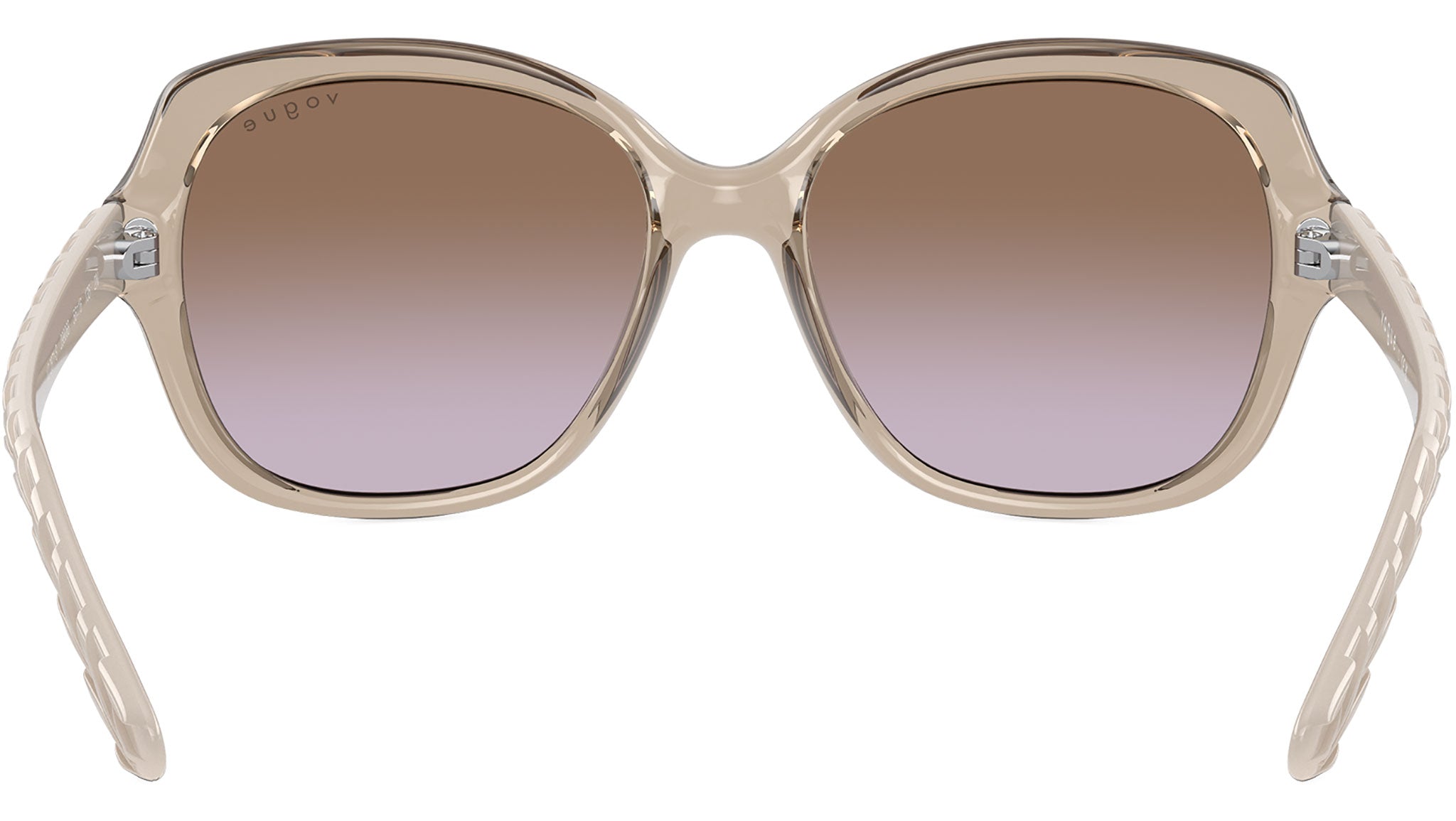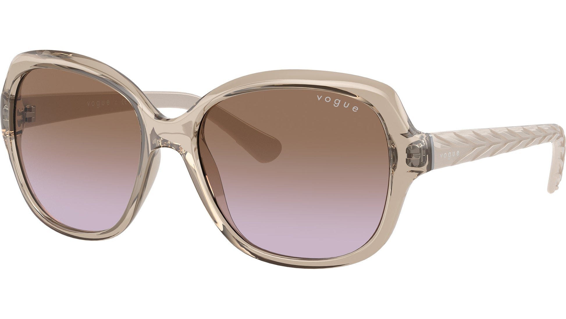 Vogue sunglasses for women model VO2871S 299068 featuring transparent light brown injection frame and violet gradient brown base 6 decentered polycarbonate lenses. High bridge fit. Frame line: Evergreen. Brand code: 0VO2871S. Color code: 299068. Authorised Vogue Eyewear Online Reseller. Your glasses will come including the original case and accessories and will be covered by 12 month global warranty.