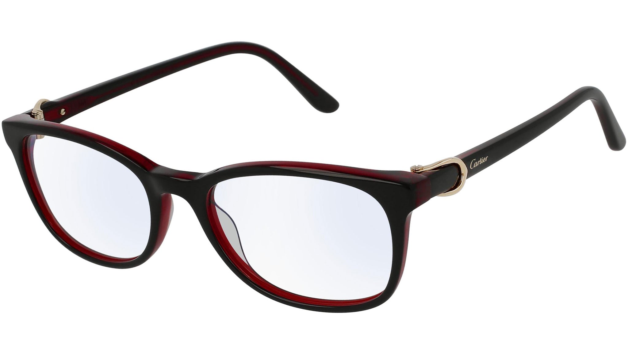 Cartier Initiation optical collection model CT0008O 001 featuring shiny bilayer black / red frame and black temple.