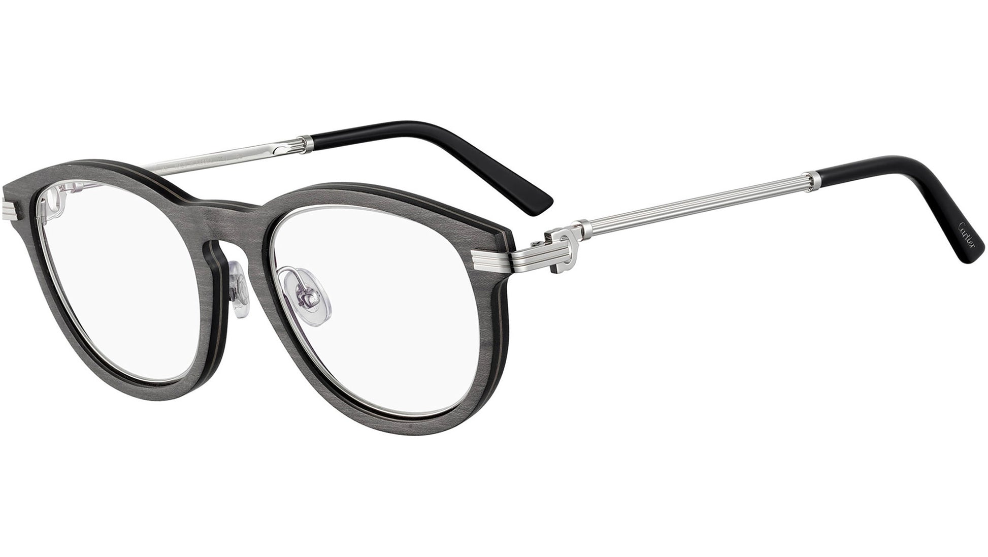 Cartier Exception optical collection model CT0054O 001 featuring grey frame and silver temple.