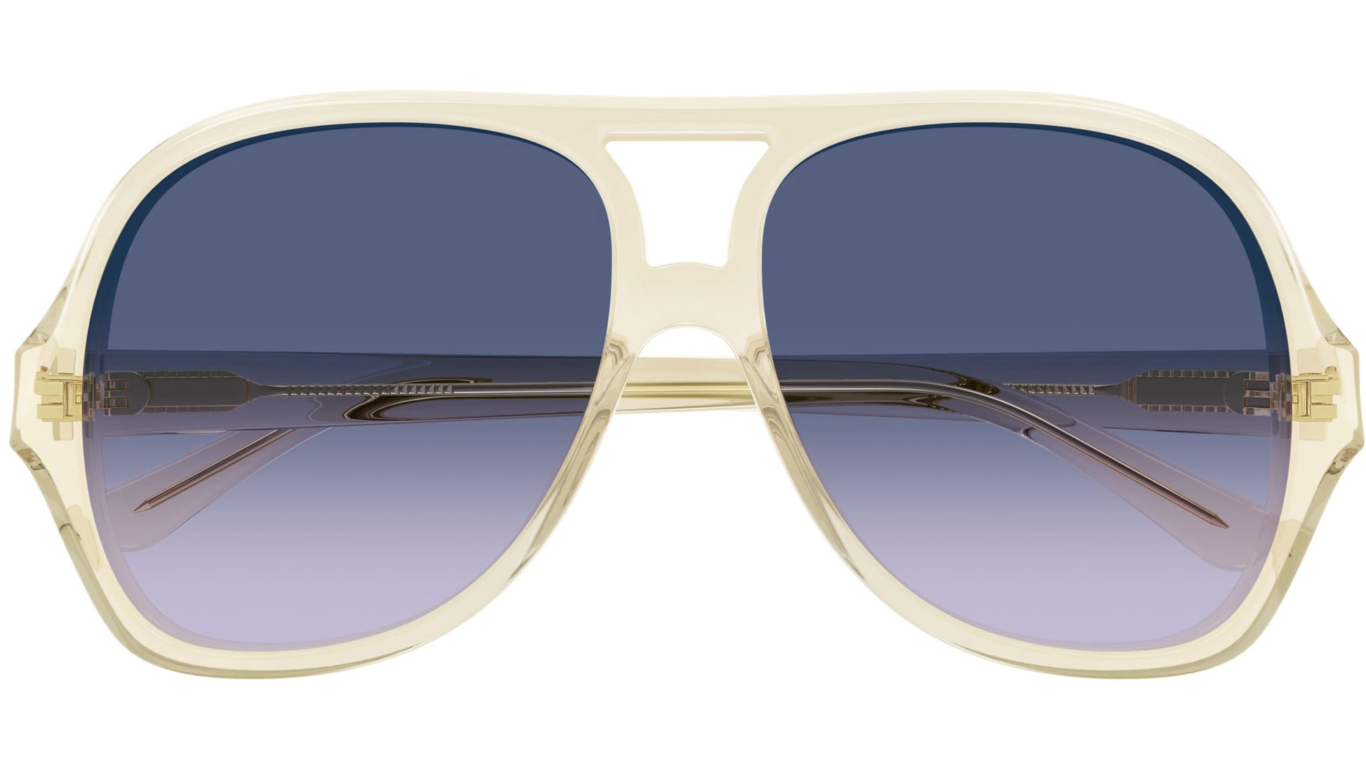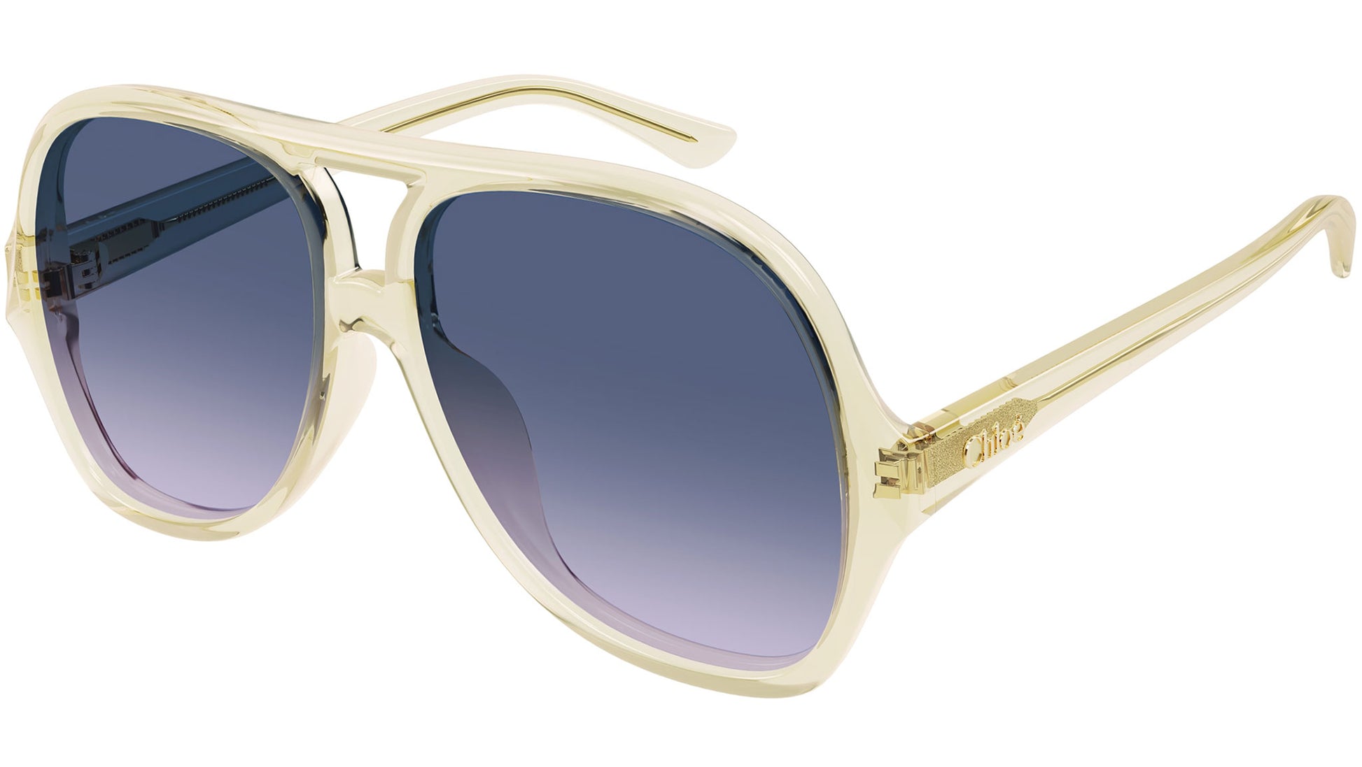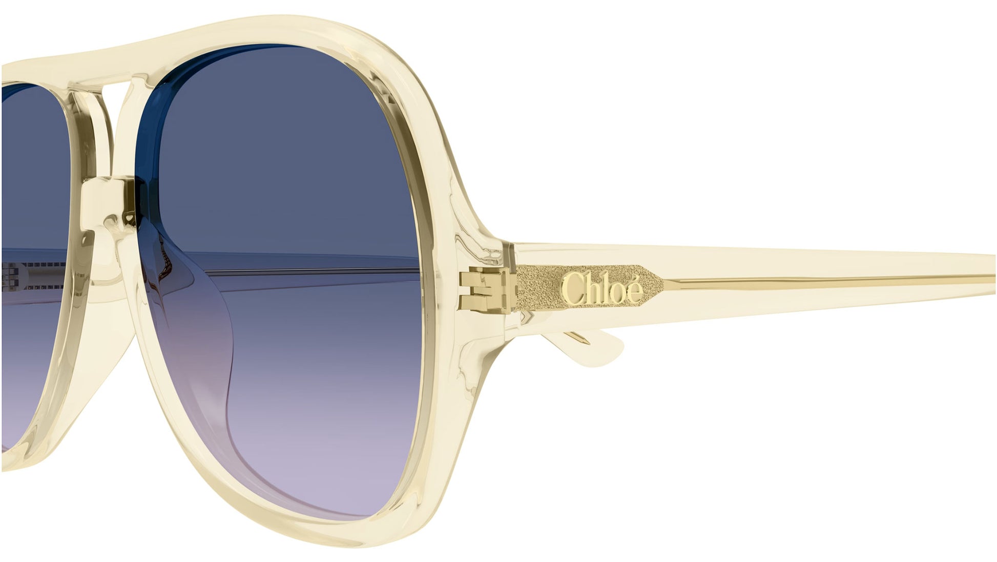 Chloé CH0289S 004 solglasögon för kvinnor, med glänsande transparent ljusgul pilot-återvunnet acetatbåge och dubbelgradient blå/lila bionylonlinser. Märkeslinje: Chloé. Stilkod: CH0289S. Färgkod: 004. Tillverkad i Italien. Auktoriserad Chloé online-återförsäljare. Dina glasögon kommer att innehålla originalfodralet och tillbehören och täcks av en 12-månaders global garanti.