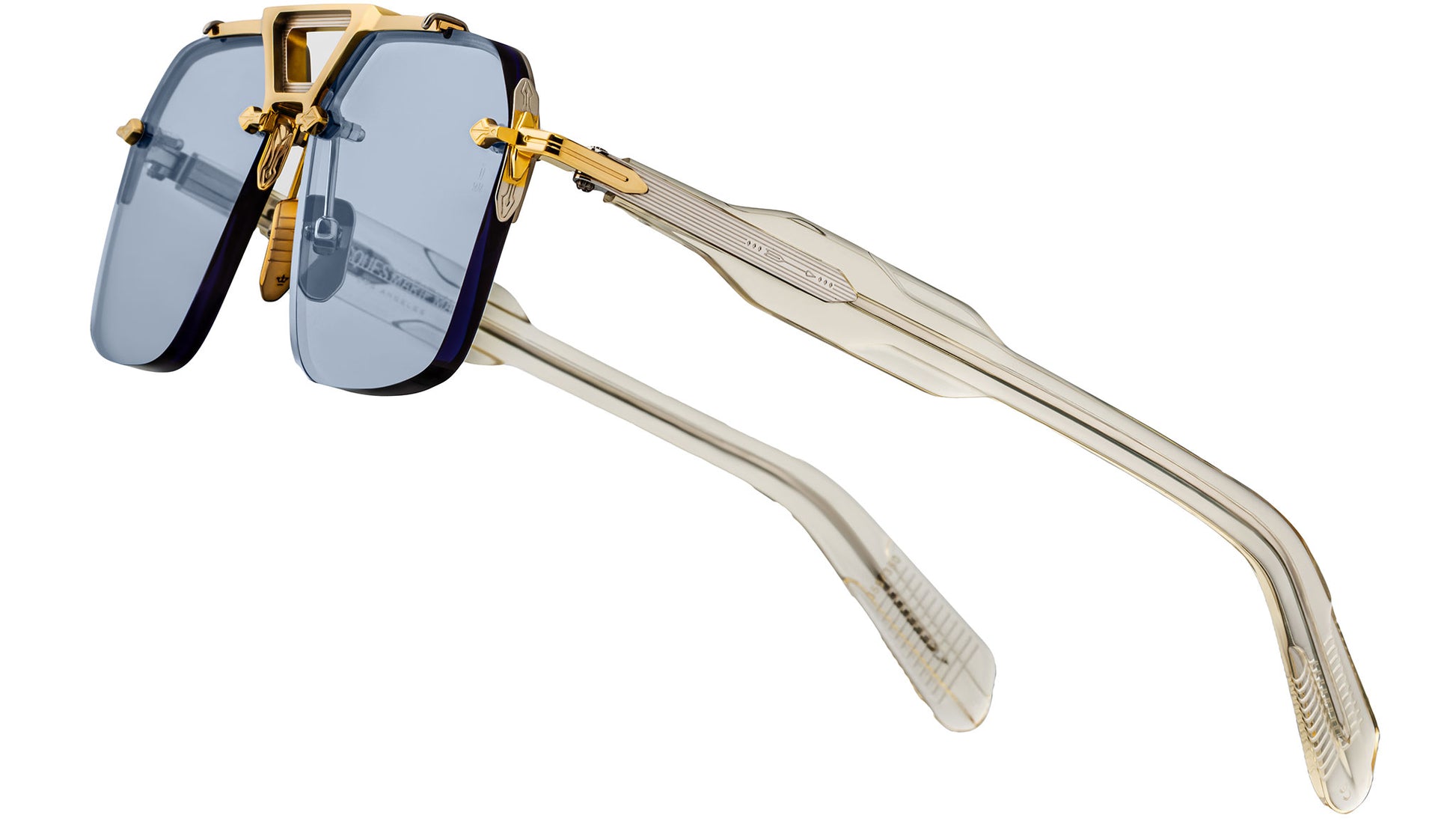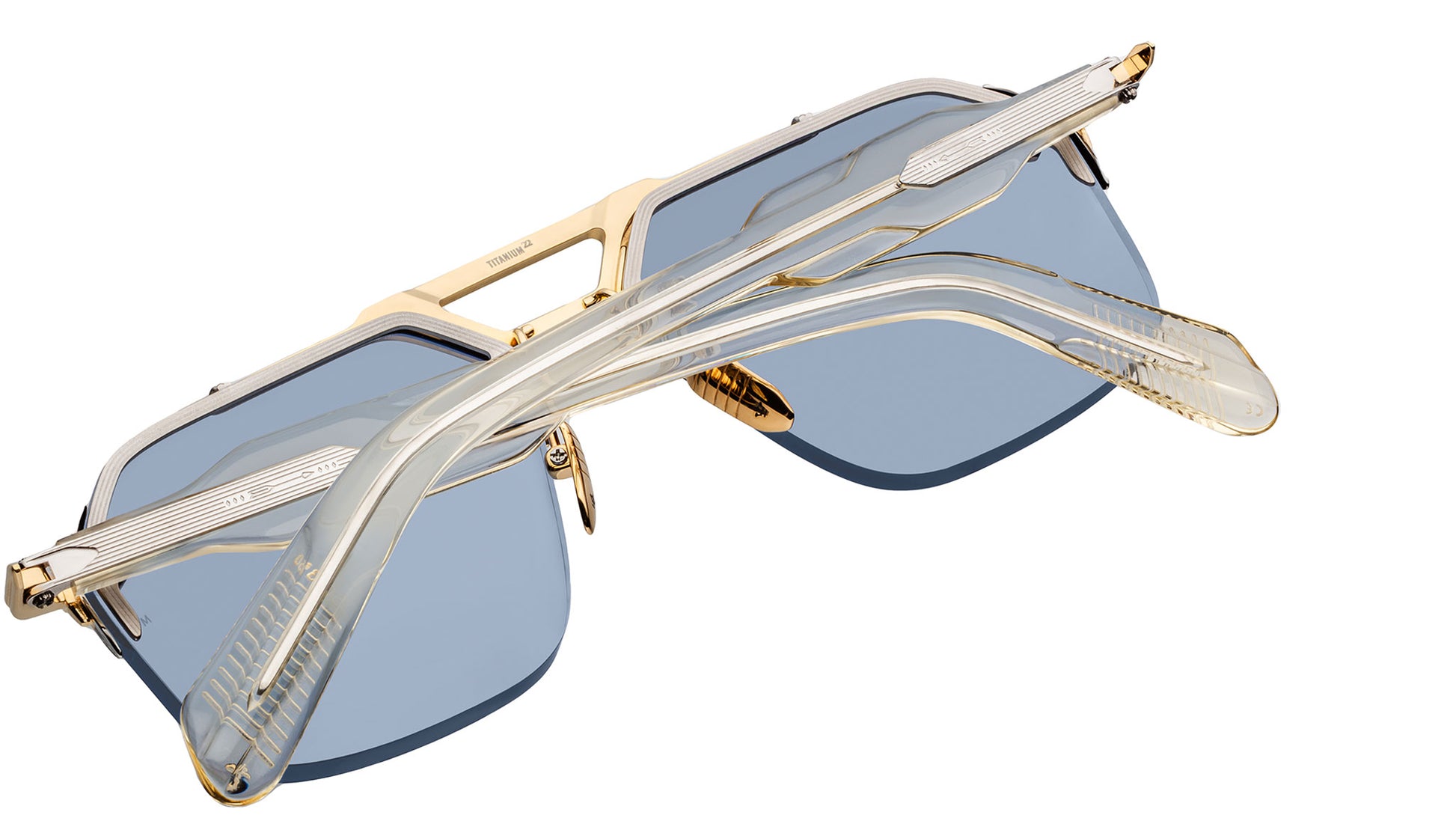 Gold 100% beta titanium frame with silver accents, crystal cured cellulose acetate temples, and blue lenses. Custom gold block hinge, gold bridge with silver accents, yellow crystal acetate temple, custom nose pads with logo and hairline engraving, baby blue CR-39 2-base lenses with backside anti-reflective treatment.