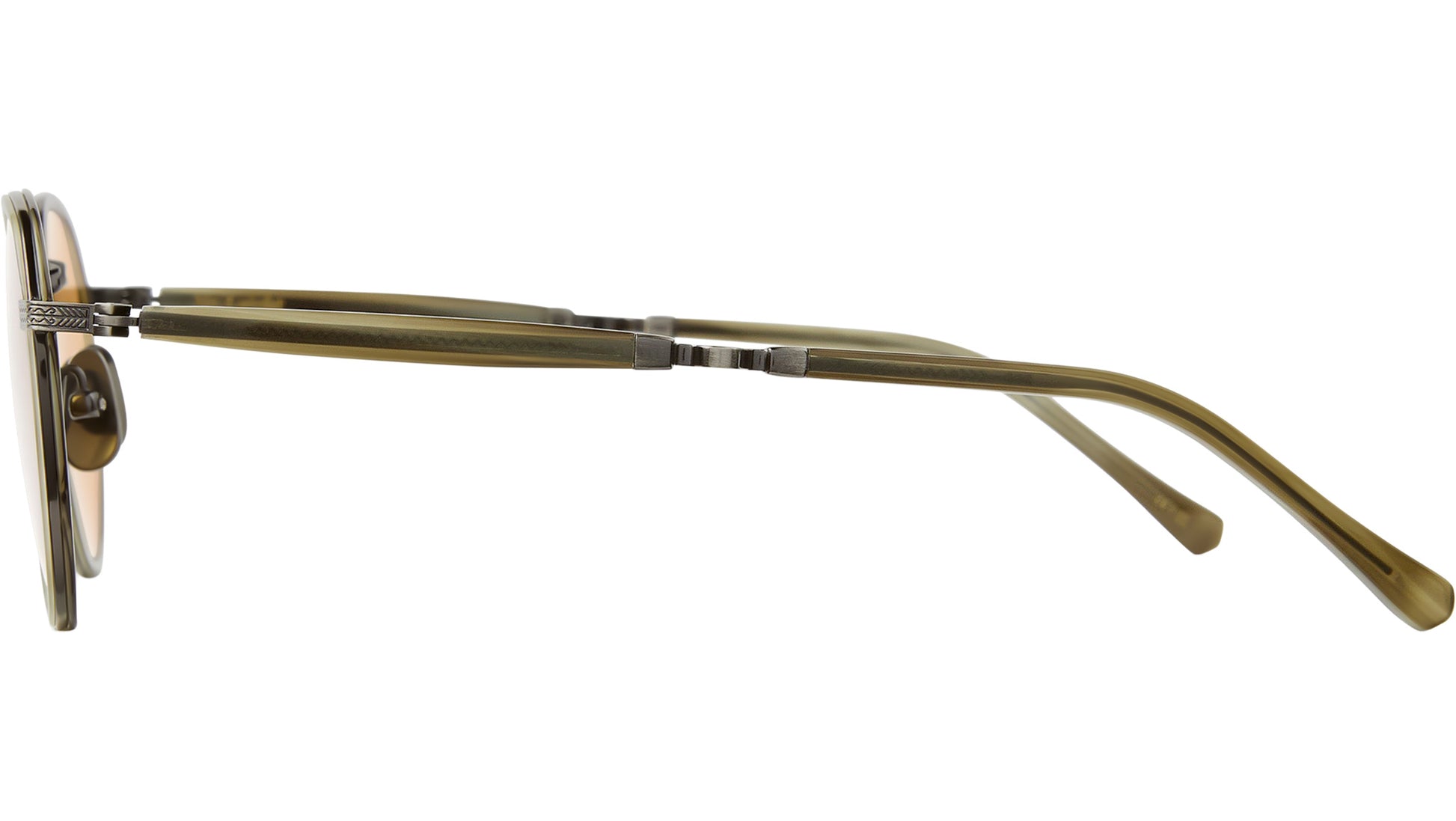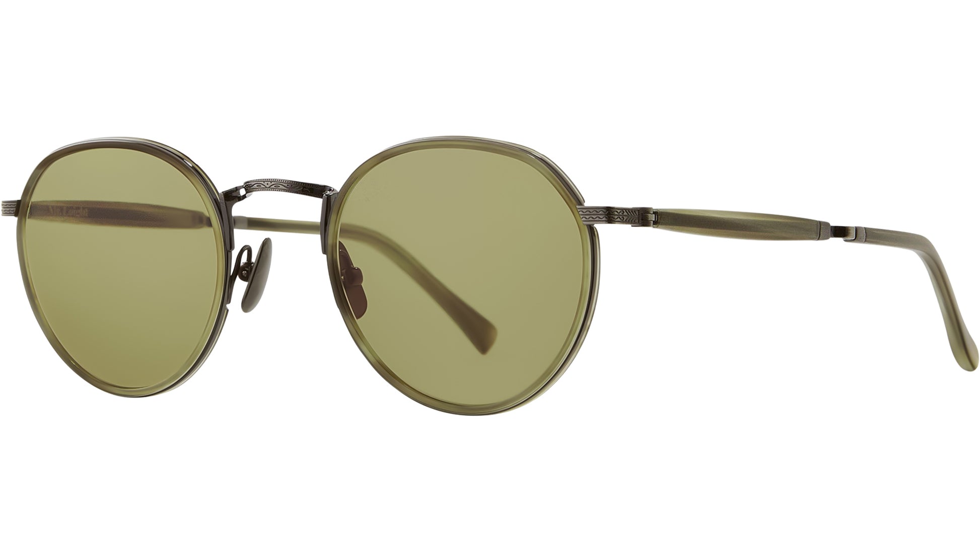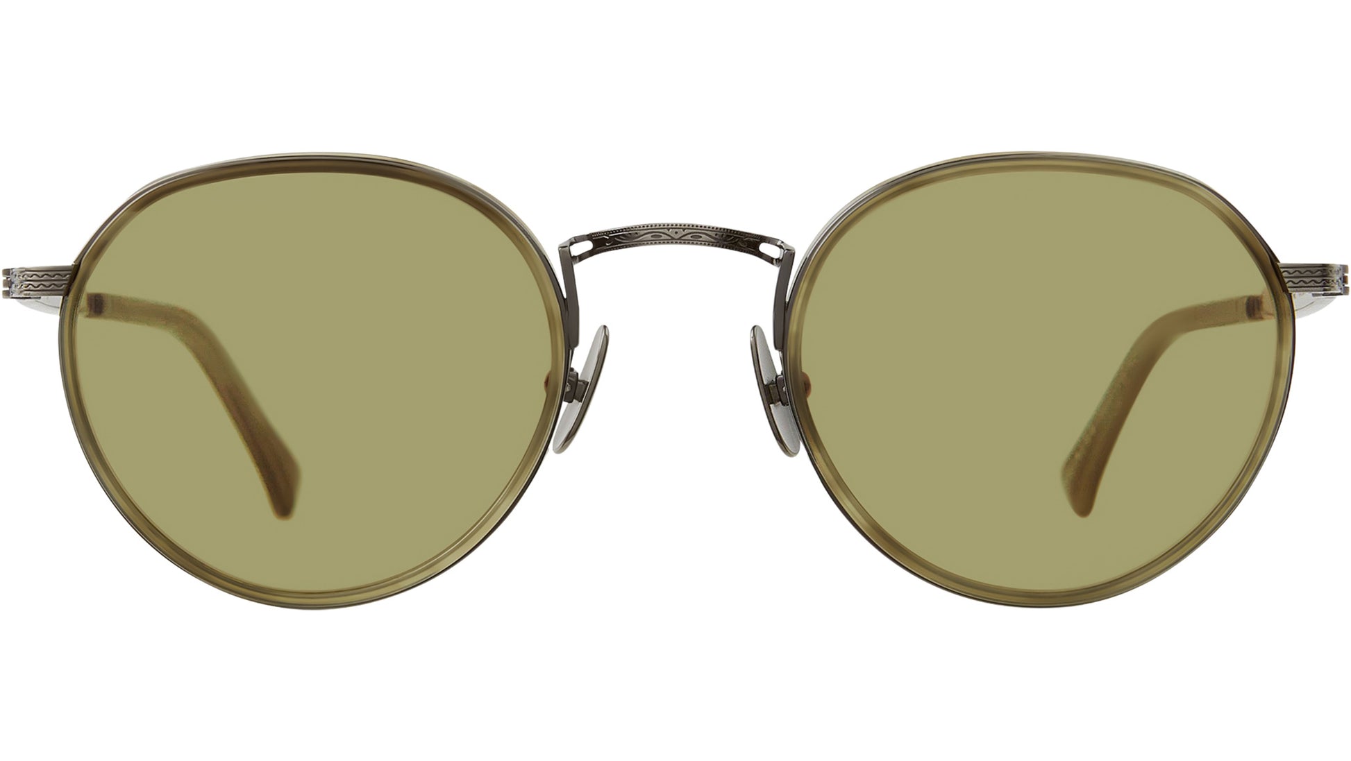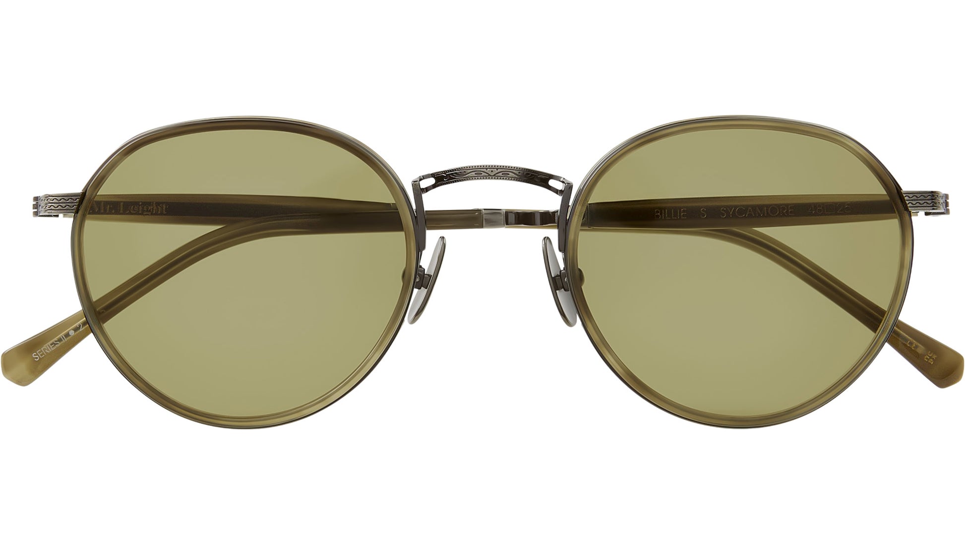 Mr. Leight Billie S sunglasses featuring sycamore / pewter round acetate-titanium frame and olive lenses. The Billie frame features a refined silhouette that enhances everyday ensembles for the modern casual aesthetic. Its mixed-material construction delivers a distinctive tactile quality, highlighted by a titanium eye wire with intricate filigree detailing along the bridge, temple, and end pieces. The addition of premium acetate inserts and temples introduces vibrant color accents. Crafted in Japan, this eyewear boasts optical quality CR-39 lenses, titanium temples with acetate tips, and a titanium bridge alongside nose pads for added comfort. A custom Art Deco core wire filigree enriches the design, while the 4 base lenses are equipped with a backside anti-reflective coating and provide 100% UV protection. Suitable for unisex wear, this frame combines elegance with functionality. Style code: ML4018. Color code: SYC-PW/OLV. Authorized Mr. Leight online reseller. Your glasses will include the original case and accessories and are covered by a 12-month global warranty.