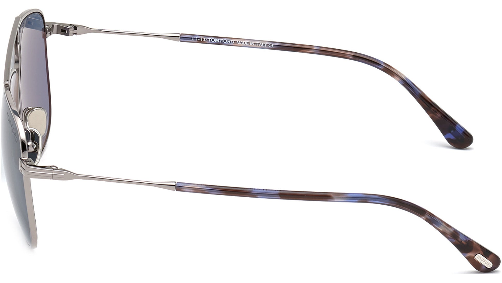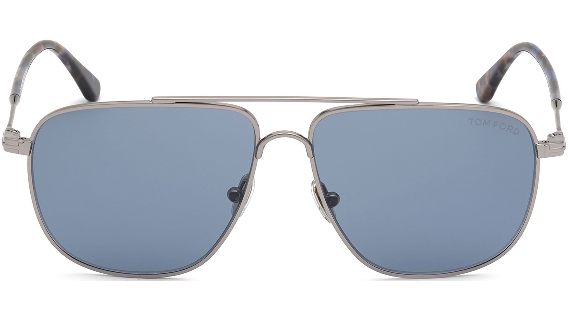 Tom Ford Len sunglasses model FT0815 14V featuring shiny ruthenium grey frame and blue lens.